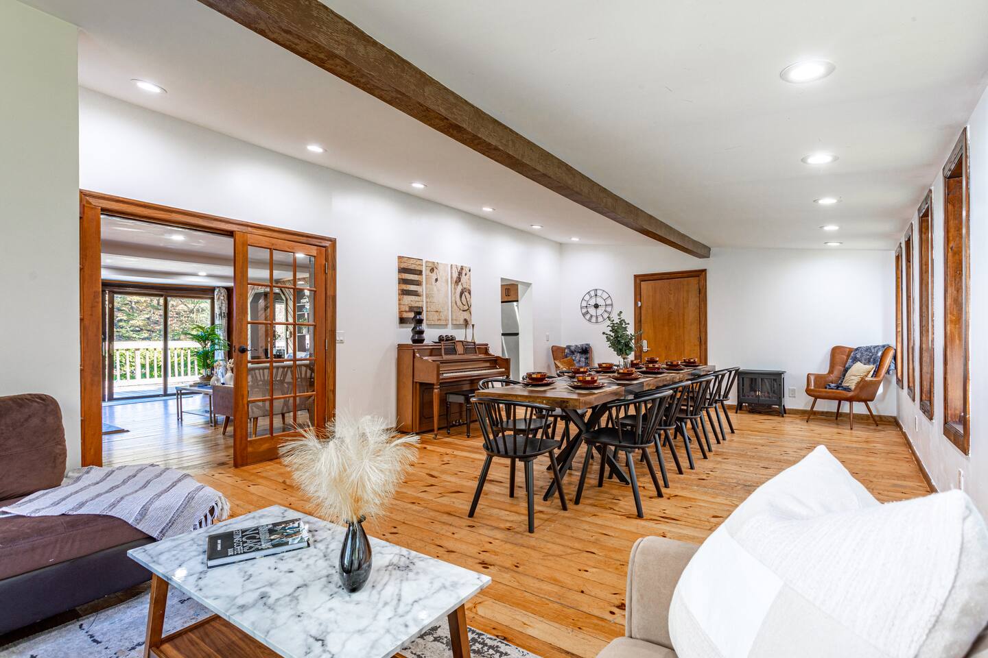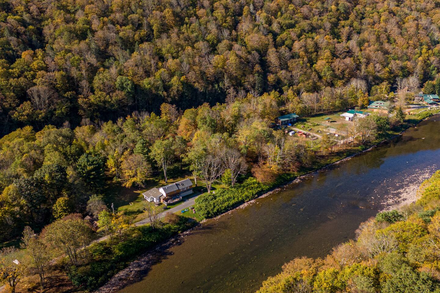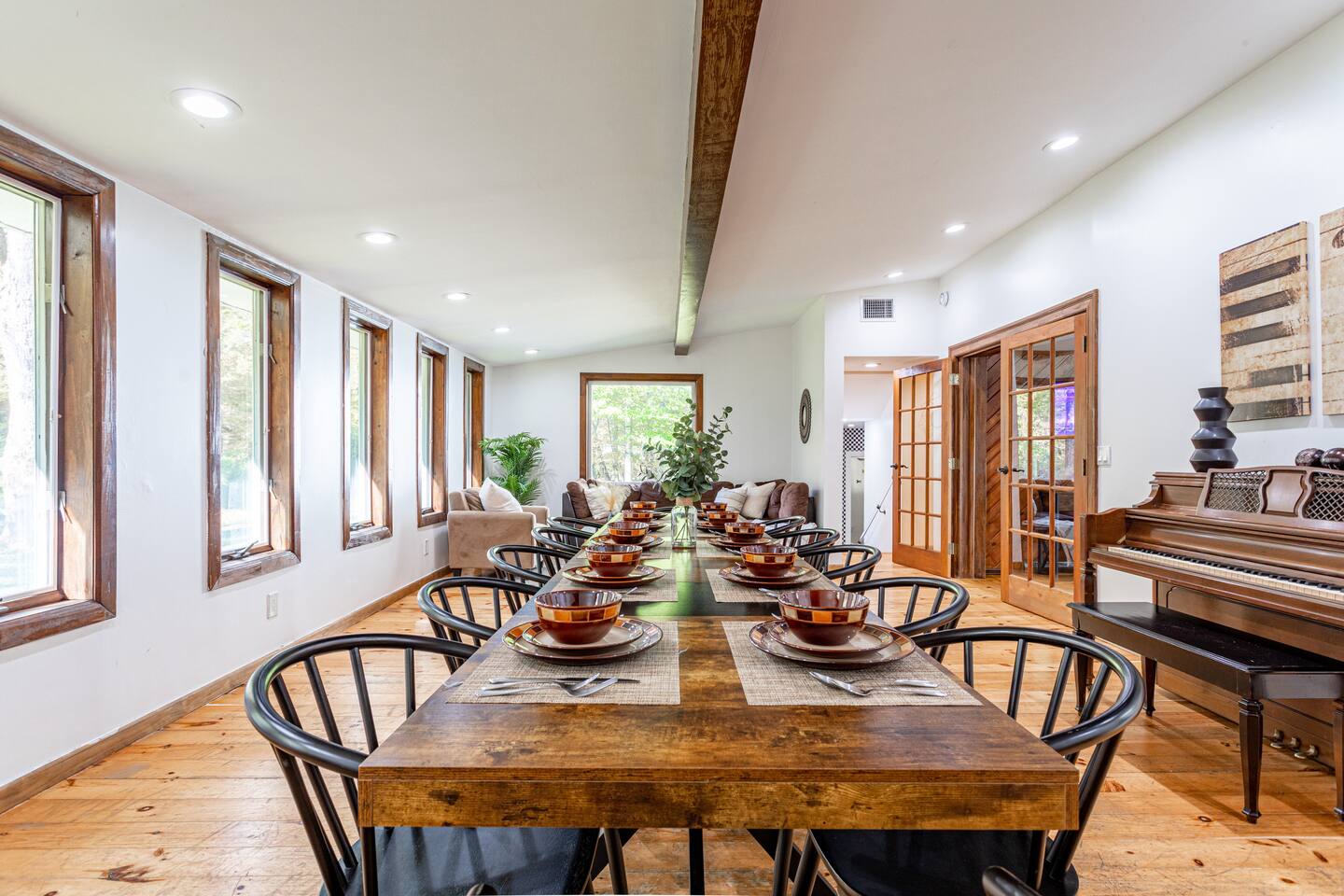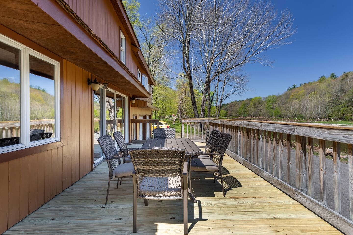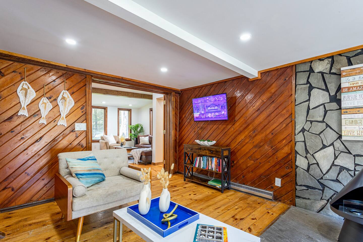 This completely private house is perfect for nature lovers. You’ll feel the serenity as you drive down the private gravel road toward the property. Enjoy the beautiful river across the driveway and catch a glimpse of the local wildlife. Snuggle up on the couch facing the fireplace in the winter as you watch the snow falling quietly around you through the wall of windows. In the summertime, stretch out and watch the stars break through the sky on the expanded deck. Enjoy the telescope, already set up on a tripod, for an authentic stargazing experience. Unwind in the evening with a cinematic experience in the home's private theater. Snuggle up in the plush, massage-enabled electric recliners and indulge in freshly popped popcorn, courtesy of the theater's convenient popcorn maker. This renovated home features 8 bedrooms with stunning river or forest views. 3 of the bedrooms have cozy attic nooks accessed by a ladder, with benches, books, and skylights and pitched roofs to add to the charm, making them perfect for getting lost in a good book or letting your imagination run wild! This house boasts a rustic wooded entry and a fully stocked kitchen with new modern appliances. The outdoor area retains its rustic look, while indoors has beautiful modern furniture, a Gel Fuel-burning and electric fireplace, cathedral ceilings, large windows, recessed lighting, and a propane grill on the deck. The property has broad grassy yards, perfect for frisbee games in the summer, or snowball fights in the winter. Extend your day into a magical night amidst the serene surroundings. Unwind in the beautifully landscaped sitting area, complete with a cozy fire pit and ambient lighting. Roast marshmallows for s'mores, share stories, and create lasting memories under the stars. Nearby, relax and socialize in the spacious 8-person hot tub, perfectly positioned to soak in the tranquility of the surroundings From the spacious floor plan, to the large private decks and yards, to the beautiful river and forest views, this is the perfect home for a relaxing getaway. The property features: - 7 bedrooms with 1 full bed each. - 1 bedroom with a total of 6 twin (bunk) beds. - 3 full bathrooms. - Game room for entertainment. - Movie theater. - Expansive deck with fire pit and grill. - Indoor heated pool open year-round. - Heated hot tub in a beautiful landscape setting. - Trout-filled river right in front of the property. - And many more amenities... Additional air mattresses can also be provided upon request.