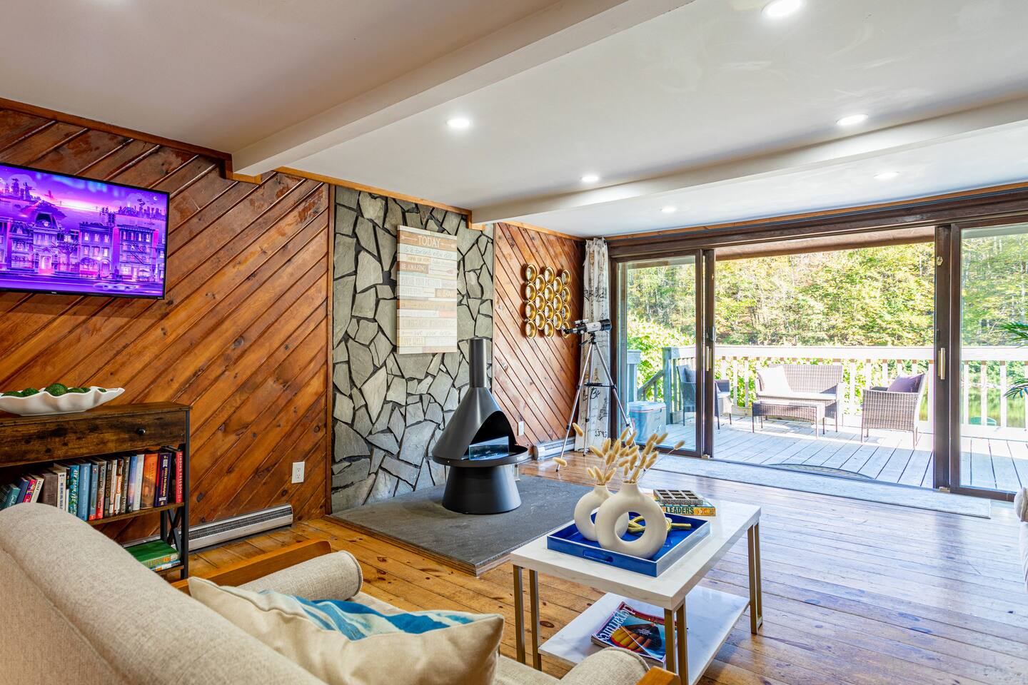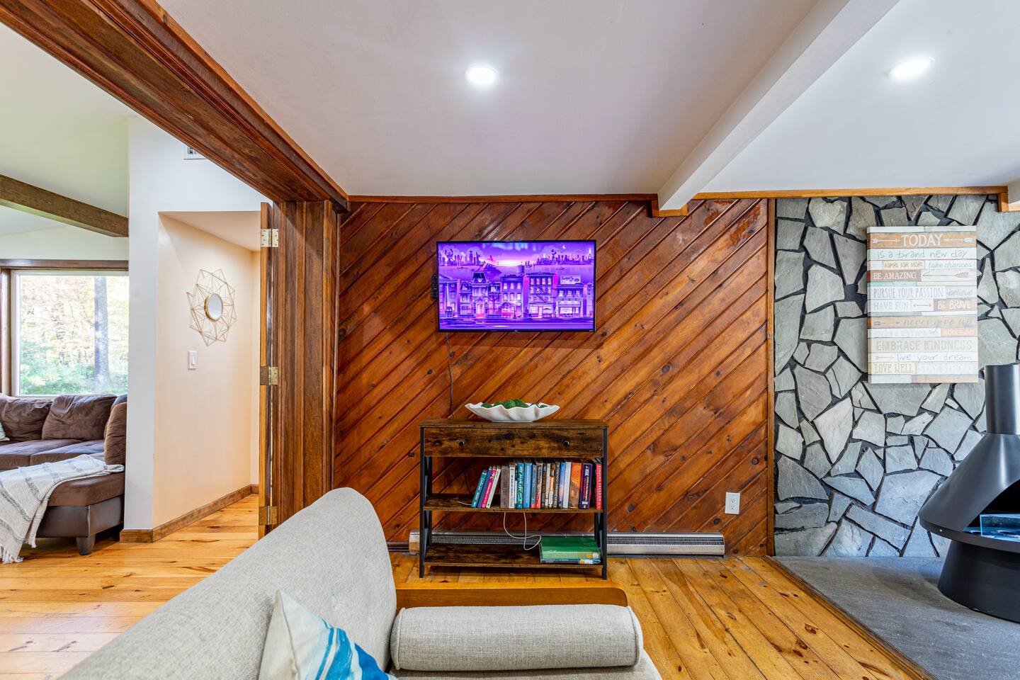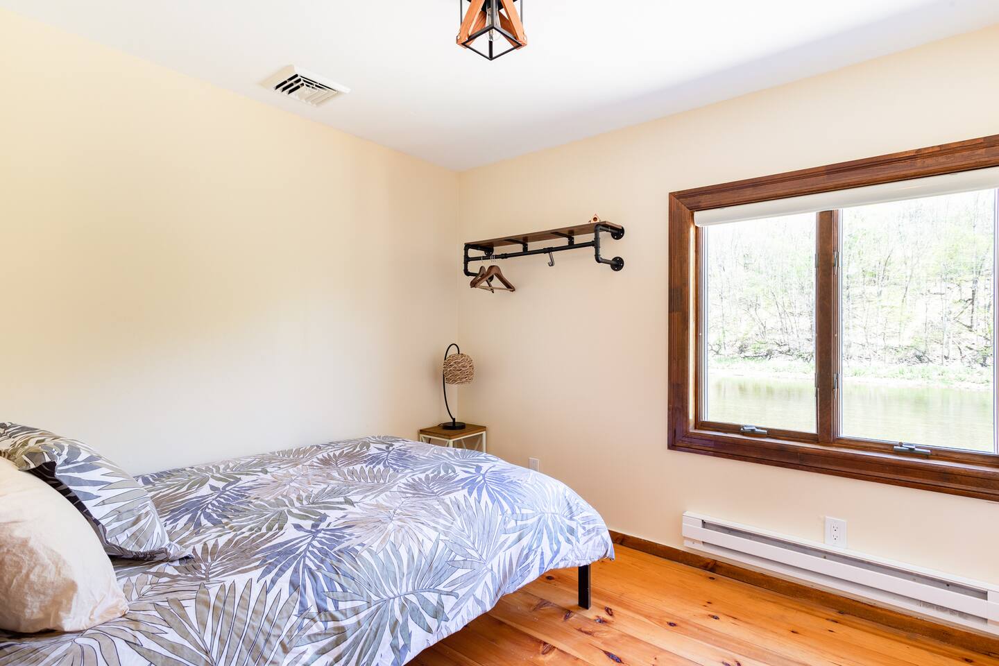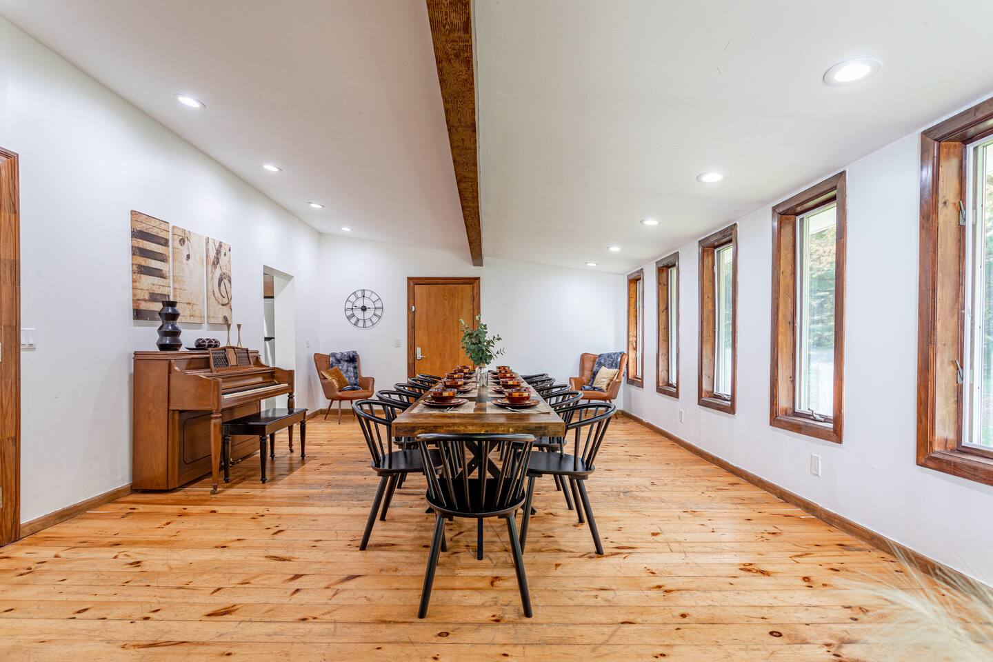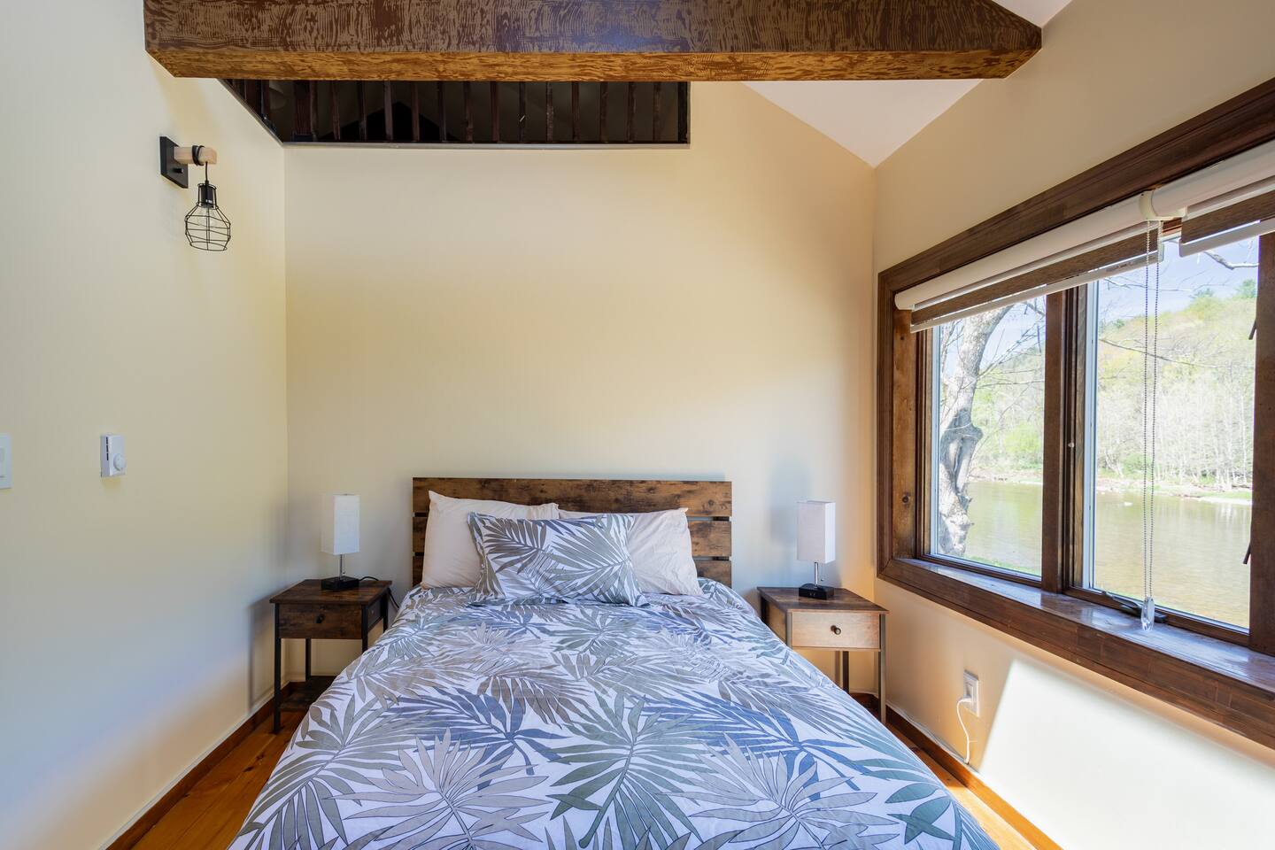 This completely private house is perfect for nature lovers. You’ll feel the serenity as you drive down the private gravel road toward the property. Enjoy the beautiful river across the driveway and catch a glimpse of the local wildlife. Snuggle up on the couch facing the fireplace in the winter as you watch the snow falling quietly around you through the wall of windows. In the summertime, stretch out and watch the stars break through the sky on the expanded deck. Enjoy the telescope, already set up on a tripod, for an authentic stargazing experience. Unwind in the evening with a cinematic experience in the home's private theater. Snuggle up in the plush, massage-enabled electric recliners and indulge in freshly popped popcorn, courtesy of the theater's convenient popcorn maker. This renovated home features 8 bedrooms with stunning river or forest views. 3 of the bedrooms have cozy attic nooks accessed by a ladder, with benches, books, and skylights and pitched roofs to add to the charm, making them perfect for getting lost in a good book or letting your imagination run wild! This house boasts a rustic wooded entry and a fully stocked kitchen with new modern appliances. The outdoor area retains its rustic look, while indoors has beautiful modern furniture, a Gel Fuel-burning and electric fireplace, cathedral ceilings, large windows, recessed lighting, and a propane grill on the deck. The property has broad grassy yards, perfect for frisbee games in the summer, or snowball fights in the winter. Extend your day into a magical night amidst the serene surroundings. Unwind in the beautifully landscaped sitting area, complete with a cozy fire pit and ambient lighting. Roast marshmallows for s'mores, share stories, and create lasting memories under the stars. Nearby, relax and socialize in the spacious 8-person hot tub, perfectly positioned to soak in the tranquility of the surroundings From the spacious floor plan, to the large private decks and yards, to the beautiful river and forest views, this is the perfect home for a relaxing getaway. The property features: - 7 bedrooms with 1 full bed each. - 1 bedroom with a total of 6 twin (bunk) beds. - 3 full bathrooms. - Game room for entertainment. - Movie theater. - Expansive deck with fire pit and grill. - Indoor heated pool open year-round. - Heated hot tub in a beautiful landscape setting. - Trout-filled river right in front of the property. - And many more amenities... Additional air mattresses can also be provided upon request.