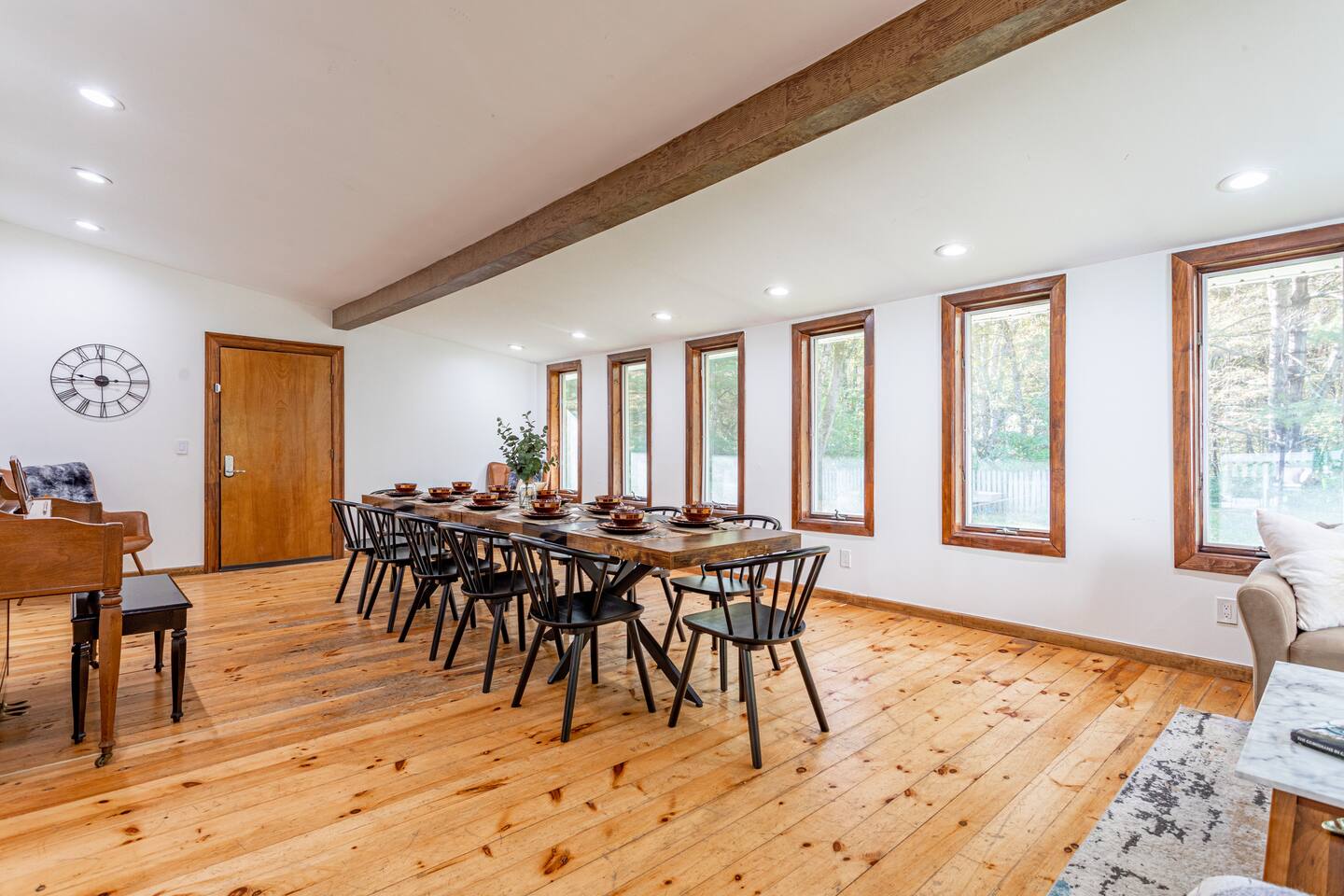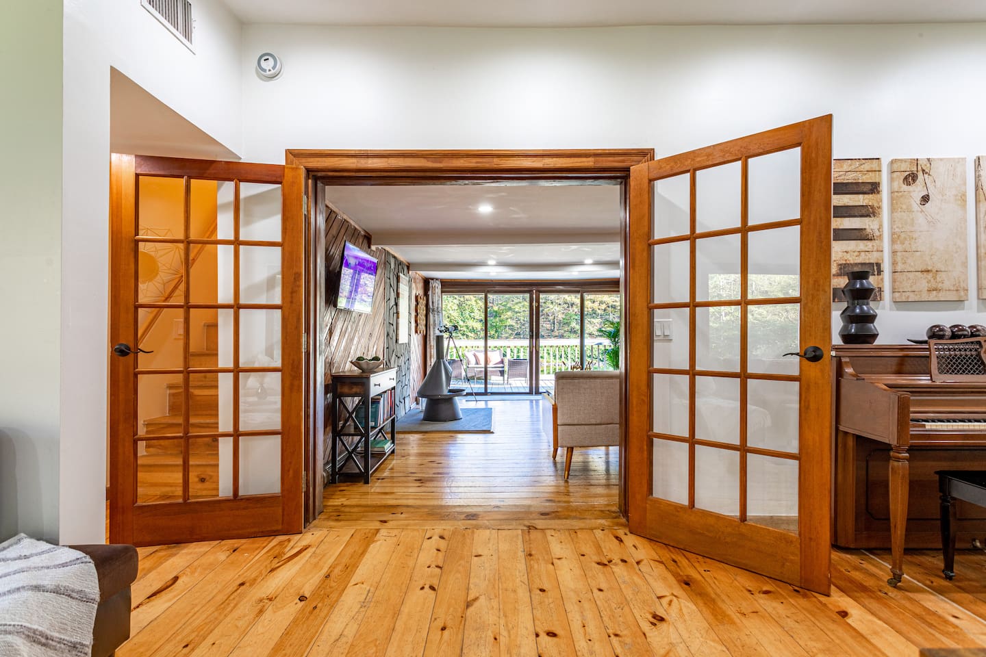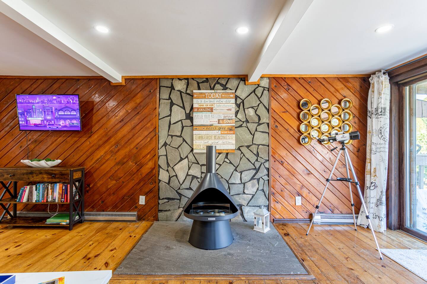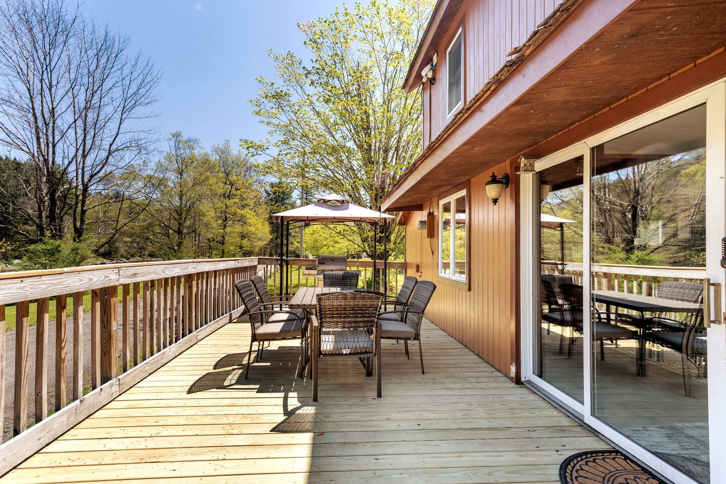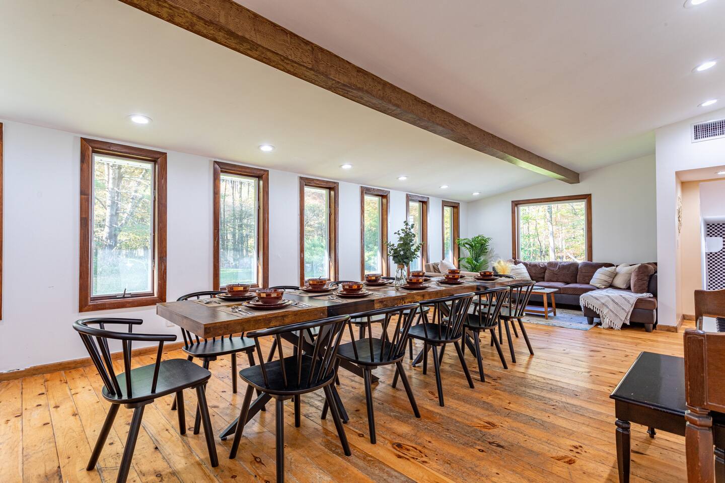 This completely private house is perfect for nature lovers. You’ll feel the serenity as you drive down the private gravel road toward the property. Enjoy the beautiful river across the driveway and catch a glimpse of the local wildlife. Snuggle up on the couch facing the fireplace in the winter as you watch the snow falling quietly around you through the wall of windows. In the summertime, stretch out and watch the stars break through the sky on the expanded deck. Enjoy the telescope, already set up on a tripod, for an authentic stargazing experience. Unwind in the evening with a cinematic experience in the home's private theater. Snuggle up in the plush, massage-enabled electric recliners and indulge in freshly popped popcorn, courtesy of the theater's convenient popcorn maker. This renovated home features 8 bedrooms with stunning river or forest views. 3 of the bedrooms have cozy attic nooks accessed by a ladder, with benches, books, and skylights and pitched roofs to add to the charm, making them perfect for getting lost in a good book or letting your imagination run wild! This house boasts a rustic wooded entry and a fully stocked kitchen with new modern appliances. The outdoor area retains its rustic look, while indoors has beautiful modern furniture, a Gel Fuel-burning and electric fireplace, cathedral ceilings, large windows, recessed lighting, and a propane grill on the deck. The property has broad grassy yards, perfect for frisbee games in the summer, or snowball fights in the winter. Extend your day into a magical night amidst the serene surroundings. Unwind in the beautifully landscaped sitting area, complete with a cozy fire pit and ambient lighting. Roast marshmallows for s'mores, share stories, and create lasting memories under the stars. Nearby, relax and socialize in the spacious 8-person hot tub, perfectly positioned to soak in the tranquility of the surroundings From the spacious floor plan, to the large private decks and yards, to the beautiful river and forest views, this is the perfect home for a relaxing getaway. The property features: - 7 bedrooms with 1 full bed each. - 1 bedroom with a total of 6 twin (bunk) beds. - 3 full bathrooms. - Game room for entertainment. - Movie theater. - Expansive deck with fire pit and grill. - Indoor heated pool open year-round. - Heated hot tub in a beautiful landscape setting. - Trout-filled river right in front of the property. - And many more amenities... Additional air mattresses can also be provided upon request.