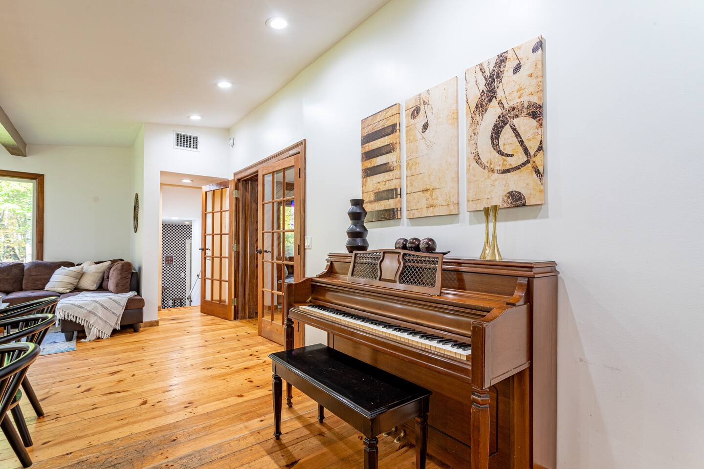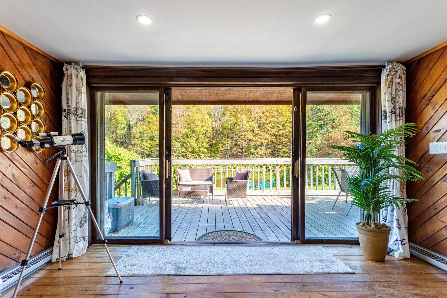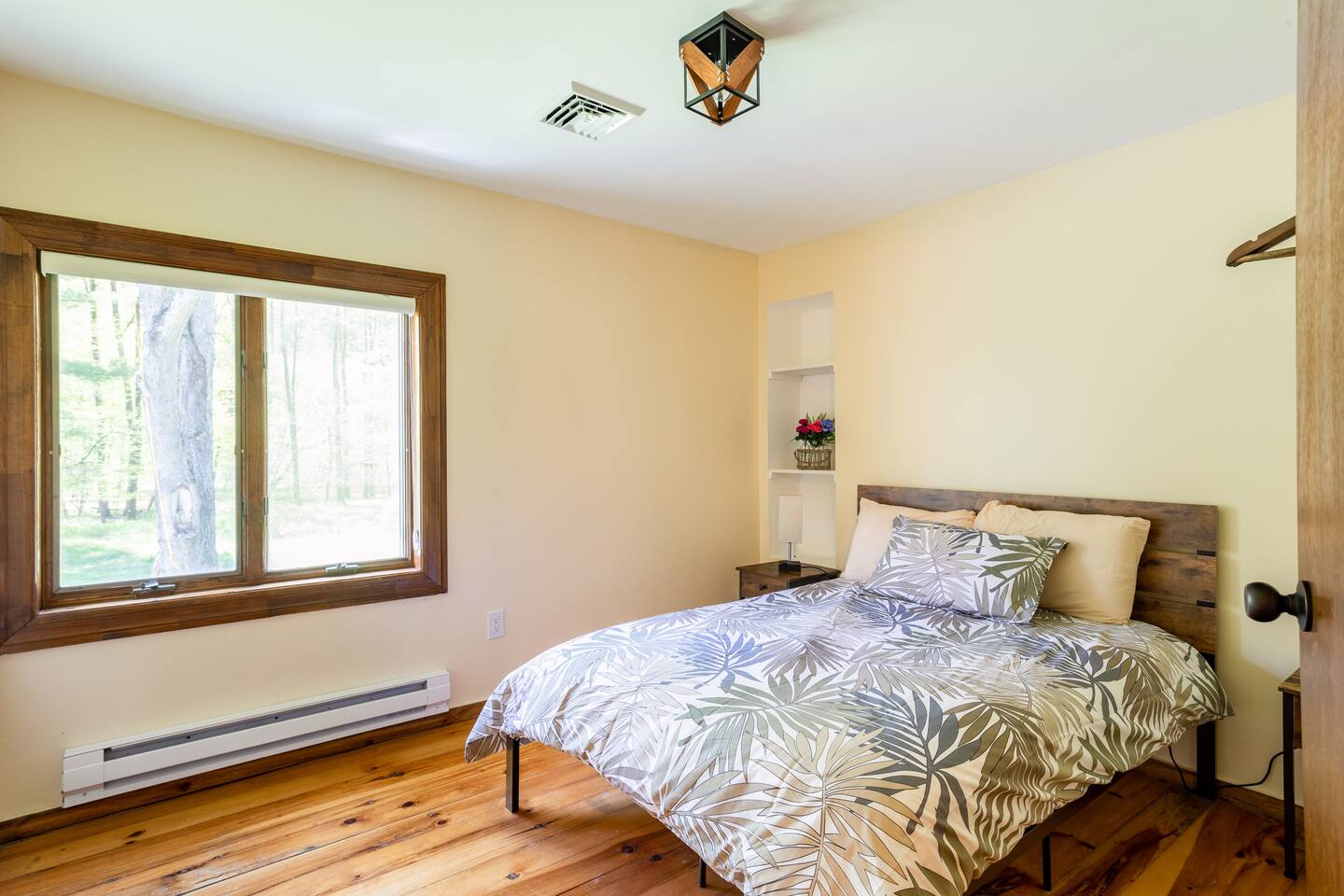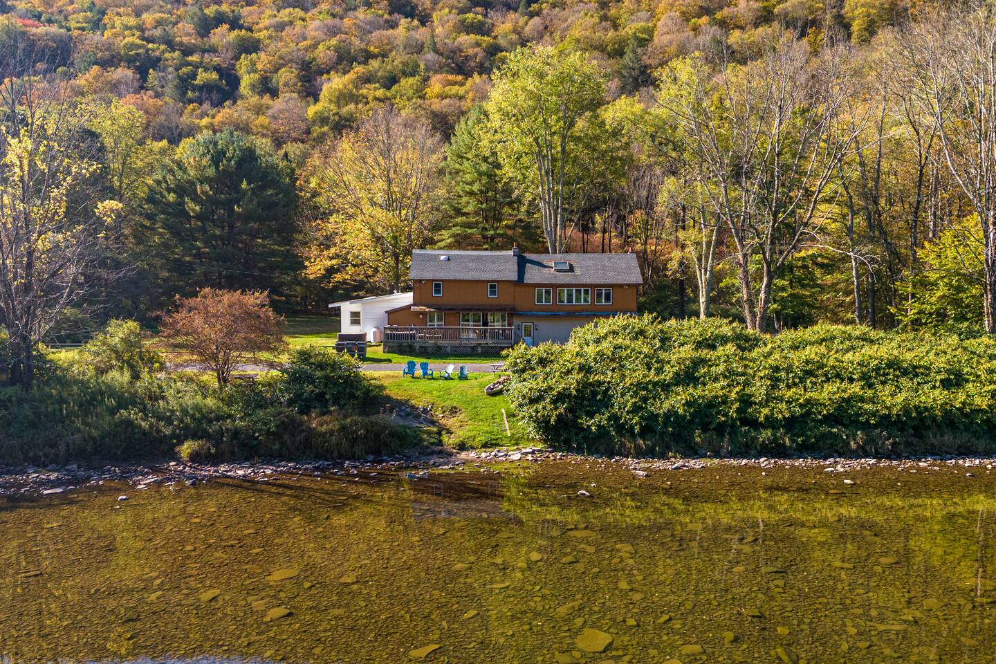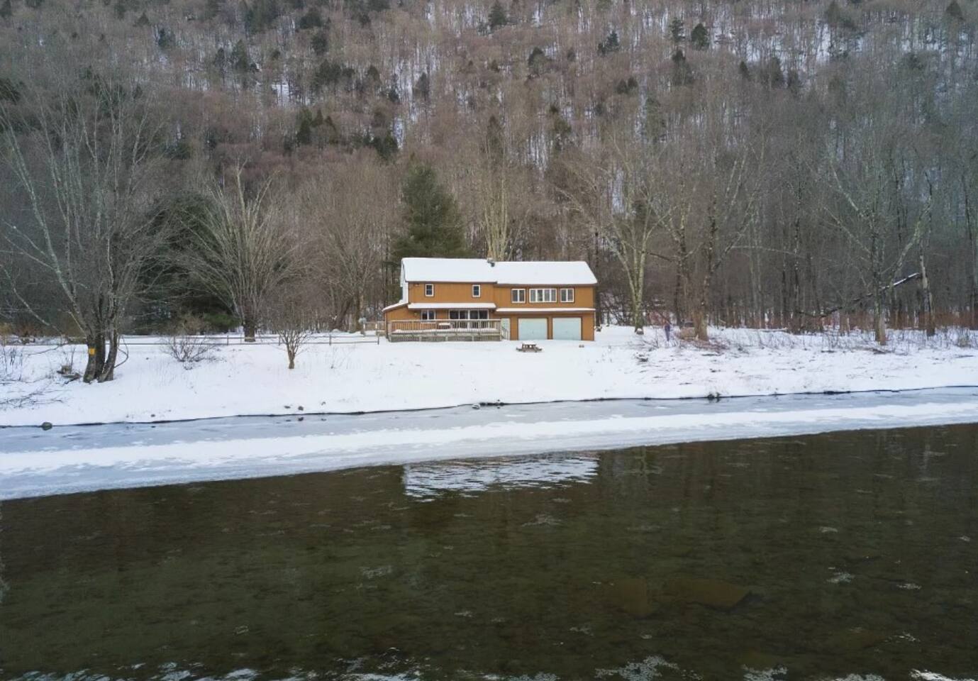 This completely private house is perfect for nature lovers. You’ll feel the serenity as you drive down the private gravel road toward the property. Enjoy the beautiful river across the driveway and catch a glimpse of the local wildlife. Snuggle up on the couch facing the fireplace in the winter as you watch the snow falling quietly around you through the wall of windows. In the summertime, stretch out and watch the stars break through the sky on the expanded deck. Enjoy the telescope, already set up on a tripod, for an authentic stargazing experience. Unwind in the evening with a cinematic experience in the home's private theater. Snuggle up in the plush, massage-enabled electric recliners and indulge in freshly popped popcorn, courtesy of the theater's convenient popcorn maker. This renovated home features 8 bedrooms with stunning river or forest views. 3 of the bedrooms have cozy attic nooks accessed by a ladder, with benches, books, and skylights and pitched roofs to add to the charm, making them perfect for getting lost in a good book or letting your imagination run wild! This house boasts a rustic wooded entry and a fully stocked kitchen with new modern appliances. The outdoor area retains its rustic look, while indoors has beautiful modern furniture, a Gel Fuel-burning and electric fireplace, cathedral ceilings, large windows, recessed lighting, and a propane grill on the deck. The property has broad grassy yards, perfect for frisbee games in the summer, or snowball fights in the winter. Extend your day into a magical night amidst the serene surroundings. Unwind in the beautifully landscaped sitting area, complete with a cozy fire pit and ambient lighting. Roast marshmallows for s'mores, share stories, and create lasting memories under the stars. Nearby, relax and socialize in the spacious 8-person hot tub, perfectly positioned to soak in the tranquility of the surroundings From the spacious floor plan, to the large private decks and yards, to the beautiful river and forest views, this is the perfect home for a relaxing getaway. The property features: - 7 bedrooms with 1 full bed each. - 1 bedroom with a total of 6 twin (bunk) beds. - 3 full bathrooms. - Game room for entertainment. - Movie theater. - Expansive deck with fire pit and grill. - Indoor heated pool open year-round. - Heated hot tub in a beautiful landscape setting. - Trout-filled river right in front of the property. - And many more amenities... Additional air mattresses can also be provided upon request.