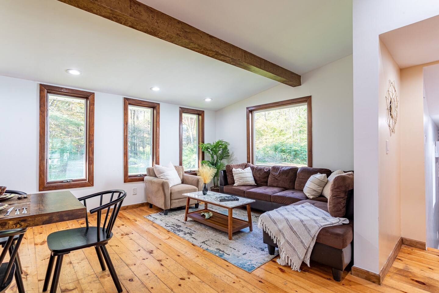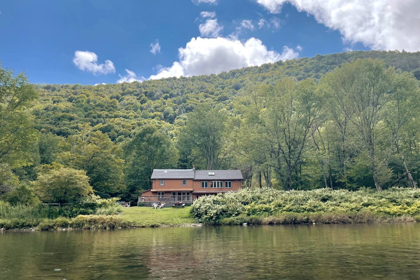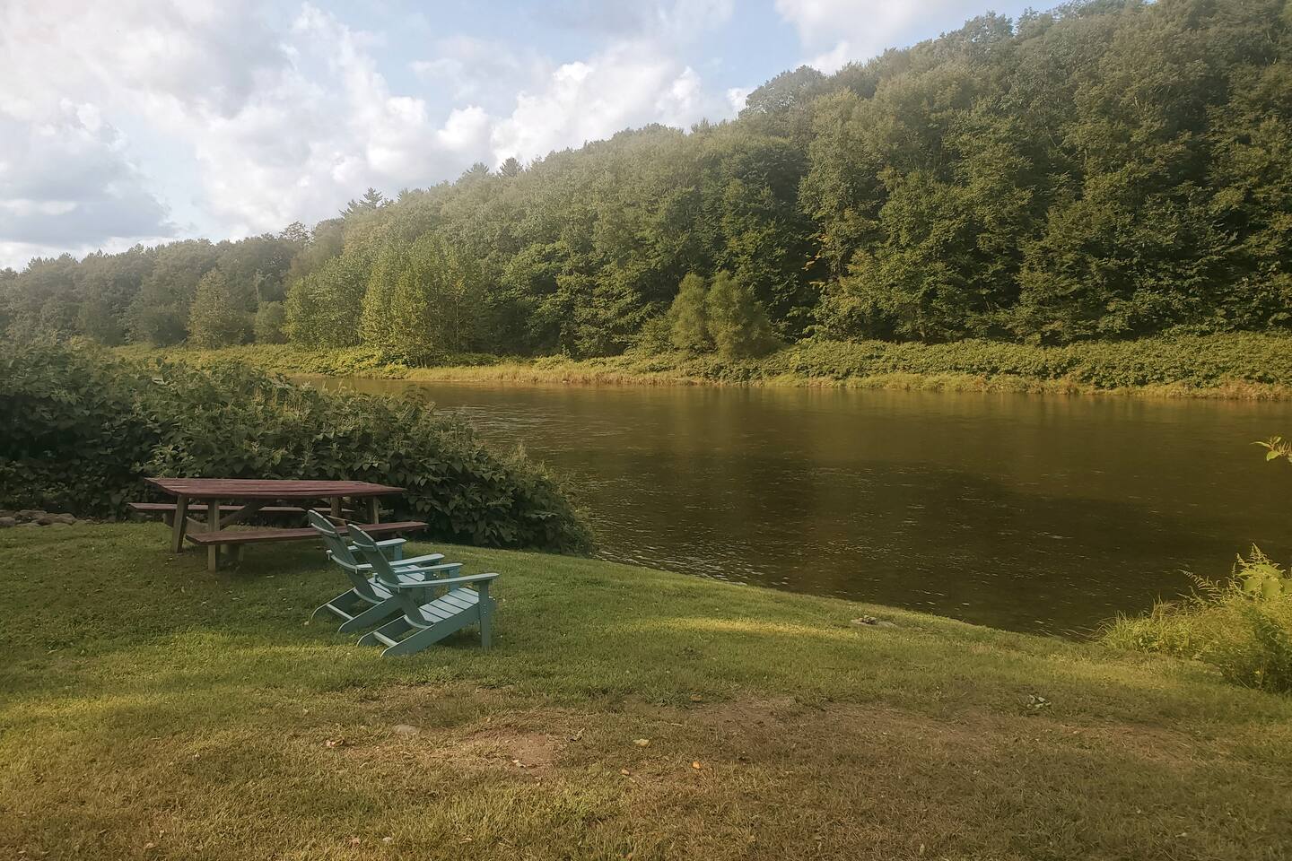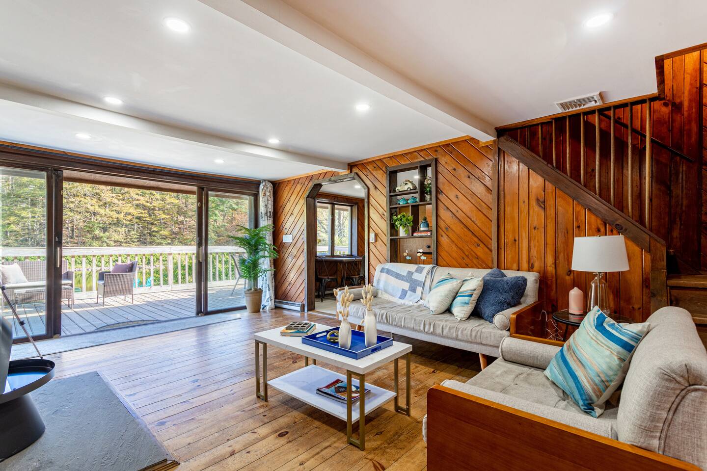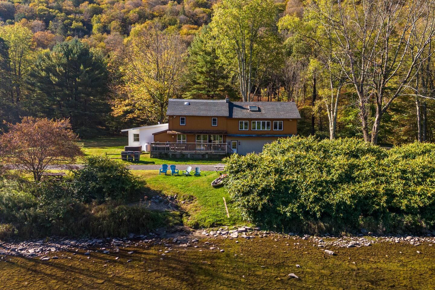 This completely private house is perfect for nature lovers. You’ll feel the serenity as you drive down the private gravel road toward the property. Enjoy the beautiful river across the driveway and catch a glimpse of the local wildlife. Snuggle up on the couch facing the fireplace in the winter as you watch the snow falling quietly around you through the wall of windows. In the summertime, stretch out and watch the stars break through the sky on the expanded deck. Enjoy the telescope, already set up on a tripod, for an authentic stargazing experience. Unwind in the evening with a cinematic experience in the home's private theater. Snuggle up in the plush, massage-enabled electric recliners and indulge in freshly popped popcorn, courtesy of the theater's convenient popcorn maker. This renovated home features 8 bedrooms with stunning river or forest views. 3 of the bedrooms have cozy attic nooks accessed by a ladder, with benches, books, and skylights and pitched roofs to add to the charm, making them perfect for getting lost in a good book or letting your imagination run wild! This house boasts a rustic wooded entry and a fully stocked kitchen with new modern appliances. The outdoor area retains its rustic look, while indoors has beautiful modern furniture, a Gel Fuel-burning and electric fireplace, cathedral ceilings, large windows, recessed lighting, and a propane grill on the deck. The property has broad grassy yards, perfect for frisbee games in the summer, or snowball fights in the winter. Extend your day into a magical night amidst the serene surroundings. Unwind in the beautifully landscaped sitting area, complete with a cozy fire pit and ambient lighting. Roast marshmallows for s'mores, share stories, and create lasting memories under the stars. Nearby, relax and socialize in the spacious 8-person hot tub, perfectly positioned to soak in the tranquility of the surroundings From the spacious floor plan, to the large private decks and yards, to the beautiful river and forest views, this is the perfect home for a relaxing getaway. The property features: - 7 bedrooms with 1 full bed each. - 1 bedroom with a total of 6 twin (bunk) beds. - 3 full bathrooms. - Game room for entertainment. - Movie theater. - Expansive deck with fire pit and grill. - Indoor heated pool open year-round. - Heated hot tub in a beautiful landscape setting. - Trout-filled river right in front of the property. - And many more amenities... Additional air mattresses can also be provided upon request.