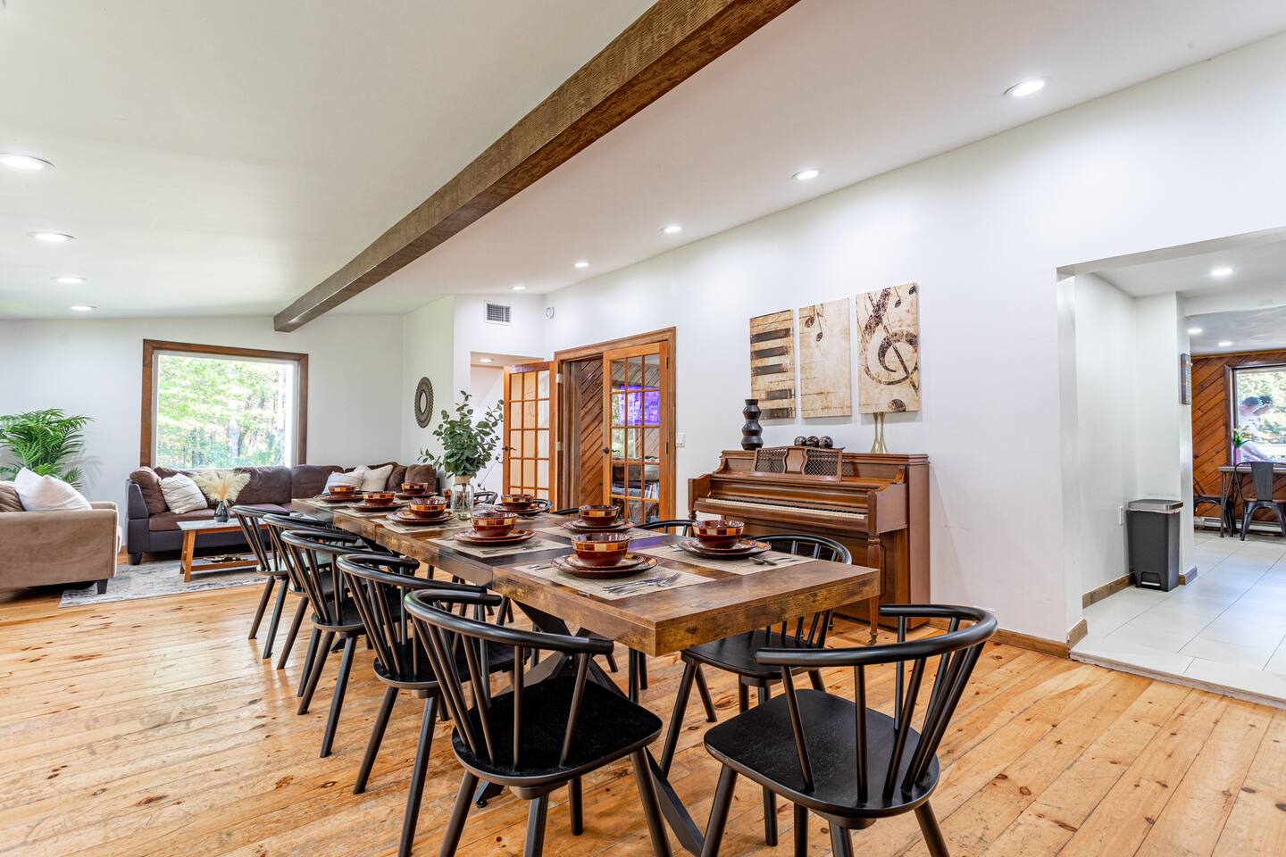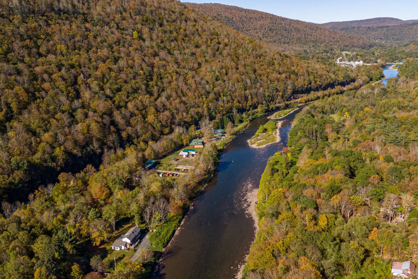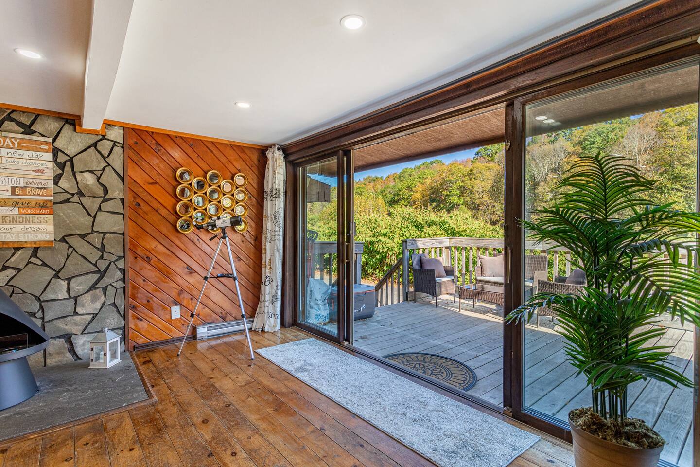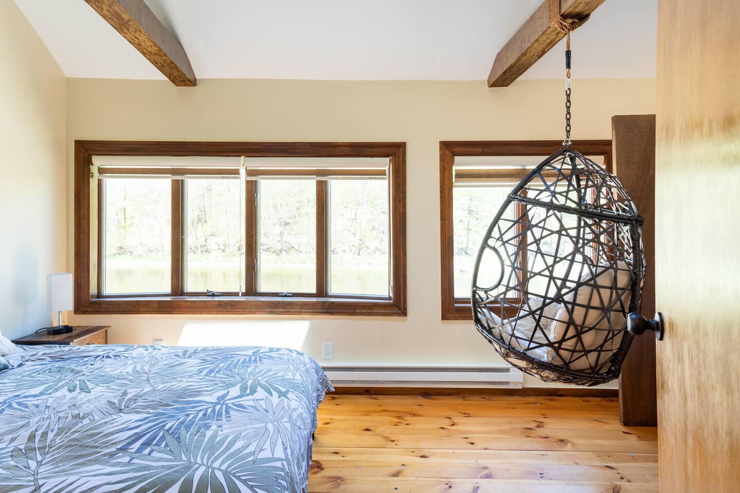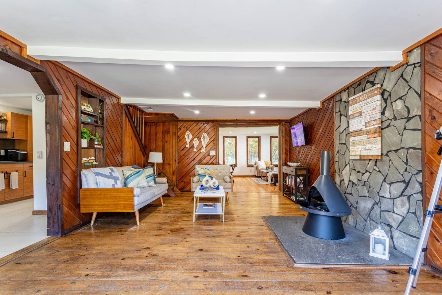 This completely private house is perfect for nature lovers. You’ll feel the serenity as you drive down the private gravel road toward the property. Enjoy the beautiful river across the driveway and catch a glimpse of the local wildlife. Snuggle up on the couch facing the fireplace in the winter as you watch the snow falling quietly around you through the wall of windows. In the summertime, stretch out and watch the stars break through the sky on the expanded deck. Enjoy the telescope, already set up on a tripod, for an authentic stargazing experience. Unwind in the evening with a cinematic experience in the home's private theater. Snuggle up in the plush, massage-enabled electric recliners and indulge in freshly popped popcorn, courtesy of the theater's convenient popcorn maker. This renovated home features 8 bedrooms with stunning river or forest views. 3 of the bedrooms have cozy attic nooks accessed by a ladder, with benches, books, and skylights and pitched roofs to add to the charm, making them perfect for getting lost in a good book or letting your imagination run wild! This house boasts a rustic wooded entry and a fully stocked kitchen with new modern appliances. The outdoor area retains its rustic look, while indoors has beautiful modern furniture, a Gel Fuel-burning and electric fireplace, cathedral ceilings, large windows, recessed lighting, and a propane grill on the deck. The property has broad grassy yards, perfect for frisbee games in the summer, or snowball fights in the winter. Extend your day into a magical night amidst the serene surroundings. Unwind in the beautifully landscaped sitting area, complete with a cozy fire pit and ambient lighting. Roast marshmallows for s'mores, share stories, and create lasting memories under the stars. Nearby, relax and socialize in the spacious 8-person hot tub, perfectly positioned to soak in the tranquility of the surroundings From the spacious floor plan, to the large private decks and yards, to the beautiful river and forest views, this is the perfect home for a relaxing getaway. The property features: - 7 bedrooms with 1 full bed each. - 1 bedroom with a total of 6 twin (bunk) beds. - 3 full bathrooms. - Game room for entertainment. - Movie theater. - Expansive deck with fire pit and grill. - Indoor heated pool open year-round. - Heated hot tub in a beautiful landscape setting. - Trout-filled river right in front of the property. - And many more amenities... Additional air mattresses can also be provided upon request.