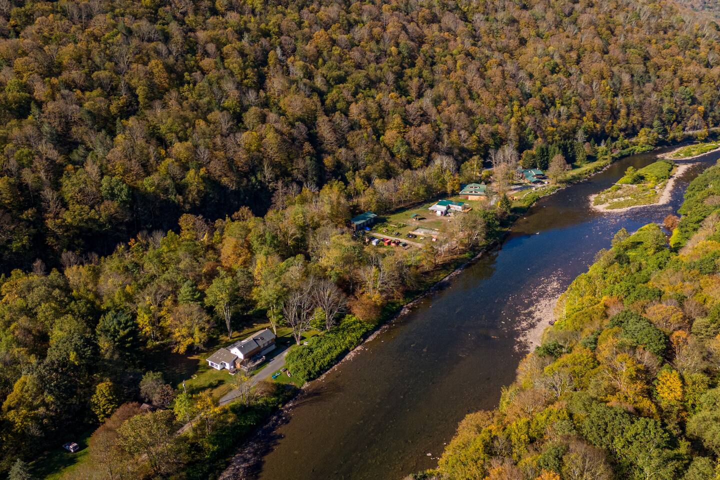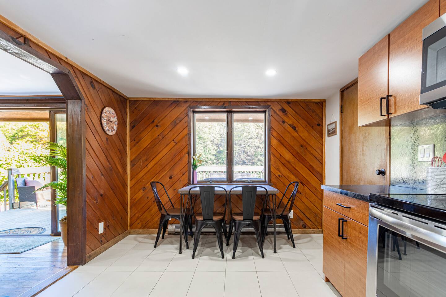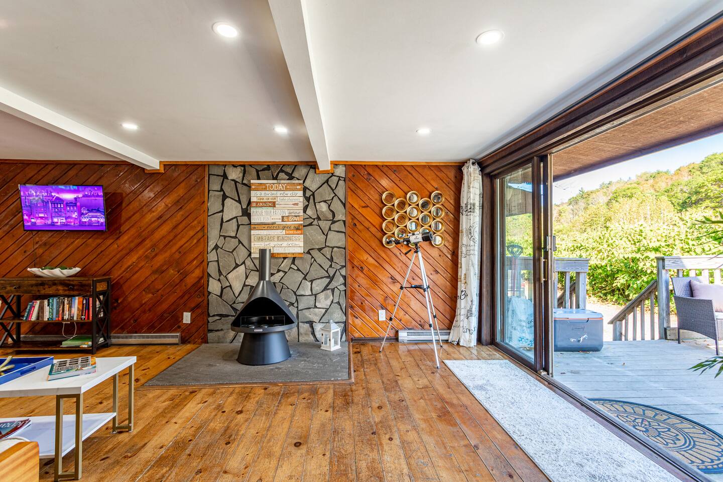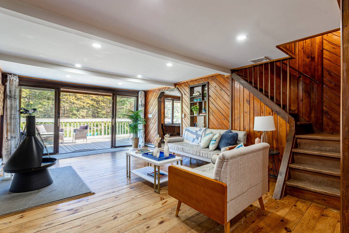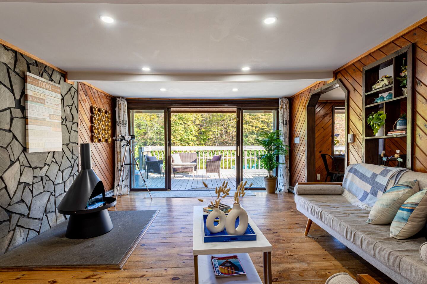 This completely private house is perfect for nature lovers. You’ll feel the serenity as you drive down the private gravel road toward the property. Enjoy the beautiful river across the driveway and catch a glimpse of the local wildlife. Snuggle up on the couch facing the fireplace in the winter as you watch the snow falling quietly around you through the wall of windows. In the summertime, stretch out and watch the stars break through the sky on the expanded deck. Enjoy the telescope, already set up on a tripod, for an authentic stargazing experience. Unwind in the evening with a cinematic experience in the home's private theater. Snuggle up in the plush, massage-enabled electric recliners and indulge in freshly popped popcorn, courtesy of the theater's convenient popcorn maker. This renovated home features 8 bedrooms with stunning river or forest views. 3 of the bedrooms have cozy attic nooks accessed by a ladder, with benches, books, and skylights and pitched roofs to add to the charm, making them perfect for getting lost in a good book or letting your imagination run wild! This house boasts a rustic wooded entry and a fully stocked kitchen with new modern appliances. The outdoor area retains its rustic look, while indoors has beautiful modern furniture, a Gel Fuel-burning and electric fireplace, cathedral ceilings, large windows, recessed lighting, and a propane grill on the deck. The property has broad grassy yards, perfect for frisbee games in the summer, or snowball fights in the winter. Extend your day into a magical night amidst the serene surroundings. Unwind in the beautifully landscaped sitting area, complete with a cozy fire pit and ambient lighting. Roast marshmallows for s'mores, share stories, and create lasting memories under the stars. Nearby, relax and socialize in the spacious 8-person hot tub, perfectly positioned to soak in the tranquility of the surroundings From the spacious floor plan, to the large private decks and yards, to the beautiful river and forest views, this is the perfect home for a relaxing getaway. The property features: - 7 bedrooms with 1 full bed each. - 1 bedroom with a total of 6 twin (bunk) beds. - 3 full bathrooms. - Game room for entertainment. - Movie theater. - Expansive deck with fire pit and grill. - Indoor heated pool open year-round. - Heated hot tub in a beautiful landscape setting. - Trout-filled river right in front of the property. - And many more amenities... Additional air mattresses can also be provided upon request.