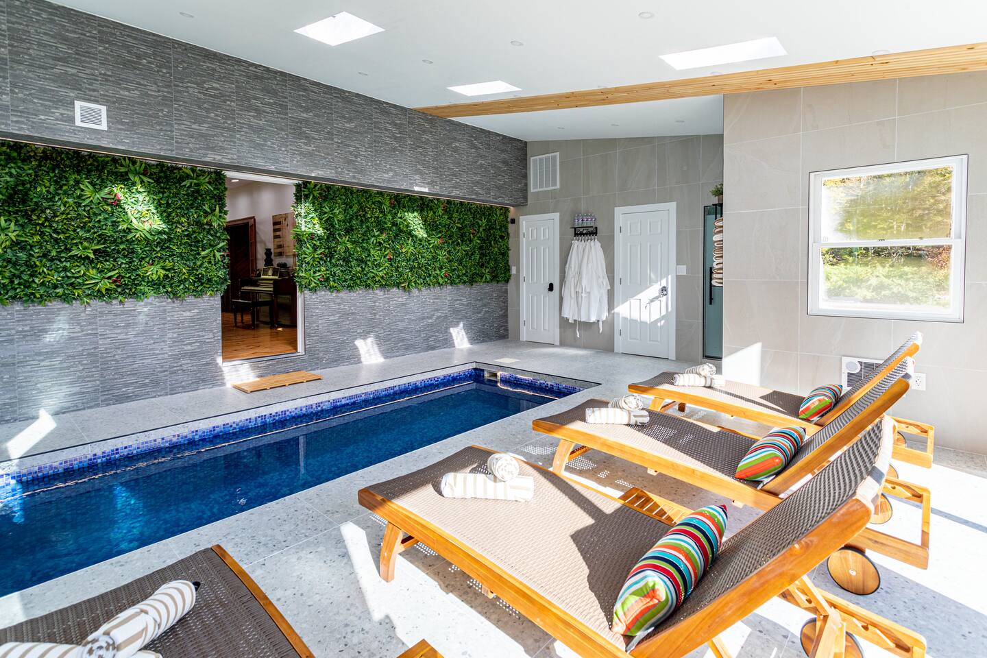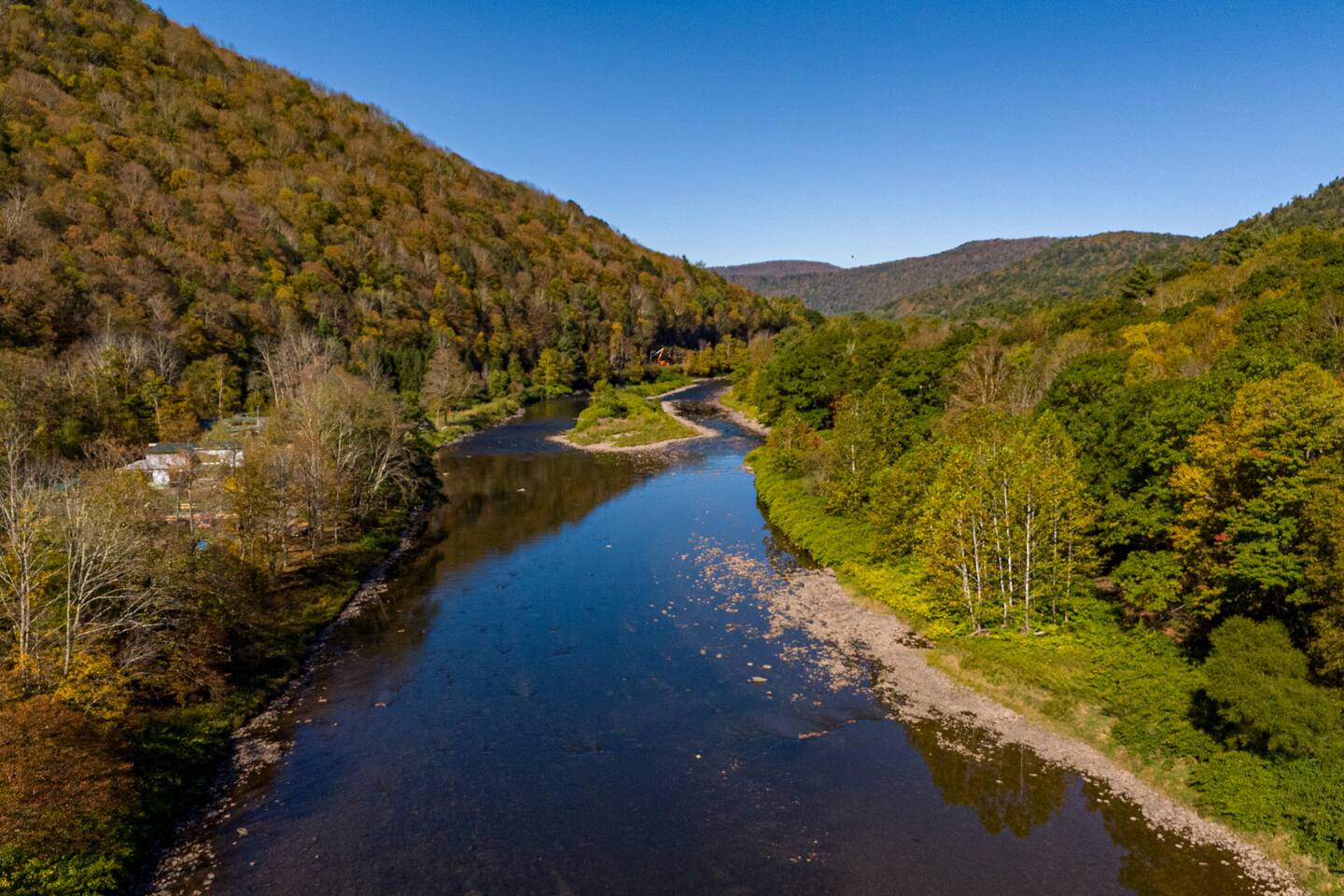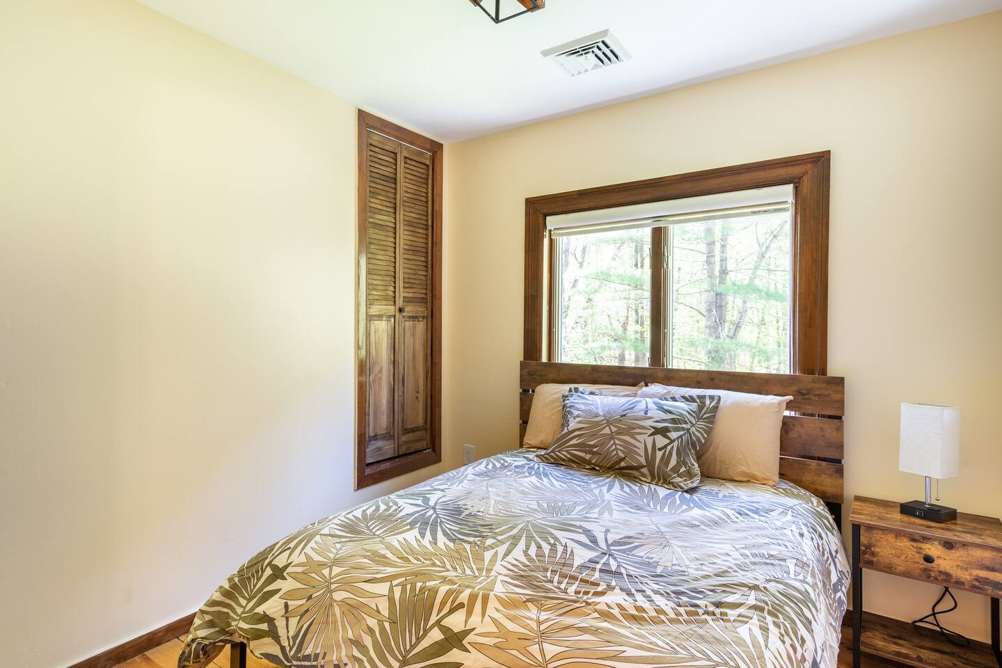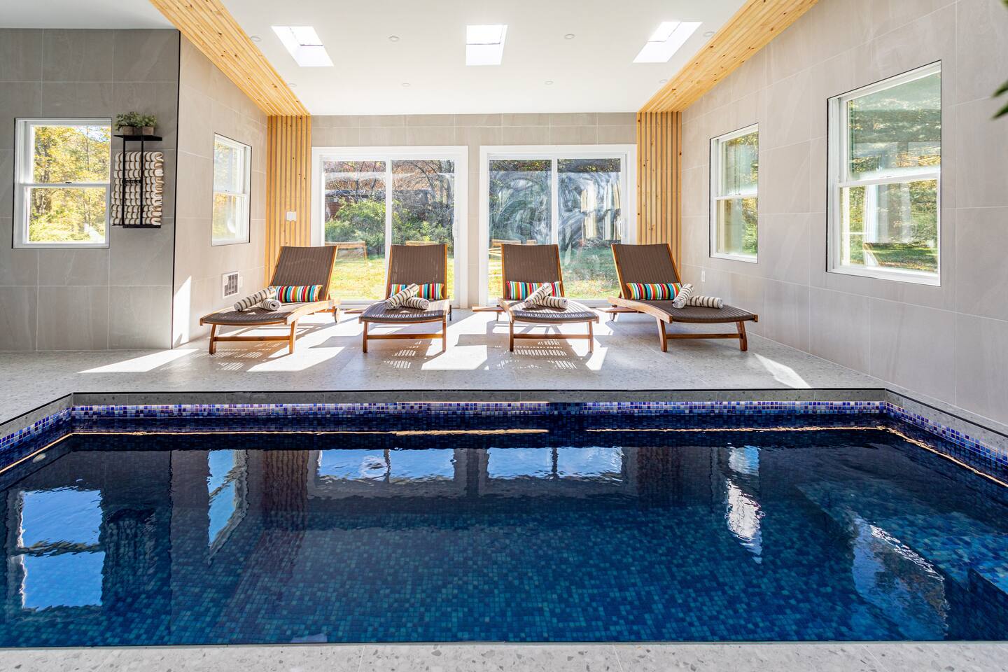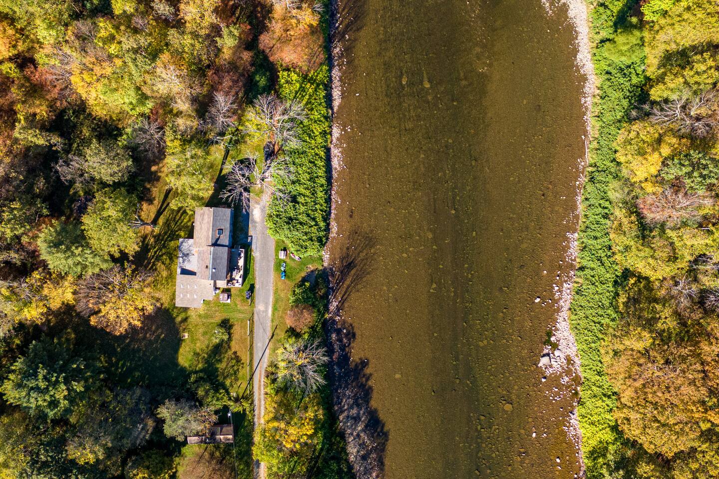 This completely private house is perfect for nature lovers. You’ll feel the serenity as you drive down the private gravel road toward the property. Enjoy the beautiful river across the driveway and catch a glimpse of the local wildlife. Snuggle up on the couch facing the fireplace in the winter as you watch the snow falling quietly around you through the wall of windows. In the summertime, stretch out and watch the stars break through the sky on the expanded deck. Enjoy the telescope, already set up on a tripod, for an authentic stargazing experience. Unwind in the evening with a cinematic experience in the home's private theater. Snuggle up in the plush, massage-enabled electric recliners and indulge in freshly popped popcorn, courtesy of the theater's convenient popcorn maker. This renovated home features 8 bedrooms with stunning river or forest views. 3 of the bedrooms have cozy attic nooks accessed by a ladder, with benches, books, and skylights and pitched roofs to add to the charm, making them perfect for getting lost in a good book or letting your imagination run wild! This house boasts a rustic wooded entry and a fully stocked kitchen with new modern appliances. The outdoor area retains its rustic look, while indoors has beautiful modern furniture, a Gel Fuel-burning and electric fireplace, cathedral ceilings, large windows, recessed lighting, and a propane grill on the deck. The property has broad grassy yards, perfect for frisbee games in the summer, or snowball fights in the winter. Extend your day into a magical night amidst the serene surroundings. Unwind in the beautifully landscaped sitting area, complete with a cozy fire pit and ambient lighting. Roast marshmallows for s'mores, share stories, and create lasting memories under the stars. Nearby, relax and socialize in the spacious 8-person hot tub, perfectly positioned to soak in the tranquility of the surroundings From the spacious floor plan, to the large private decks and yards, to the beautiful river and forest views, this is the perfect home for a relaxing getaway. The property features: - 7 bedrooms with 1 full bed each. - 1 bedroom with a total of 6 twin (bunk) beds. - 3 full bathrooms. - Game room for entertainment. - Movie theater. - Expansive deck with fire pit and grill. - Indoor heated pool open year-round. - Heated hot tub in a beautiful landscape setting. - Trout-filled river right in front of the property. - And many more amenities... Additional air mattresses can also be provided upon request.
