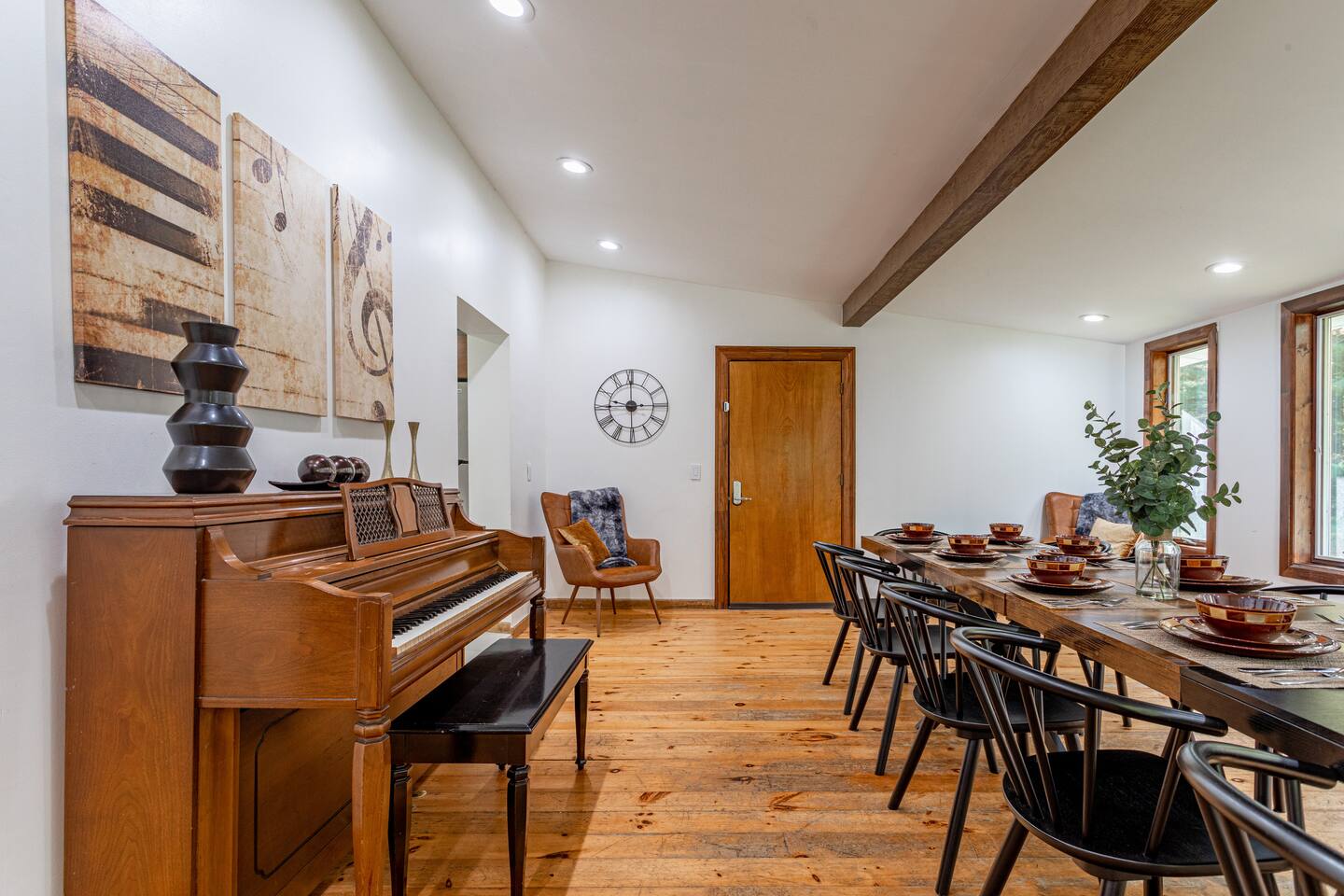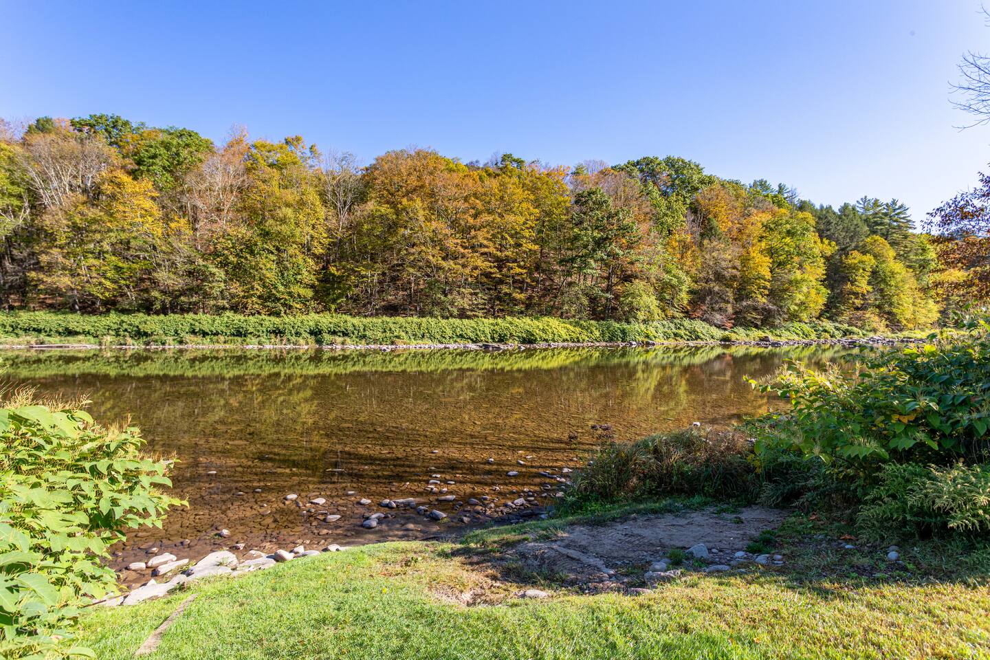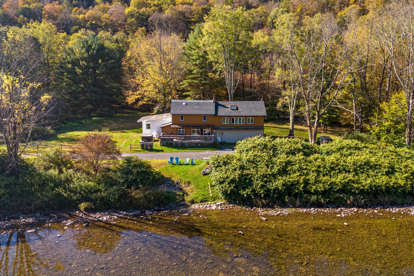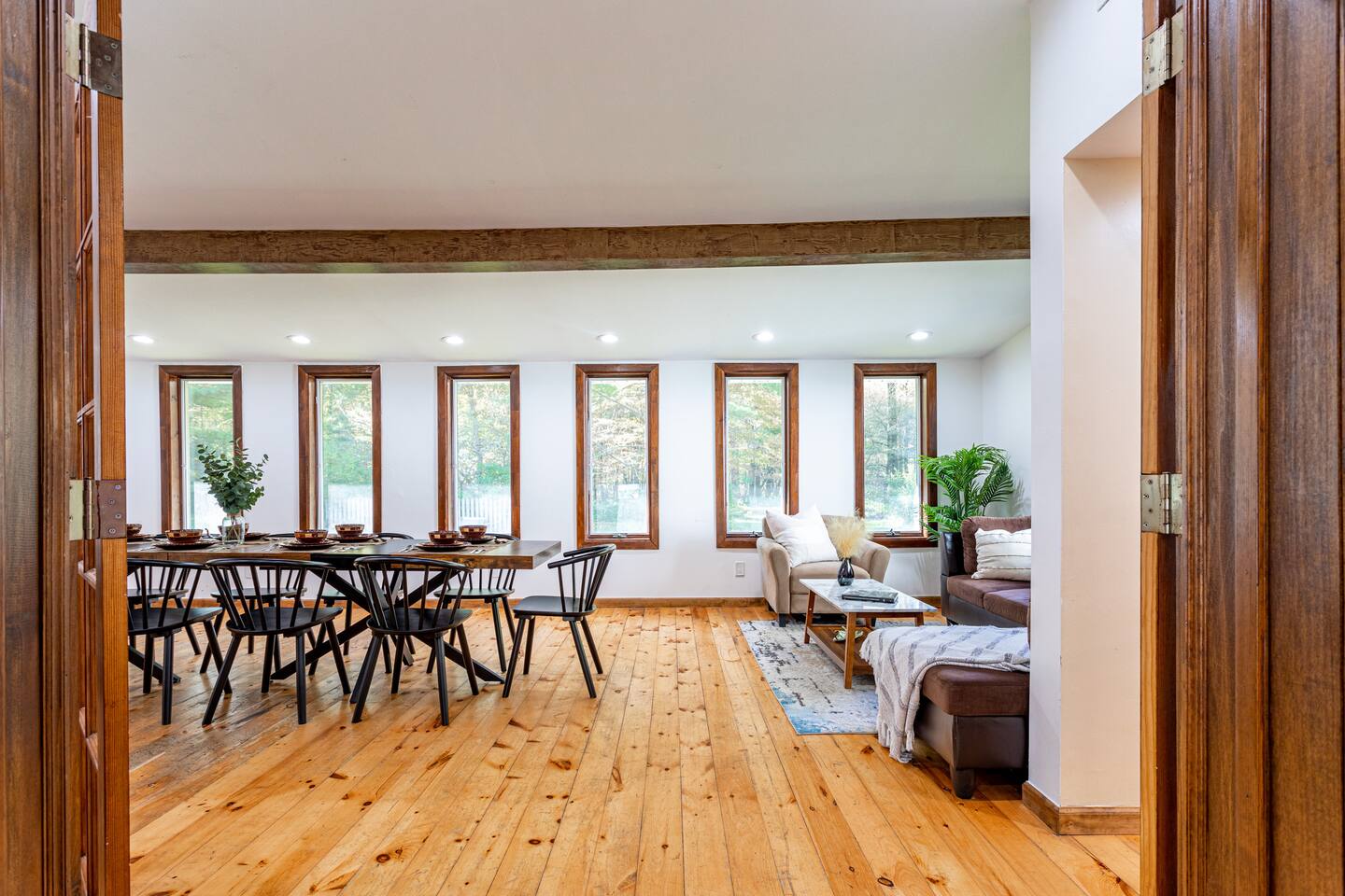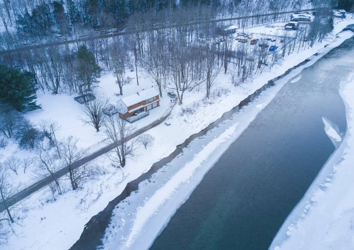 This completely private house is perfect for nature lovers. You’ll feel the serenity as you drive down the private gravel road toward the property. Enjoy the beautiful river across the driveway and catch a glimpse of the local wildlife. Snuggle up on the couch facing the fireplace in the winter as you watch the snow falling quietly around you through the wall of windows. In the summertime, stretch out and watch the stars break through the sky on the expanded deck. Enjoy the telescope, already set up on a tripod, for an authentic stargazing experience. Unwind in the evening with a cinematic experience in the home's private theater. Snuggle up in the plush, massage-enabled electric recliners and indulge in freshly popped popcorn, courtesy of the theater's convenient popcorn maker. This renovated home features 8 bedrooms with stunning river or forest views. 3 of the bedrooms have cozy attic nooks accessed by a ladder, with benches, books, and skylights and pitched roofs to add to the charm, making them perfect for getting lost in a good book or letting your imagination run wild! This house boasts a rustic wooded entry and a fully stocked kitchen with new modern appliances. The outdoor area retains its rustic look, while indoors has beautiful modern furniture, a Gel Fuel-burning and electric fireplace, cathedral ceilings, large windows, recessed lighting, and a propane grill on the deck. The property has broad grassy yards, perfect for frisbee games in the summer, or snowball fights in the winter. Extend your day into a magical night amidst the serene surroundings. Unwind in the beautifully landscaped sitting area, complete with a cozy fire pit and ambient lighting. Roast marshmallows for s'mores, share stories, and create lasting memories under the stars. Nearby, relax and socialize in the spacious 8-person hot tub, perfectly positioned to soak in the tranquility of the surroundings From the spacious floor plan, to the large private decks and yards, to the beautiful river and forest views, this is the perfect home for a relaxing getaway. The property features: - 7 bedrooms with 1 full bed each. - 1 bedroom with a total of 6 twin (bunk) beds. - 3 full bathrooms. - Game room for entertainment. - Movie theater. - Expansive deck with fire pit and grill. - Indoor heated pool open year-round. - Heated hot tub in a beautiful landscape setting. - Trout-filled river right in front of the property. - And many more amenities... Additional air mattresses can also be provided upon request.