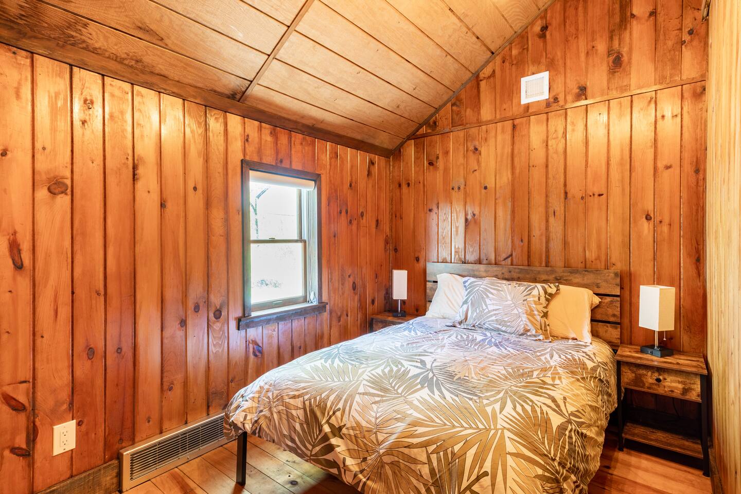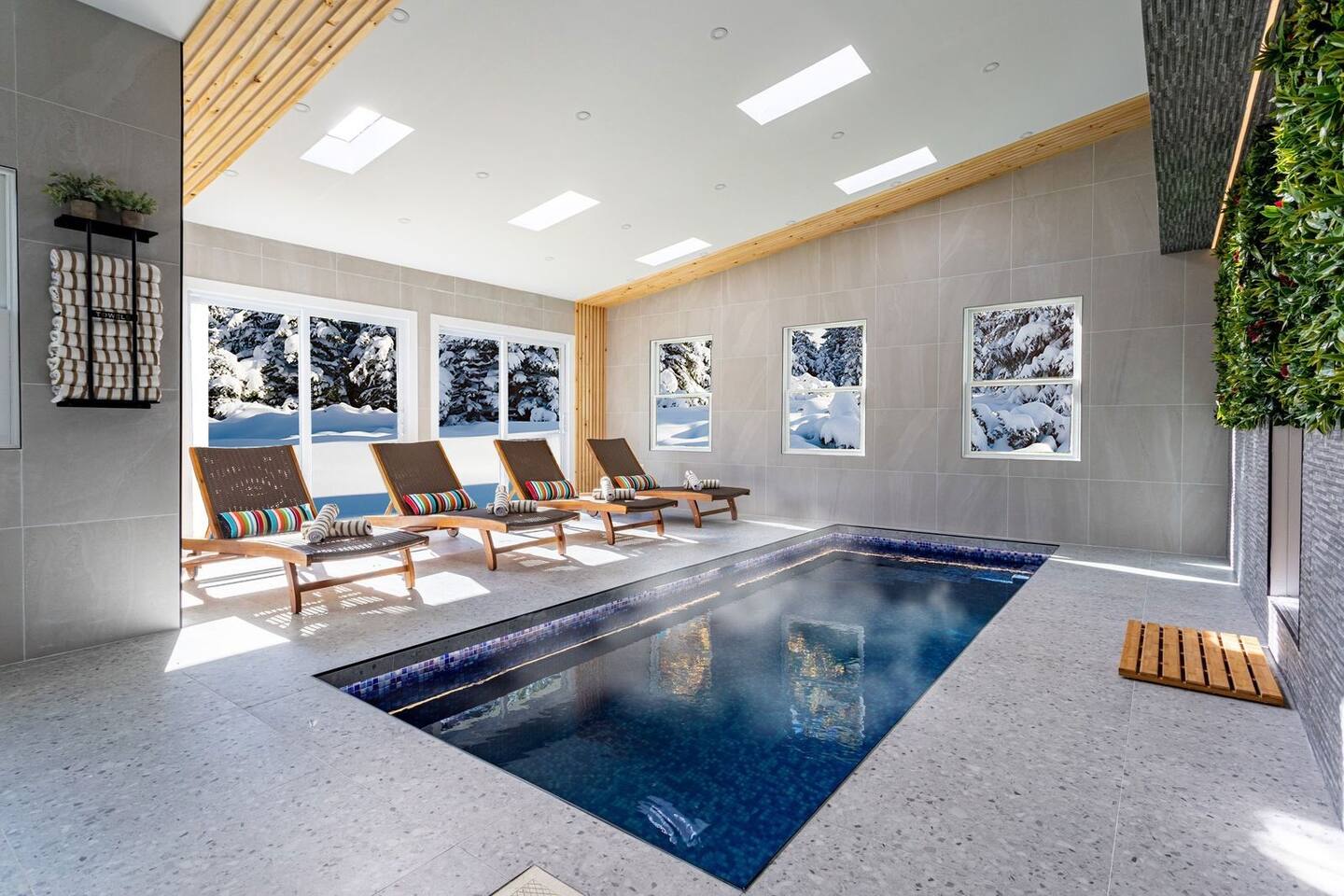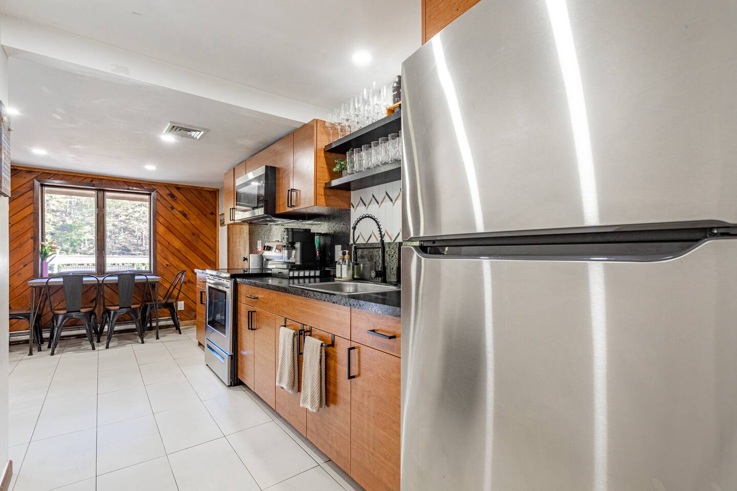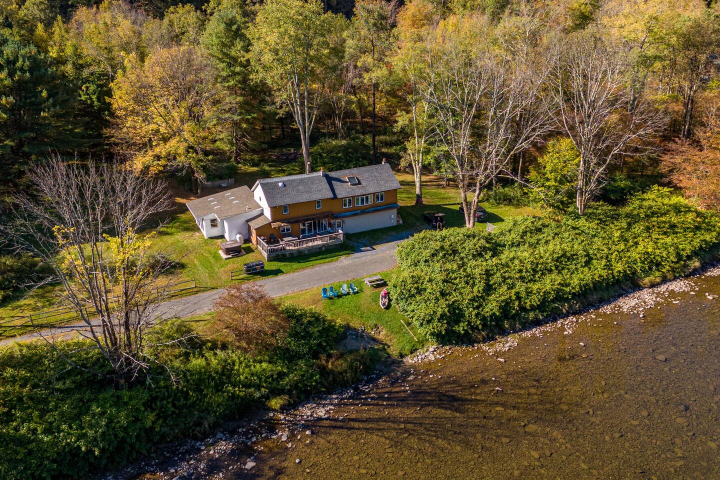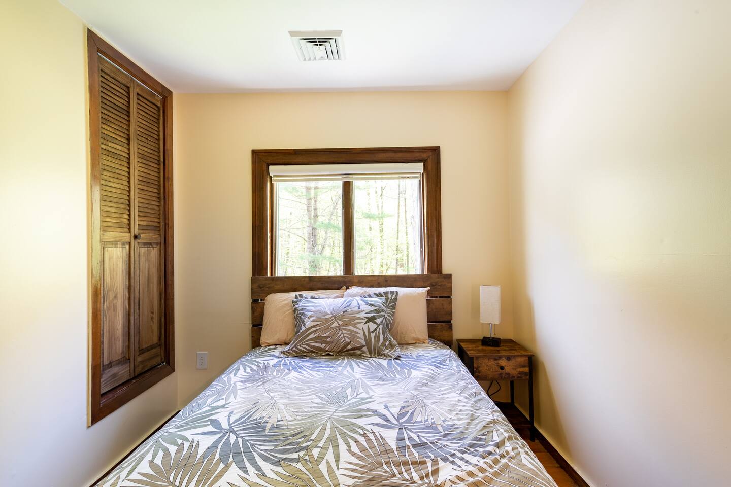 This completely private house is perfect for nature lovers. You’ll feel the serenity as you drive down the private gravel road toward the property. Enjoy the beautiful river across the driveway and catch a glimpse of the local wildlife. Snuggle up on the couch facing the fireplace in the winter as you watch the snow falling quietly around you through the wall of windows. In the summertime, stretch out and watch the stars break through the sky on the expanded deck. Enjoy the telescope, already set up on a tripod, for an authentic stargazing experience. Unwind in the evening with a cinematic experience in the home's private theater. Snuggle up in the plush, massage-enabled electric recliners and indulge in freshly popped popcorn, courtesy of the theater's convenient popcorn maker. This renovated home features 8 bedrooms with stunning river or forest views. 3 of the bedrooms have cozy attic nooks accessed by a ladder, with benches, books, and skylights and pitched roofs to add to the charm, making them perfect for getting lost in a good book or letting your imagination run wild! This house boasts a rustic wooded entry and a fully stocked kitchen with new modern appliances. The outdoor area retains its rustic look, while indoors has beautiful modern furniture, a Gel Fuel-burning and electric fireplace, cathedral ceilings, large windows, recessed lighting, and a propane grill on the deck. The property has broad grassy yards, perfect for frisbee games in the summer, or snowball fights in the winter. Extend your day into a magical night amidst the serene surroundings. Unwind in the beautifully landscaped sitting area, complete with a cozy fire pit and ambient lighting. Roast marshmallows for s'mores, share stories, and create lasting memories under the stars. Nearby, relax and socialize in the spacious 8-person hot tub, perfectly positioned to soak in the tranquility of the surroundings From the spacious floor plan, to the large private decks and yards, to the beautiful river and forest views, this is the perfect home for a relaxing getaway. The property features: - 7 bedrooms with 1 full bed each. - 1 bedroom with a total of 6 twin (bunk) beds. - 3 full bathrooms. - Game room for entertainment. - Movie theater. - Expansive deck with fire pit and grill. - Indoor heated pool open year-round. - Heated hot tub in a beautiful landscape setting. - Trout-filled river right in front of the property. - And many more amenities... Additional air mattresses can also be provided upon request.