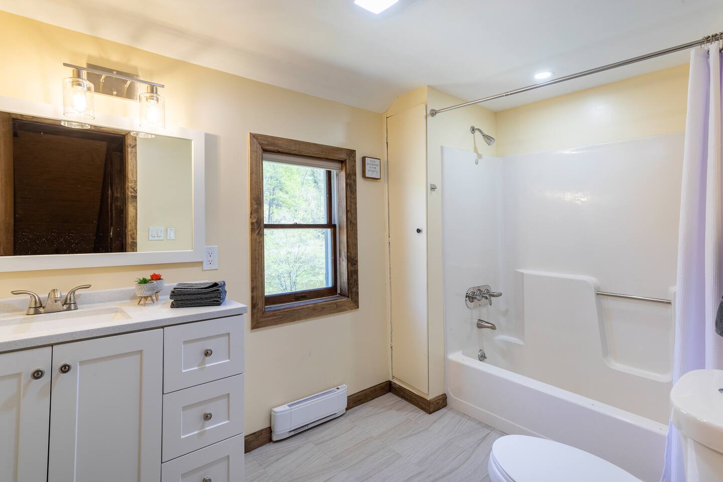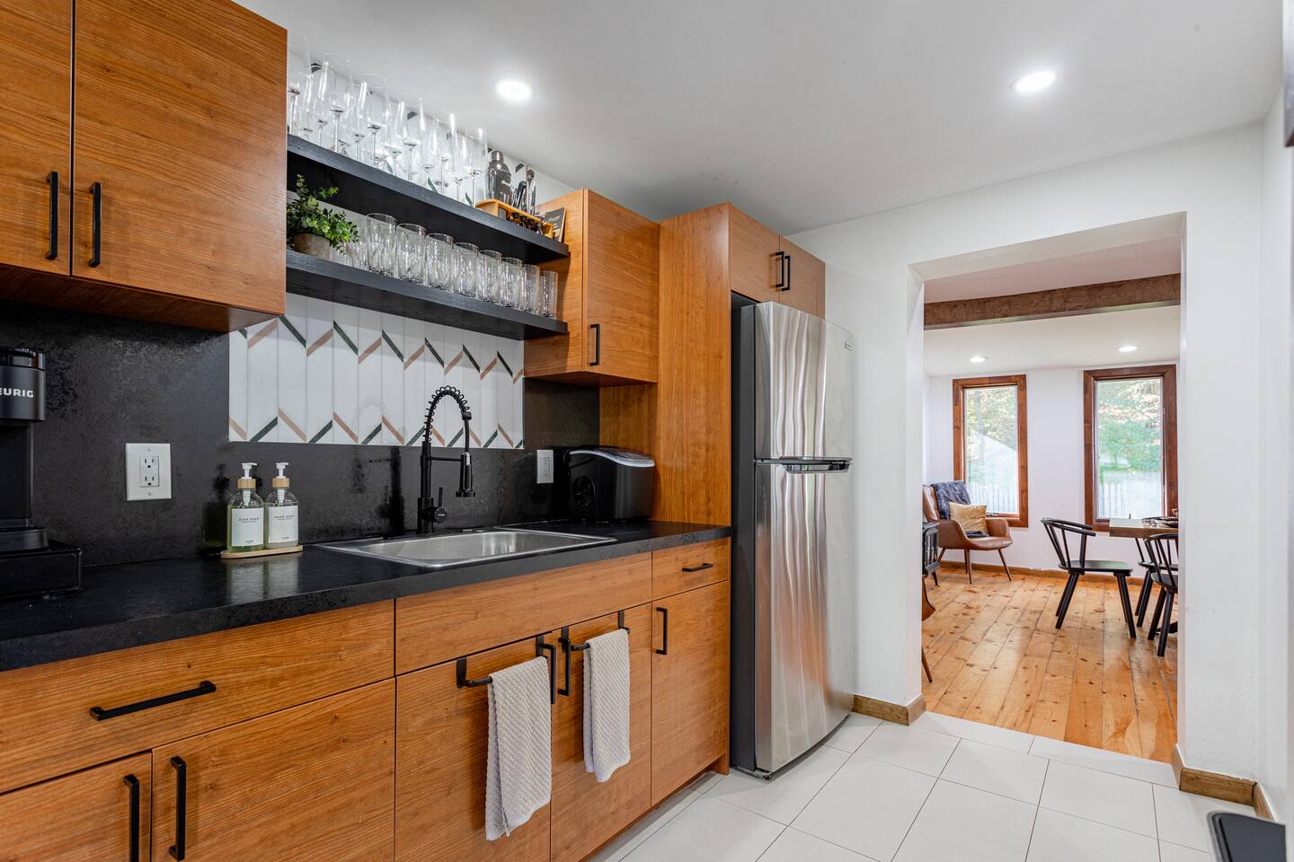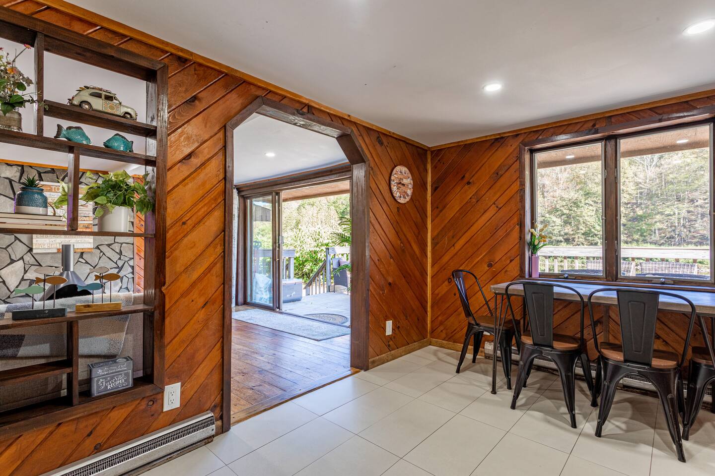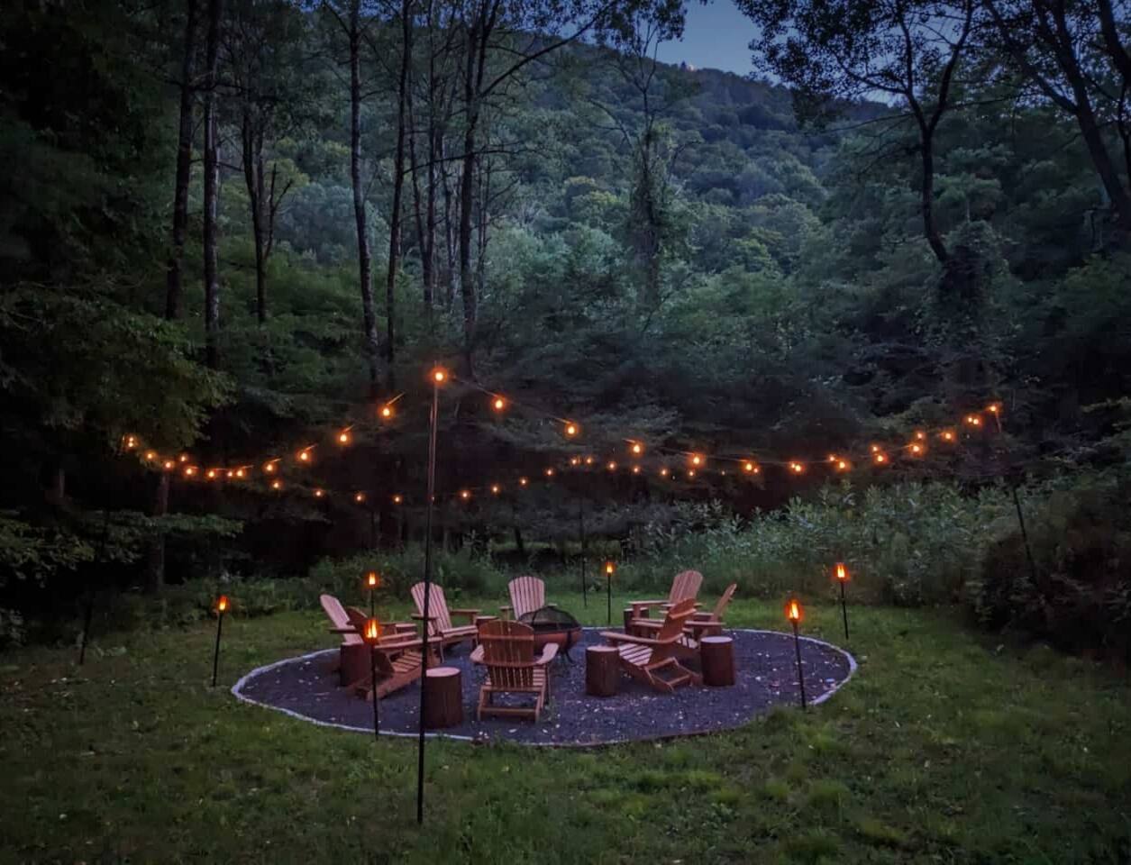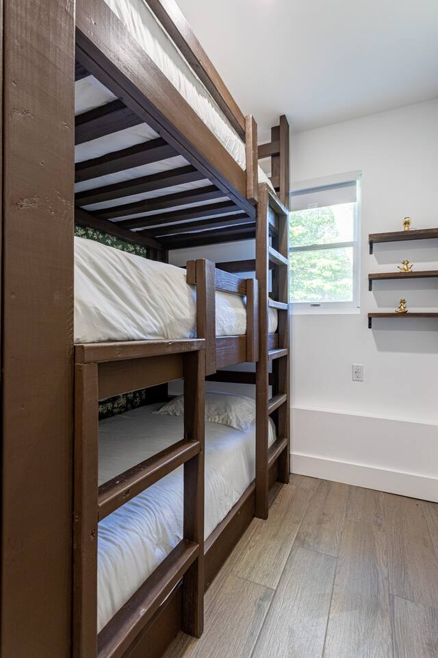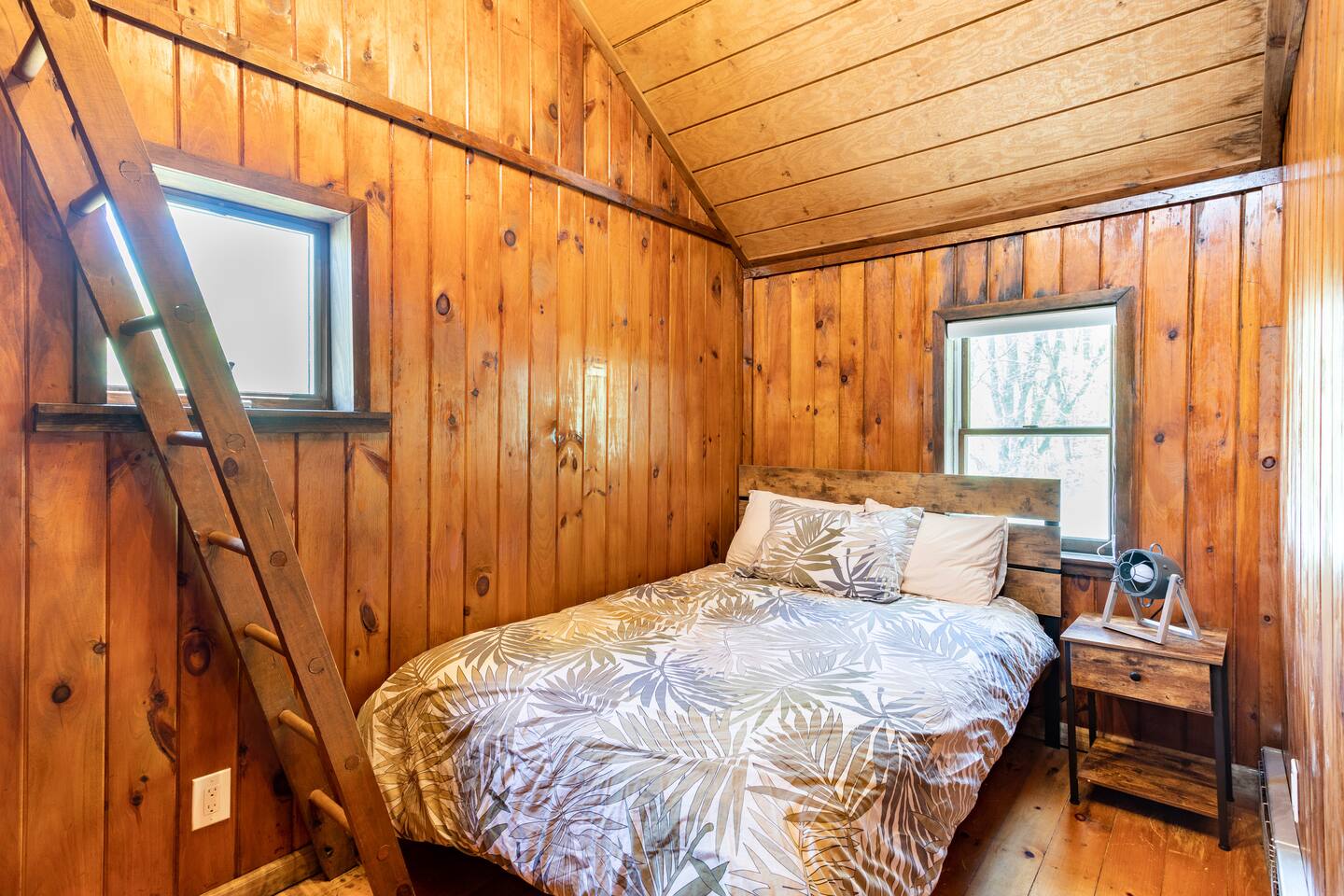This completely private house is perfect for nature lovers. You’ll feel the serenity as you drive down the private gravel road toward the property. Enjoy the beautiful river across the driveway and catch a glimpse of the local wildlife. Snuggle up on the couch facing the fireplace in the winter as you watch the snow falling quietly around you through the wall of windows. In the summertime, stretch out and watch the stars break through the sky on the expanded deck. Enjoy the telescope, already set up on a tripod, for an authentic stargazing experience. Unwind in the evening with a cinematic experience in the home's private theater. Snuggle up in the plush, massage-enabled electric recliners and indulge in freshly popped popcorn, courtesy of the theater's convenient popcorn maker. This renovated home features 8 bedrooms with stunning river or forest views. 3 of the bedrooms have cozy attic nooks accessed by a ladder, with benches, books, and skylights and pitched roofs to add to the charm, making them perfect for getting lost in a good book or letting your imagination run wild! This house boasts a rustic wooded entry and a fully stocked kitchen with new modern appliances. The outdoor area retains its rustic look, while indoors has beautiful modern furniture, a Gel Fuel-burning and electric fireplace, cathedral ceilings, large windows, recessed lighting, and a propane grill on the deck. The property has broad grassy yards, perfect for frisbee games in the summer, or snowball fights in the winter. Extend your day into a magical night amidst the serene surroundings. Unwind in the beautifully landscaped sitting area, complete with a cozy fire pit and ambient lighting. Roast marshmallows for s'mores, share stories, and create lasting memories under the stars. Nearby, relax and socialize in the spacious 8-person hot tub, perfectly positioned to soak in the tranquility of the surroundings From the spacious floor plan, to the large private decks and yards, to the beautiful river and forest views, this is the perfect home for a relaxing getaway. The property features: - 7 bedrooms with 1 full bed each. - 1 bedroom with a total of 6 twin (bunk) beds. - 3 full bathrooms. - Game room for entertainment. - Movie theater. - Expansive deck with fire pit and grill. - Indoor heated pool open year-round. - Heated hot tub in a beautiful landscape setting. - Trout-filled river right in front of the property. - And many more amenities... Additional air mattresses can also be provided upon request.