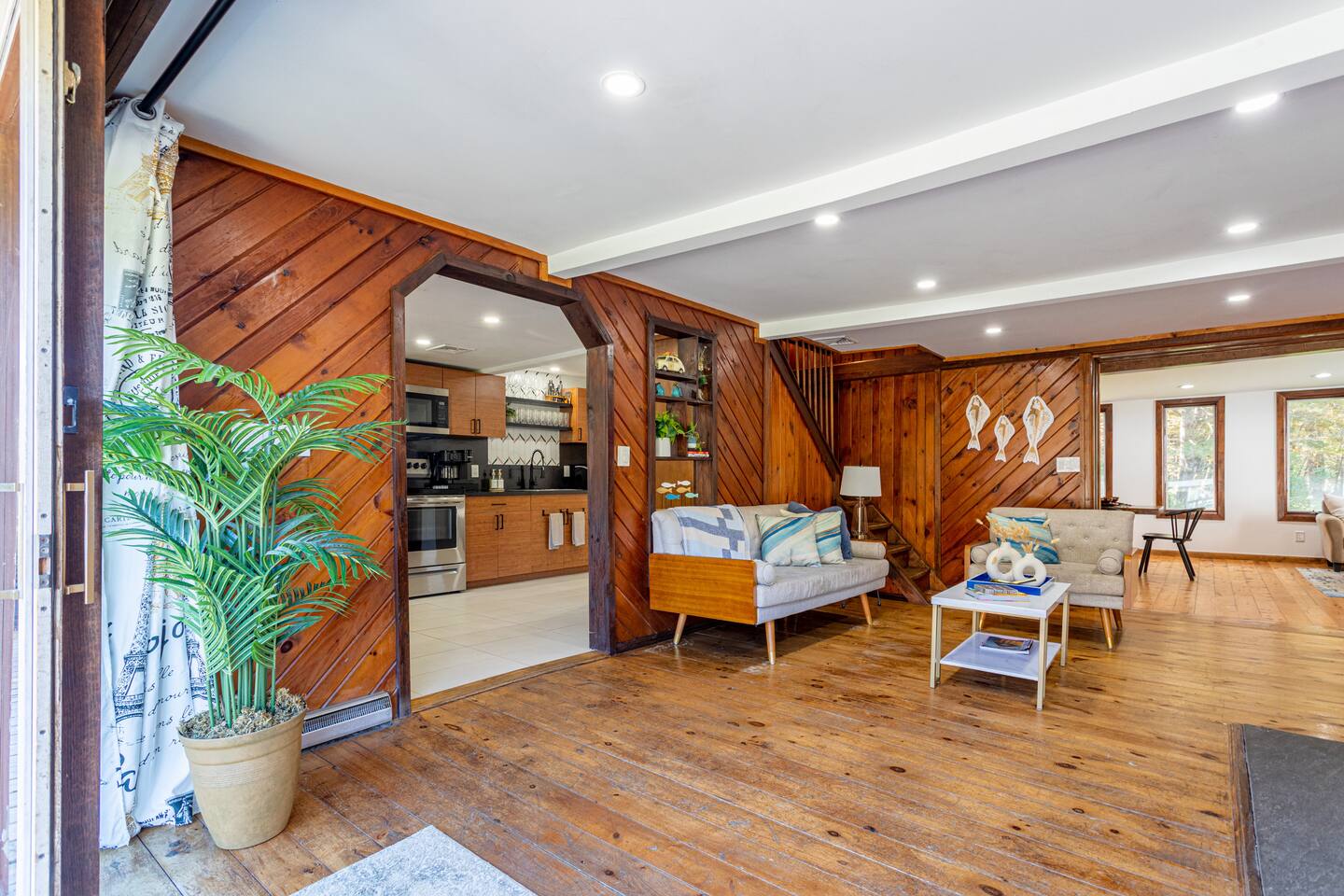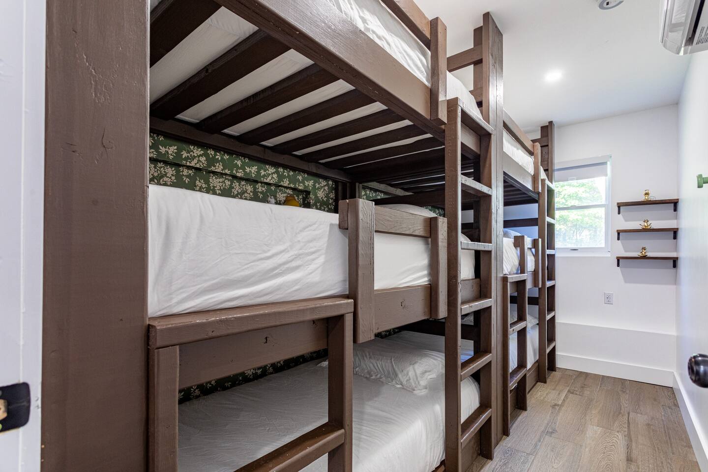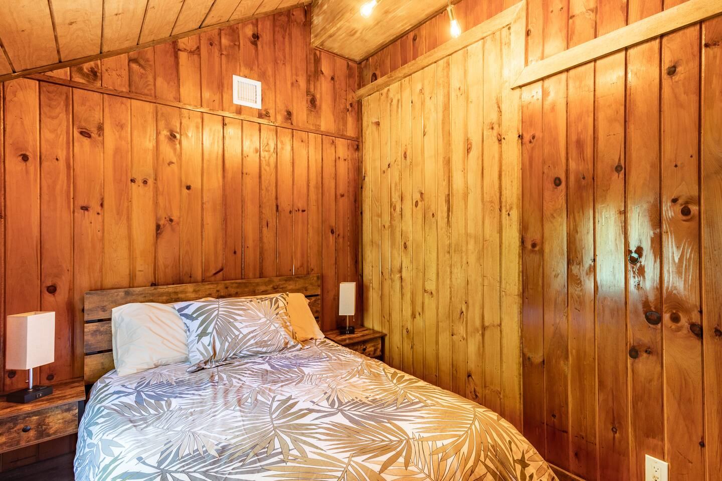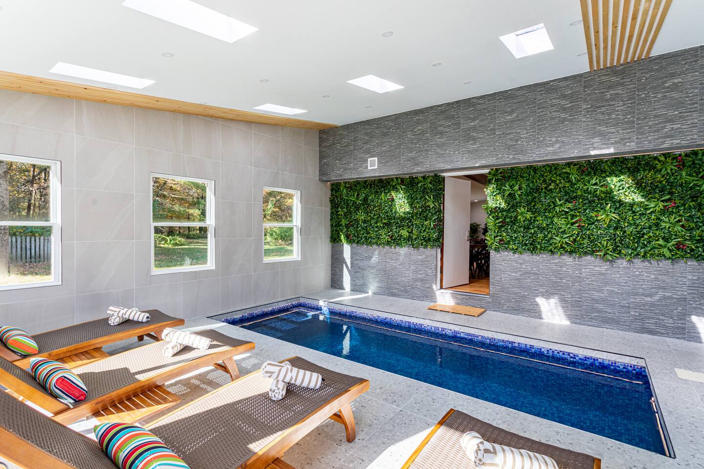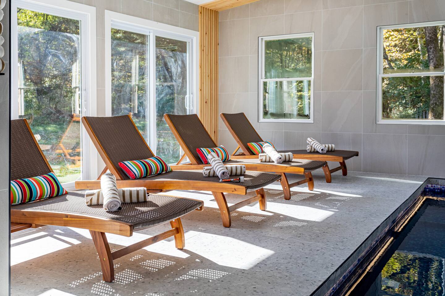 This completely private house is perfect for nature lovers. You’ll feel the serenity as you drive down the private gravel road toward the property. Enjoy the beautiful river across the driveway and catch a glimpse of the local wildlife. Snuggle up on the couch facing the fireplace in the winter as you watch the snow falling quietly around you through the wall of windows. In the summertime, stretch out and watch the stars break through the sky on the expanded deck. Enjoy the telescope, already set up on a tripod, for an authentic stargazing experience. Unwind in the evening with a cinematic experience in the home's private theater. Snuggle up in the plush, massage-enabled electric recliners and indulge in freshly popped popcorn, courtesy of the theater's convenient popcorn maker. This renovated home features 8 bedrooms with stunning river or forest views. 3 of the bedrooms have cozy attic nooks accessed by a ladder, with benches, books, and skylights and pitched roofs to add to the charm, making them perfect for getting lost in a good book or letting your imagination run wild! This house boasts a rustic wooded entry and a fully stocked kitchen with new modern appliances. The outdoor area retains its rustic look, while indoors has beautiful modern furniture, a Gel Fuel-burning and electric fireplace, cathedral ceilings, large windows, recessed lighting, and a propane grill on the deck. The property has broad grassy yards, perfect for frisbee games in the summer, or snowball fights in the winter. Extend your day into a magical night amidst the serene surroundings. Unwind in the beautifully landscaped sitting area, complete with a cozy fire pit and ambient lighting. Roast marshmallows for s'mores, share stories, and create lasting memories under the stars. Nearby, relax and socialize in the spacious 8-person hot tub, perfectly positioned to soak in the tranquility of the surroundings From the spacious floor plan, to the large private decks and yards, to the beautiful river and forest views, this is the perfect home for a relaxing getaway. The property features: - 7 bedrooms with 1 full bed each. - 1 bedroom with a total of 6 twin (bunk) beds. - 3 full bathrooms. - Game room for entertainment. - Movie theater. - Expansive deck with fire pit and grill. - Indoor heated pool open year-round. - Heated hot tub in a beautiful landscape setting. - Trout-filled river right in front of the property. - And many more amenities... Additional air mattresses can also be provided upon request.