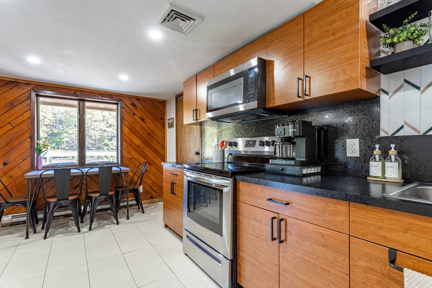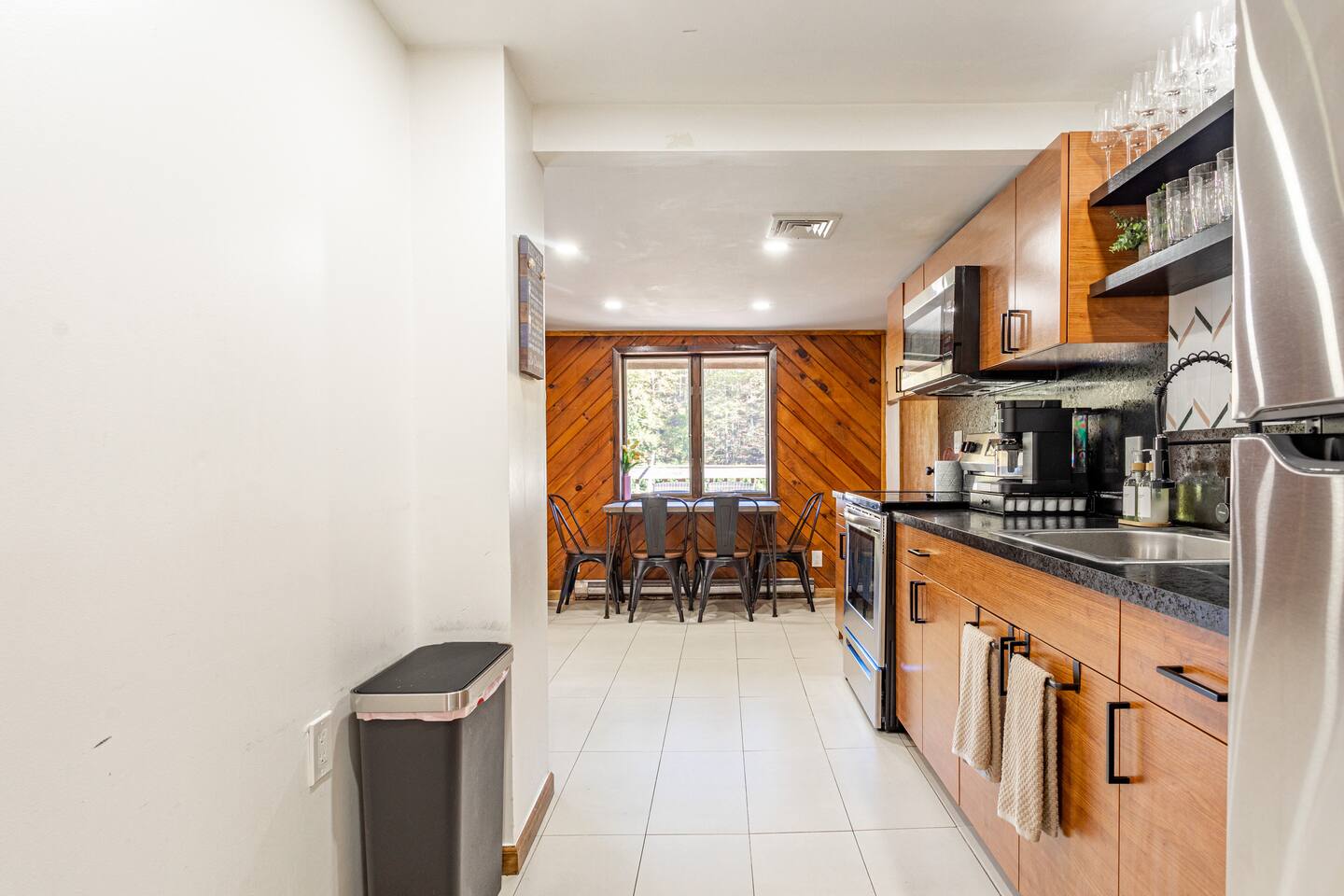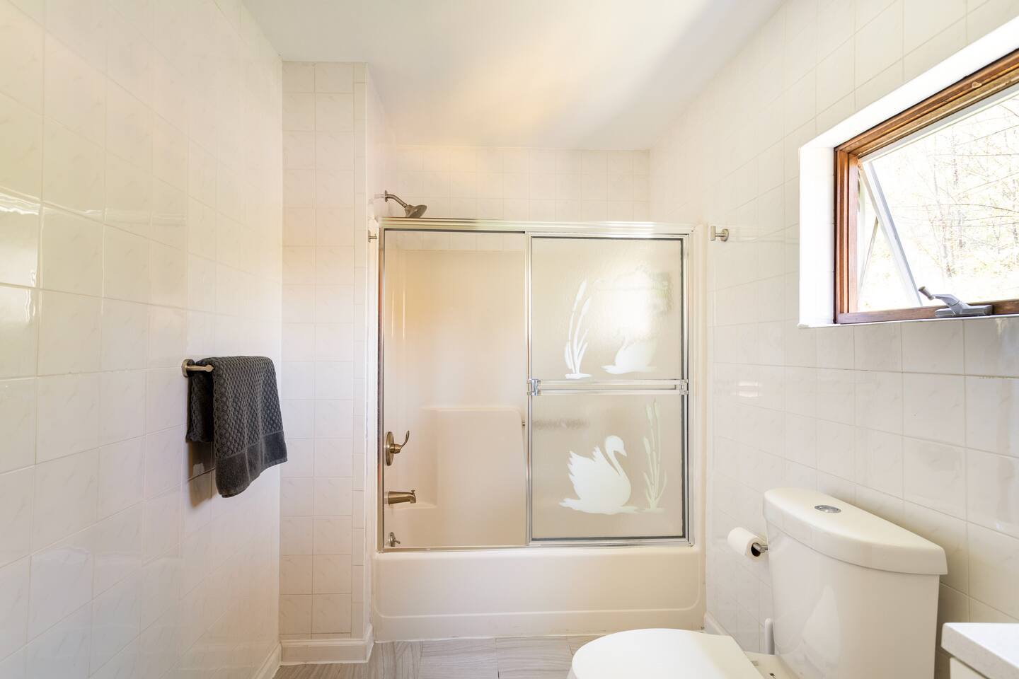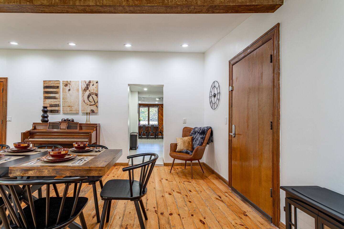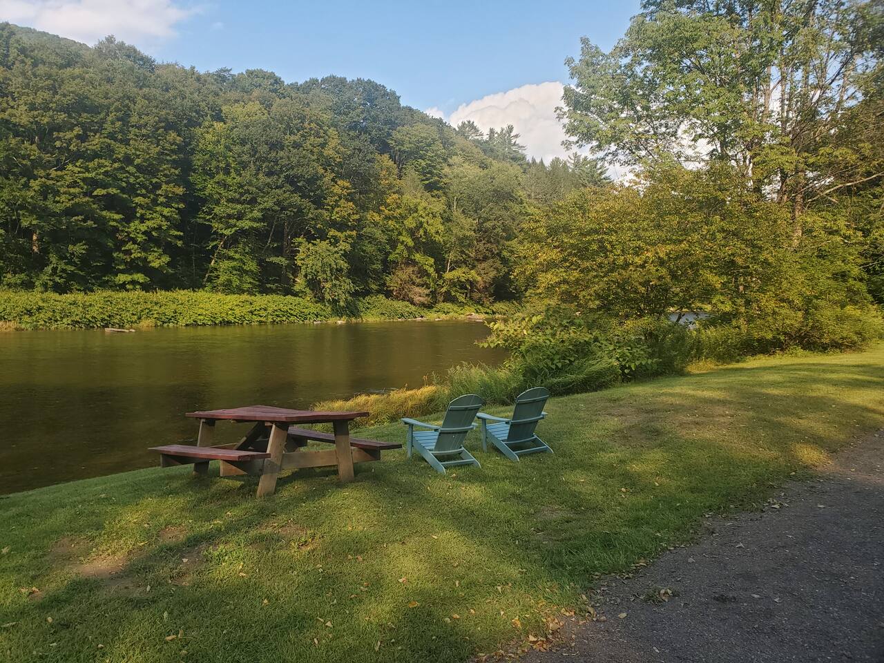 This completely private house is perfect for nature lovers. You’ll feel the serenity as you drive down the private gravel road toward the property. Enjoy the beautiful river across the driveway and catch a glimpse of the local wildlife. Snuggle up on the couch facing the fireplace in the winter as you watch the snow falling quietly around you through the wall of windows. In the summertime, stretch out and watch the stars break through the sky on the expanded deck. Enjoy the telescope, already set up on a tripod, for an authentic stargazing experience. Unwind in the evening with a cinematic experience in the home's private theater. Snuggle up in the plush, massage-enabled electric recliners and indulge in freshly popped popcorn, courtesy of the theater's convenient popcorn maker. This renovated home features 8 bedrooms with stunning river or forest views. 3 of the bedrooms have cozy attic nooks accessed by a ladder, with benches, books, and skylights and pitched roofs to add to the charm, making them perfect for getting lost in a good book or letting your imagination run wild! This house boasts a rustic wooded entry and a fully stocked kitchen with new modern appliances. The outdoor area retains its rustic look, while indoors has beautiful modern furniture, a Gel Fuel-burning and electric fireplace, cathedral ceilings, large windows, recessed lighting, and a propane grill on the deck. The property has broad grassy yards, perfect for frisbee games in the summer, or snowball fights in the winter. Extend your day into a magical night amidst the serene surroundings. Unwind in the beautifully landscaped sitting area, complete with a cozy fire pit and ambient lighting. Roast marshmallows for s'mores, share stories, and create lasting memories under the stars. Nearby, relax and socialize in the spacious 8-person hot tub, perfectly positioned to soak in the tranquility of the surroundings From the spacious floor plan, to the large private decks and yards, to the beautiful river and forest views, this is the perfect home for a relaxing getaway. The property features: - 7 bedrooms with 1 full bed each. - 1 bedroom with a total of 6 twin (bunk) beds. - 3 full bathrooms. - Game room for entertainment. - Movie theater. - Expansive deck with fire pit and grill. - Indoor heated pool open year-round. - Heated hot tub in a beautiful landscape setting. - Trout-filled river right in front of the property. - And many more amenities... Additional air mattresses can also be provided upon request.