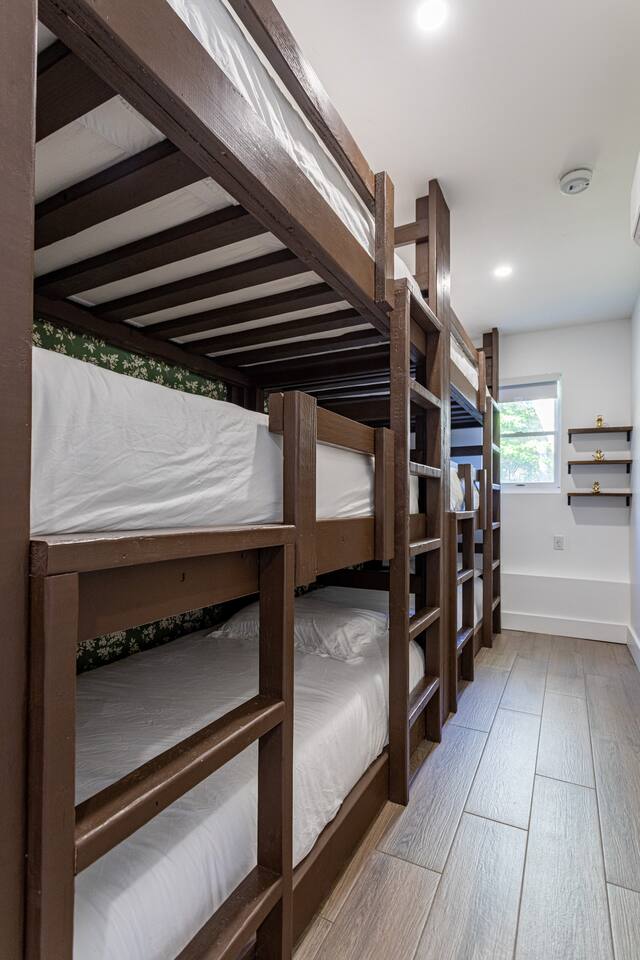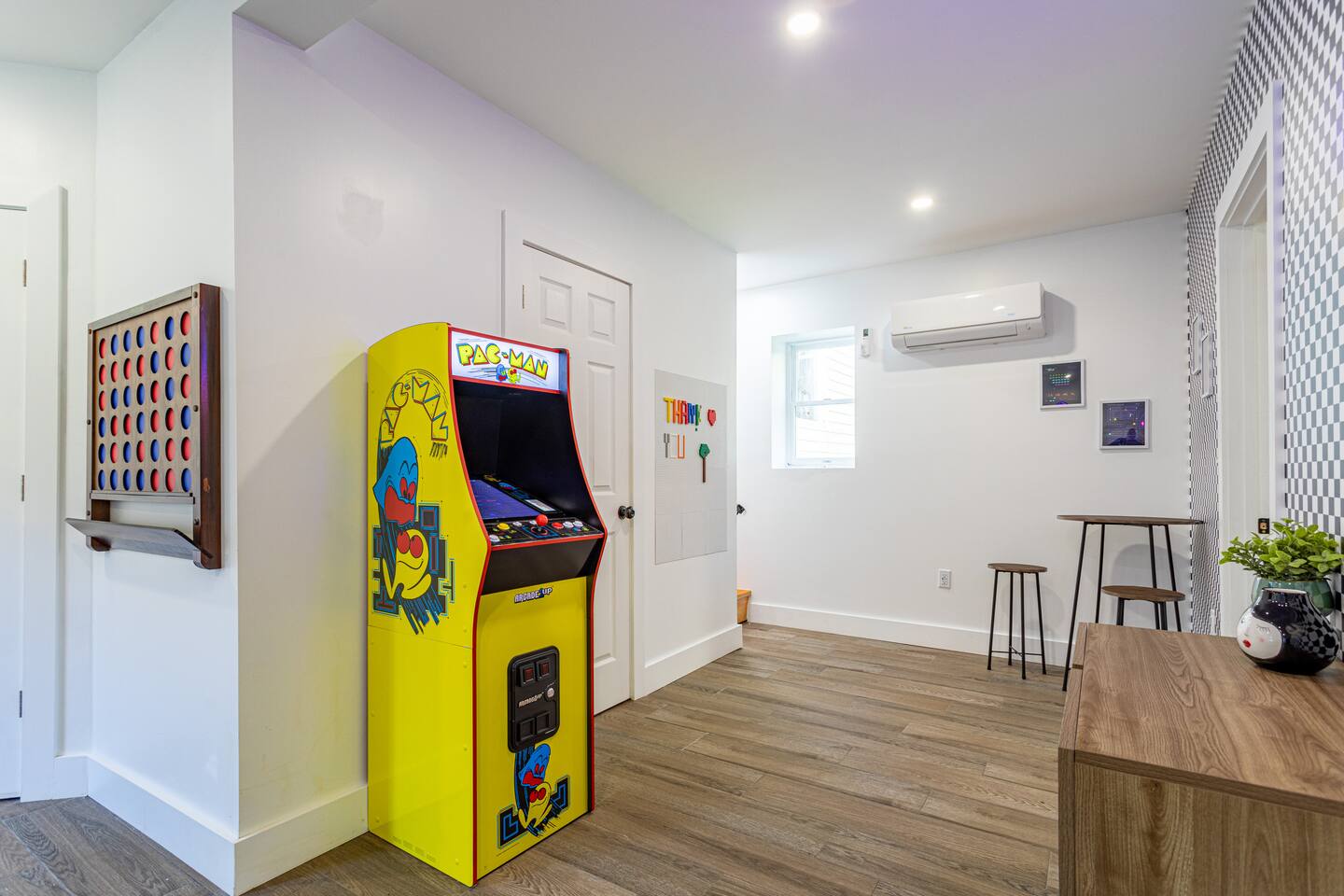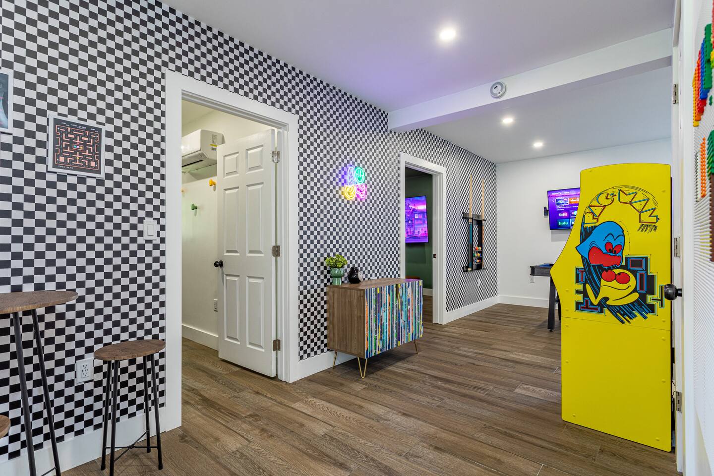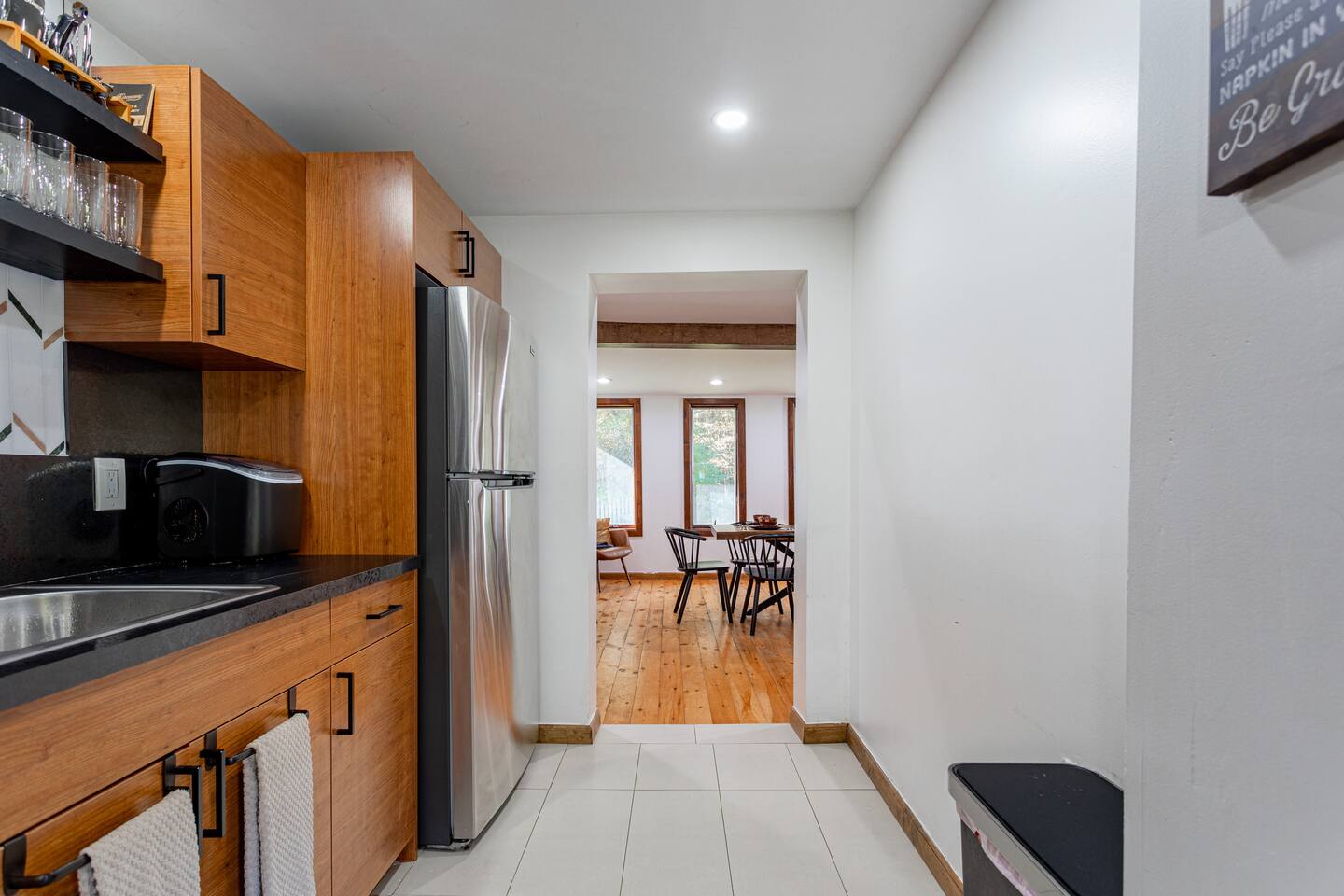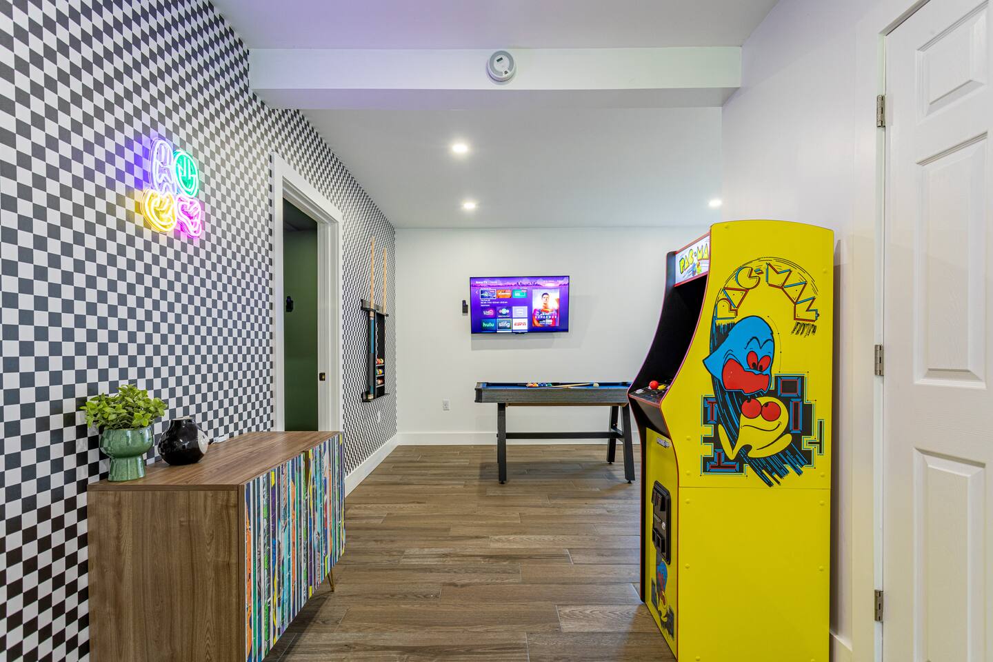 This completely private house is perfect for nature lovers. You’ll feel the serenity as you drive down the private gravel road toward the property. Enjoy the beautiful river across the driveway and catch a glimpse of the local wildlife. Snuggle up on the couch facing the fireplace in the winter as you watch the snow falling quietly around you through the wall of windows. In the summertime, stretch out and watch the stars break through the sky on the expanded deck. Enjoy the telescope, already set up on a tripod, for an authentic stargazing experience. Unwind in the evening with a cinematic experience in the home's private theater. Snuggle up in the plush, massage-enabled electric recliners and indulge in freshly popped popcorn, courtesy of the theater's convenient popcorn maker. This renovated home features 8 bedrooms with stunning river or forest views. 3 of the bedrooms have cozy attic nooks accessed by a ladder, with benches, books, and skylights and pitched roofs to add to the charm, making them perfect for getting lost in a good book or letting your imagination run wild! This house boasts a rustic wooded entry and a fully stocked kitchen with new modern appliances. The outdoor area retains its rustic look, while indoors has beautiful modern furniture, a Gel Fuel-burning and electric fireplace, cathedral ceilings, large windows, recessed lighting, and a propane grill on the deck. The property has broad grassy yards, perfect for frisbee games in the summer, or snowball fights in the winter. Extend your day into a magical night amidst the serene surroundings. Unwind in the beautifully landscaped sitting area, complete with a cozy fire pit and ambient lighting. Roast marshmallows for s'mores, share stories, and create lasting memories under the stars. Nearby, relax and socialize in the spacious 8-person hot tub, perfectly positioned to soak in the tranquility of the surroundings From the spacious floor plan, to the large private decks and yards, to the beautiful river and forest views, this is the perfect home for a relaxing getaway. The property features: - 7 bedrooms with 1 full bed each. - 1 bedroom with a total of 6 twin (bunk) beds. - 3 full bathrooms. - Game room for entertainment. - Movie theater. - Expansive deck with fire pit and grill. - Indoor heated pool open year-round. - Heated hot tub in a beautiful landscape setting. - Trout-filled river right in front of the property. - And many more amenities... Additional air mattresses can also be provided upon request.