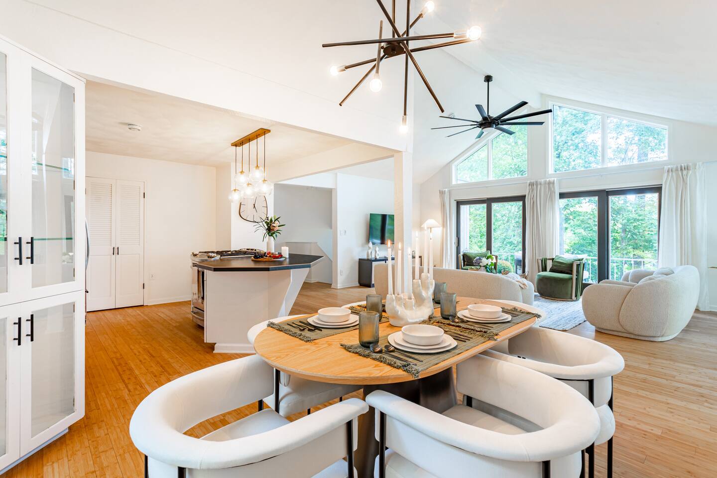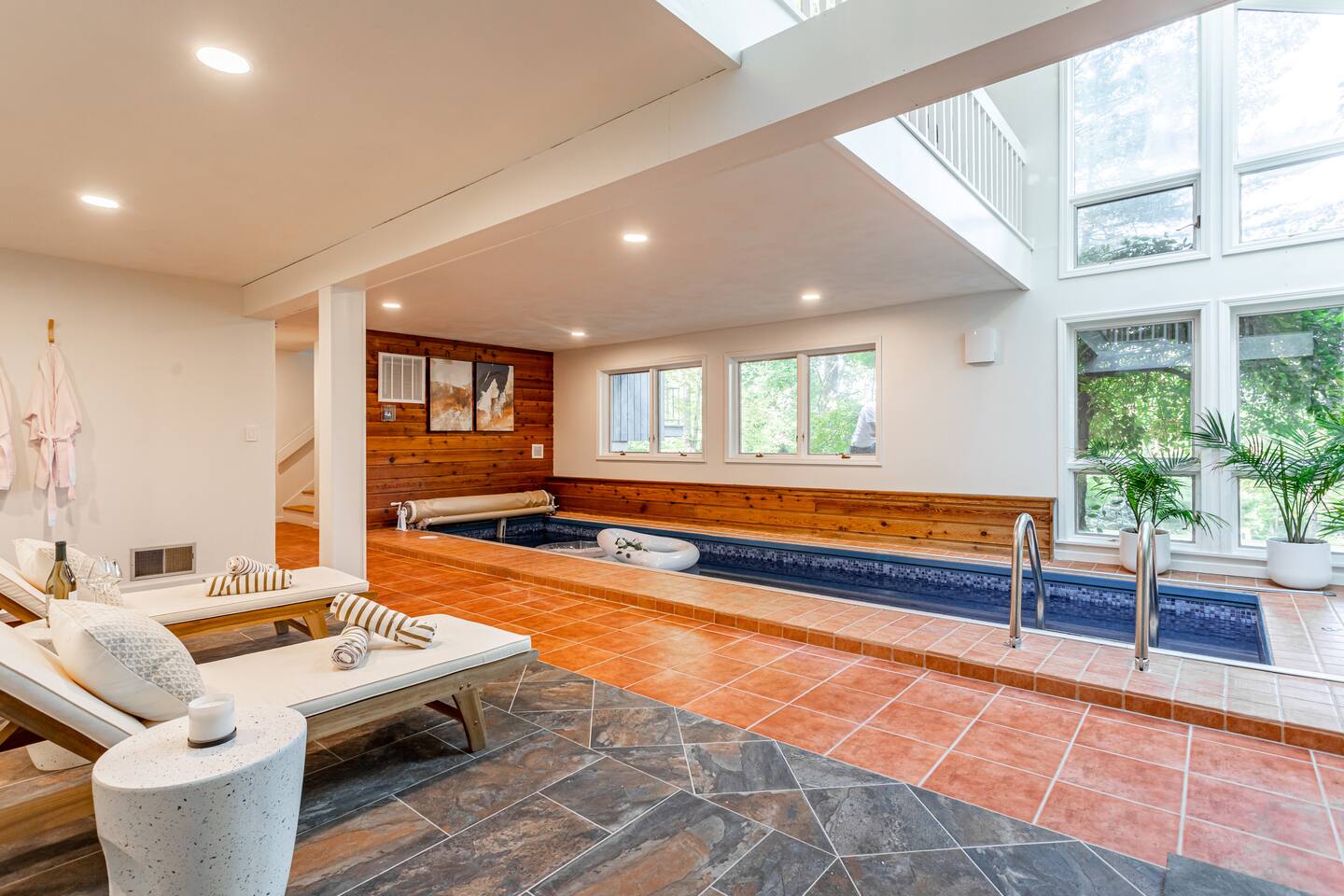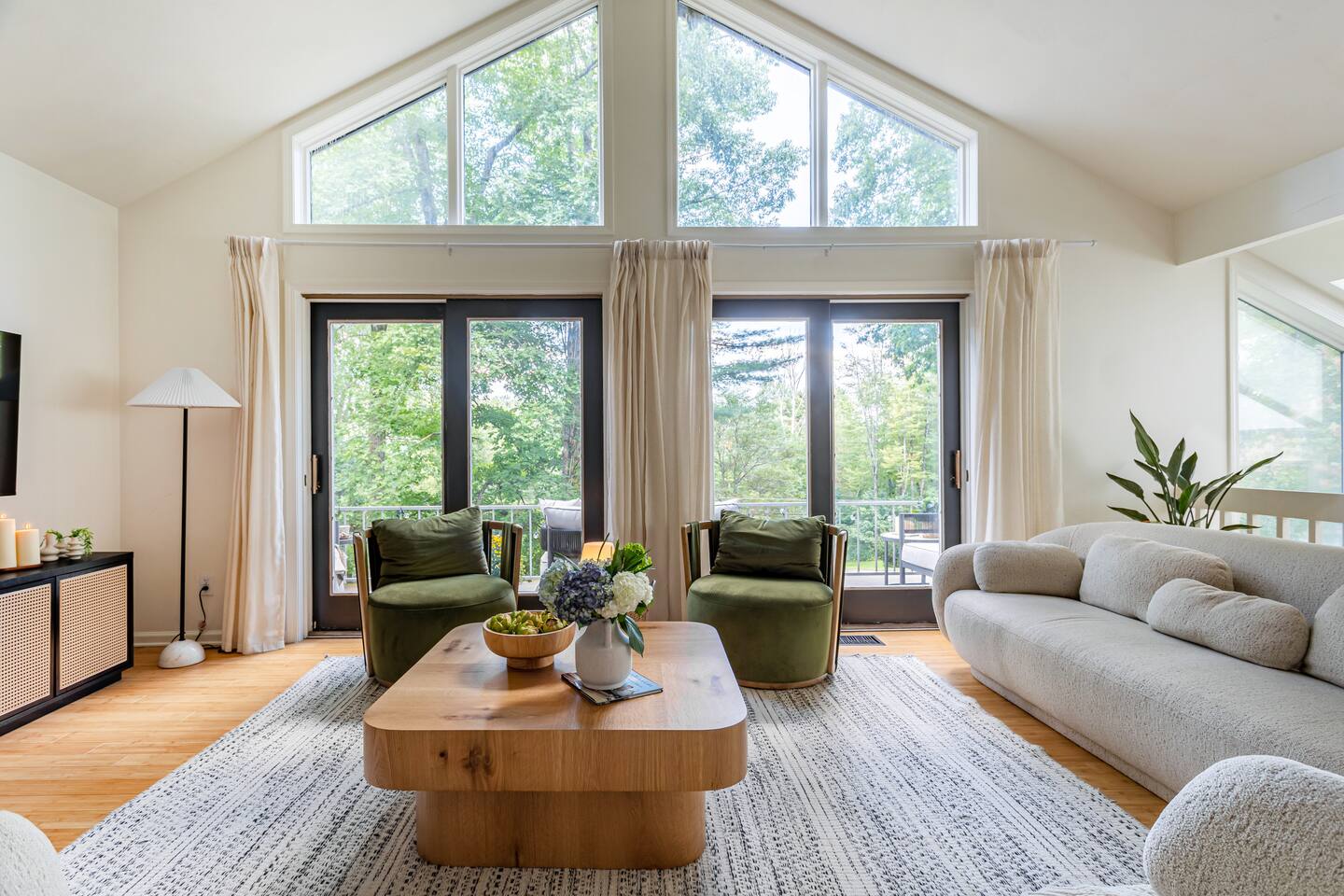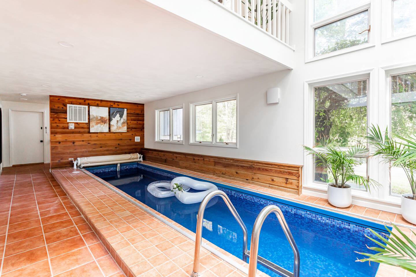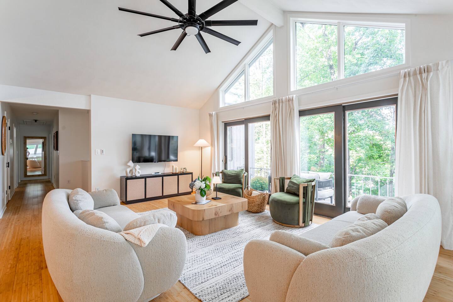 Ideal for couples and small families alike, this peaceful home offers a relaxing vacation experience. Unwind in the comfortable living spaces, surrounded by nature's splendor. The property features expansive decks with gorgeous views, perfect for nature lovers. The circular driveway and serene surroundings create a sense of calm, while the expansive floor-to-ceiling windows offer breathtaking views of the surrounding landscape. This resort-style home boasts: - Beautiful, high-end new furniture throughout - A fully stocked kitchen with updated appliances - Cathedral ceilings and large windows - Beautiful, solid bamboo hardwood flooring - 3 newly remodeled bathrooms - New high-quality modern lighting throughout - Recessed lighting and propane grill on the deck - Patio featuring a propane fire pit for cozy nighttime - Broad grassy yards perfect for outdoor activities - 3 bedrooms, including a master suite with a king bed, an ensuite bathroom, and a jacuzzi hot tub - 2 additional bedrooms with queen beds - Fine cotton linens and luxurious amenities throughout Experience the Ultimate in Relaxation! Enjoy breathtaking sunrise views from the East-facing front balcony, sunset views from the back deck, and relax in the spa-quality jetted tub. Take a dip in the indoor heated pool that is open year-round! Book your stay today and experience the ultimate in relaxation and tranquility.