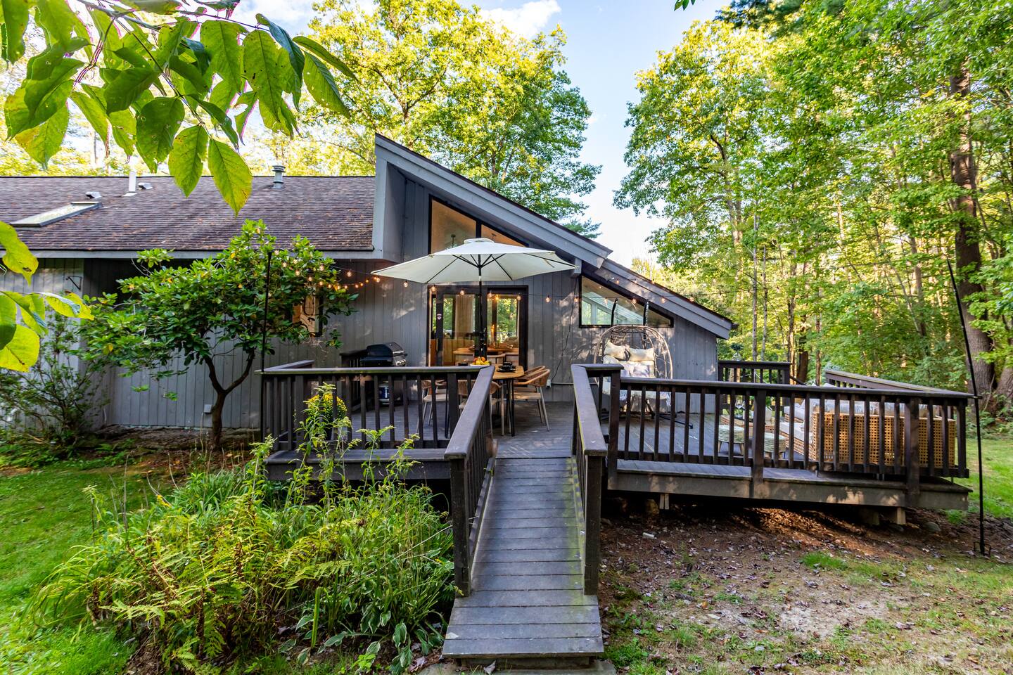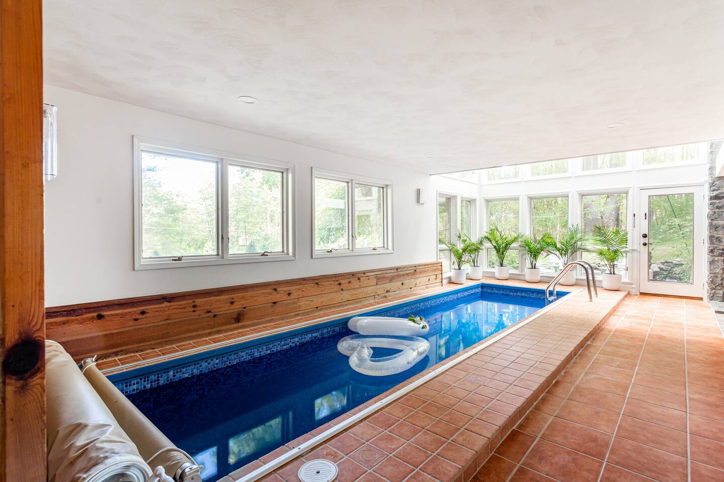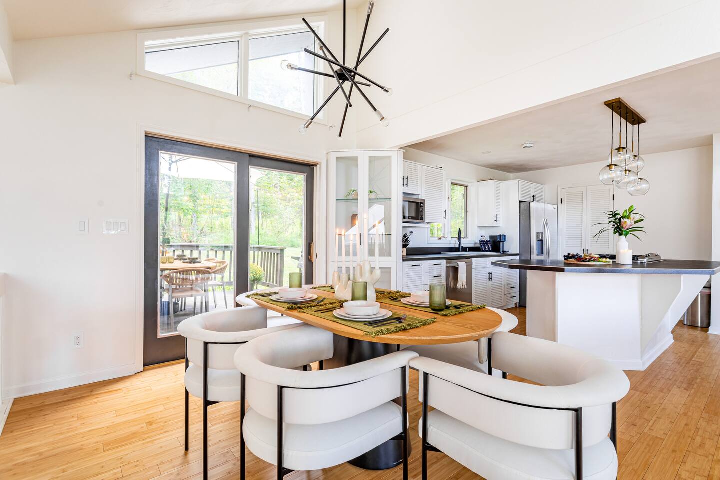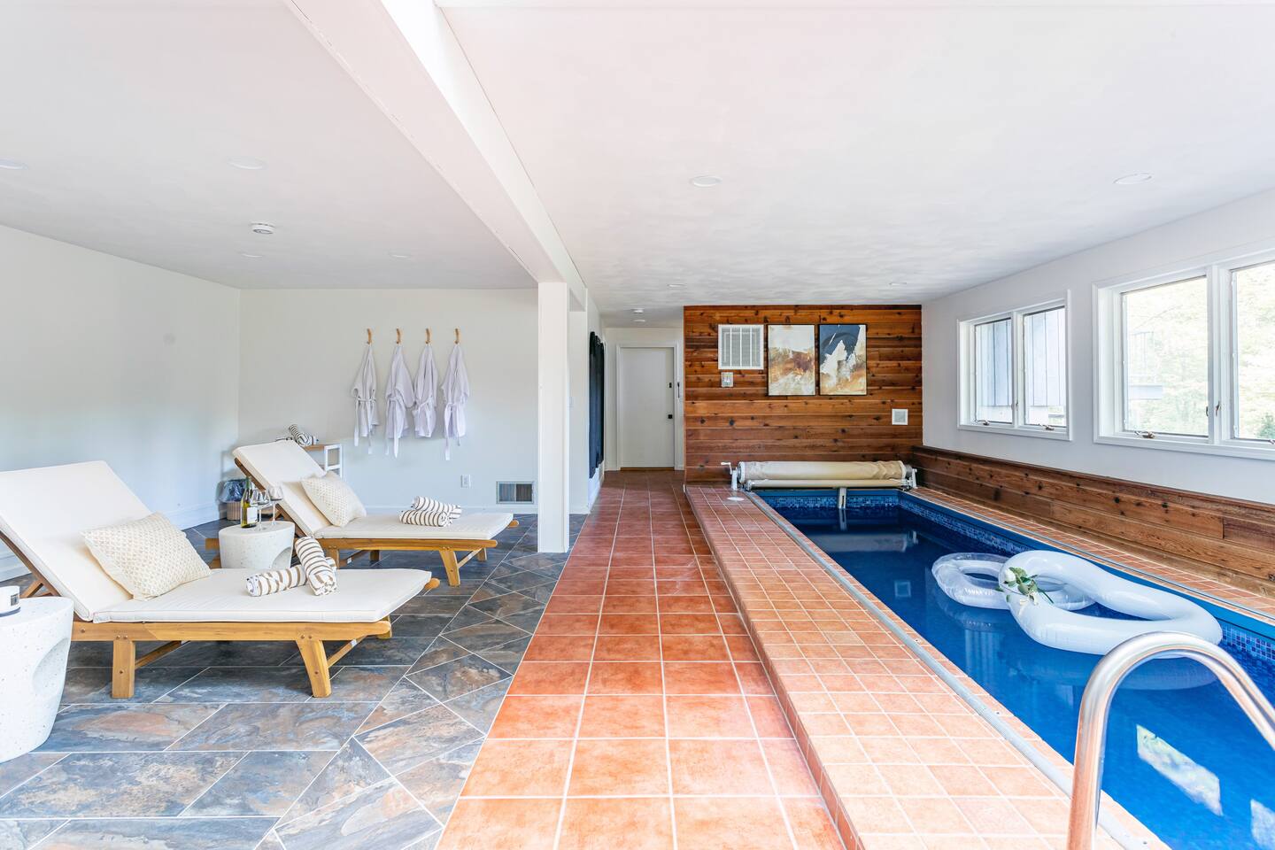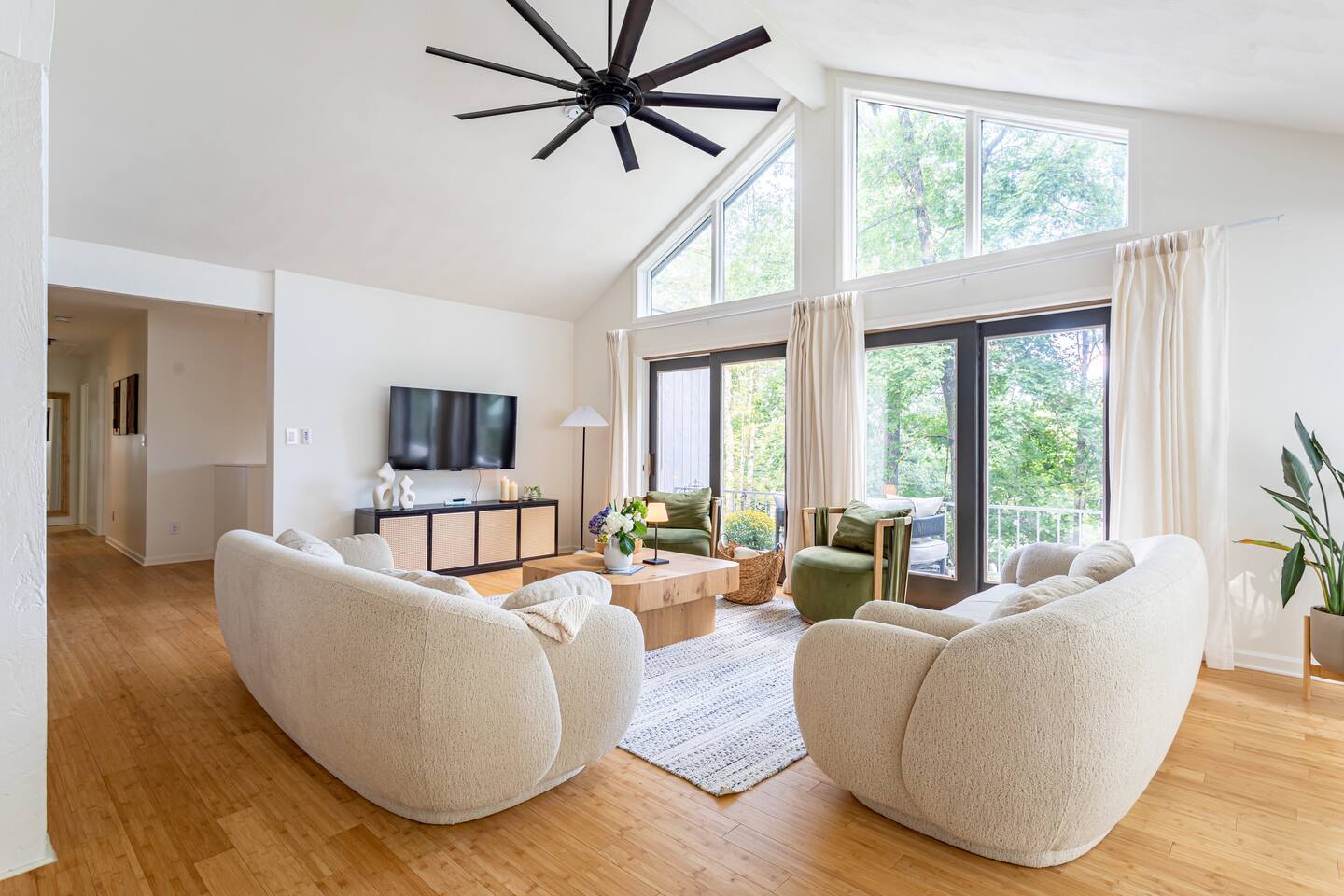 Ideal for couples and small families alike, this peaceful home offers a relaxing vacation experience. Unwind in the comfortable living spaces, surrounded by nature's splendor. The property features expansive decks with gorgeous views, perfect for nature lovers. The circular driveway and serene surroundings create a sense of calm, while the expansive floor-to-ceiling windows offer breathtaking views of the surrounding landscape. This resort-style home boasts: - Beautiful, high-end new furniture throughout - A fully stocked kitchen with updated appliances - Cathedral ceilings and large windows - Beautiful, solid bamboo hardwood flooring - 3 newly remodeled bathrooms - New high-quality modern lighting throughout - Recessed lighting and propane grill on the deck - Patio featuring a propane fire pit for cozy nighttime - Broad grassy yards perfect for outdoor activities - 3 bedrooms, including a master suite with a king bed, an ensuite bathroom, and a jacuzzi hot tub - 2 additional bedrooms with queen beds - Fine cotton linens and luxurious amenities throughout Experience the Ultimate in Relaxation! Enjoy breathtaking sunrise views from the East-facing front balcony, sunset views from the back deck, and relax in the spa-quality jetted tub. Take a dip in the indoor heated pool that is open year-round! Book your stay today and experience the ultimate in relaxation and tranquility.