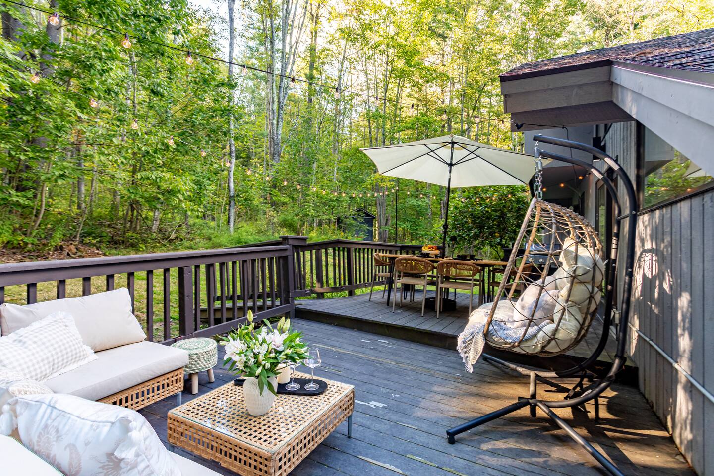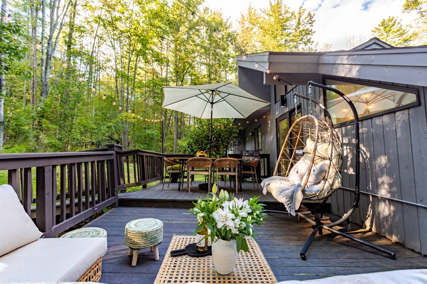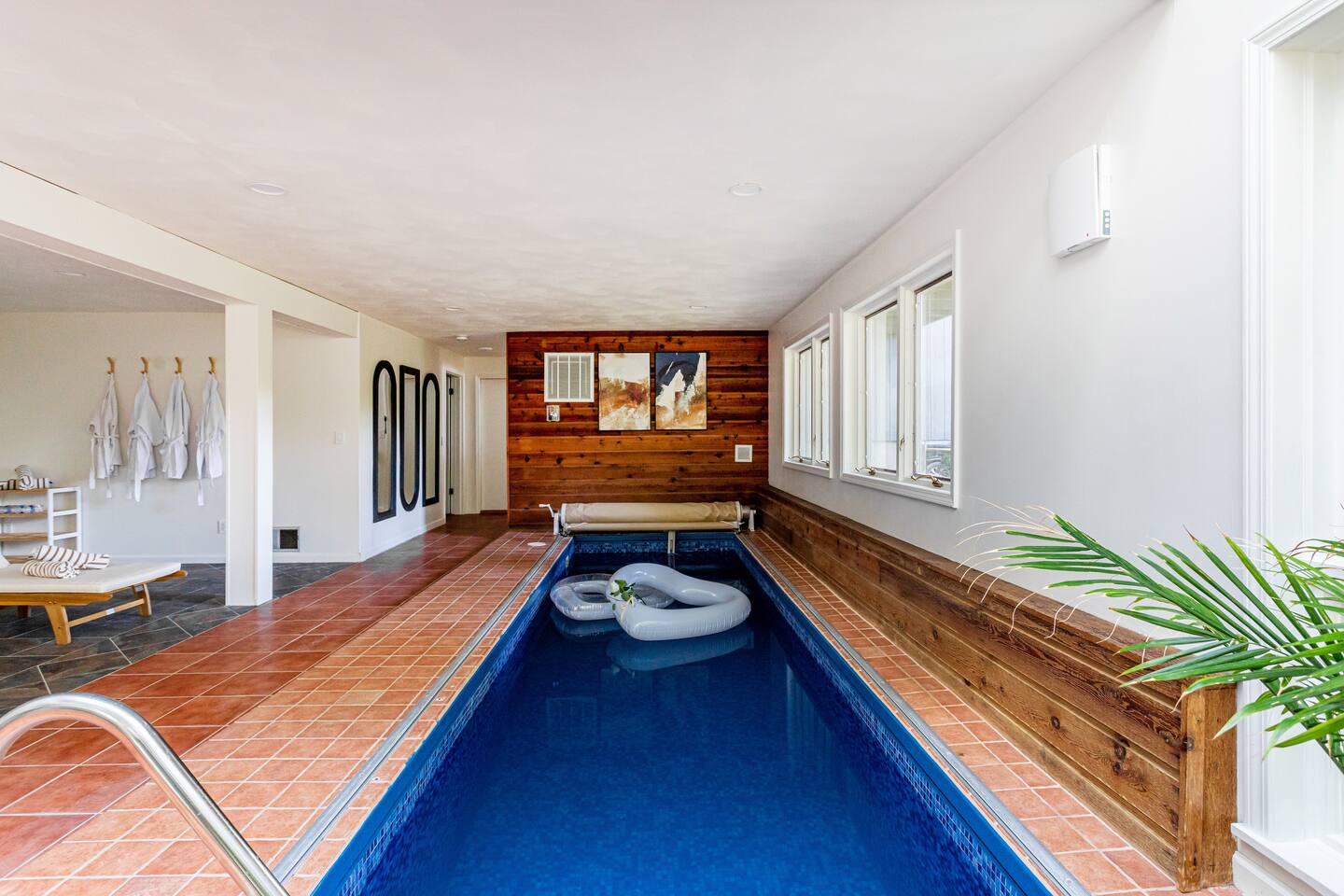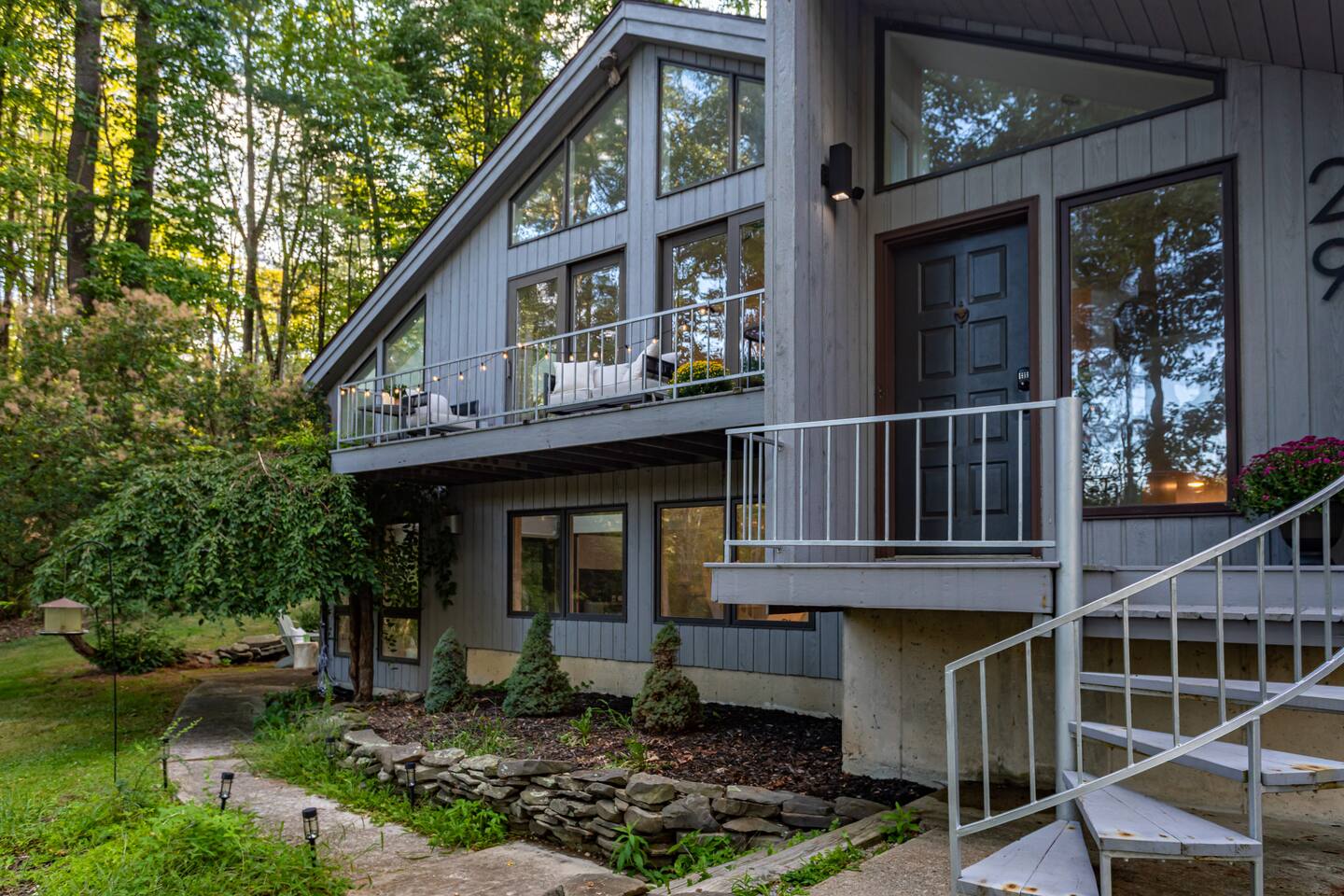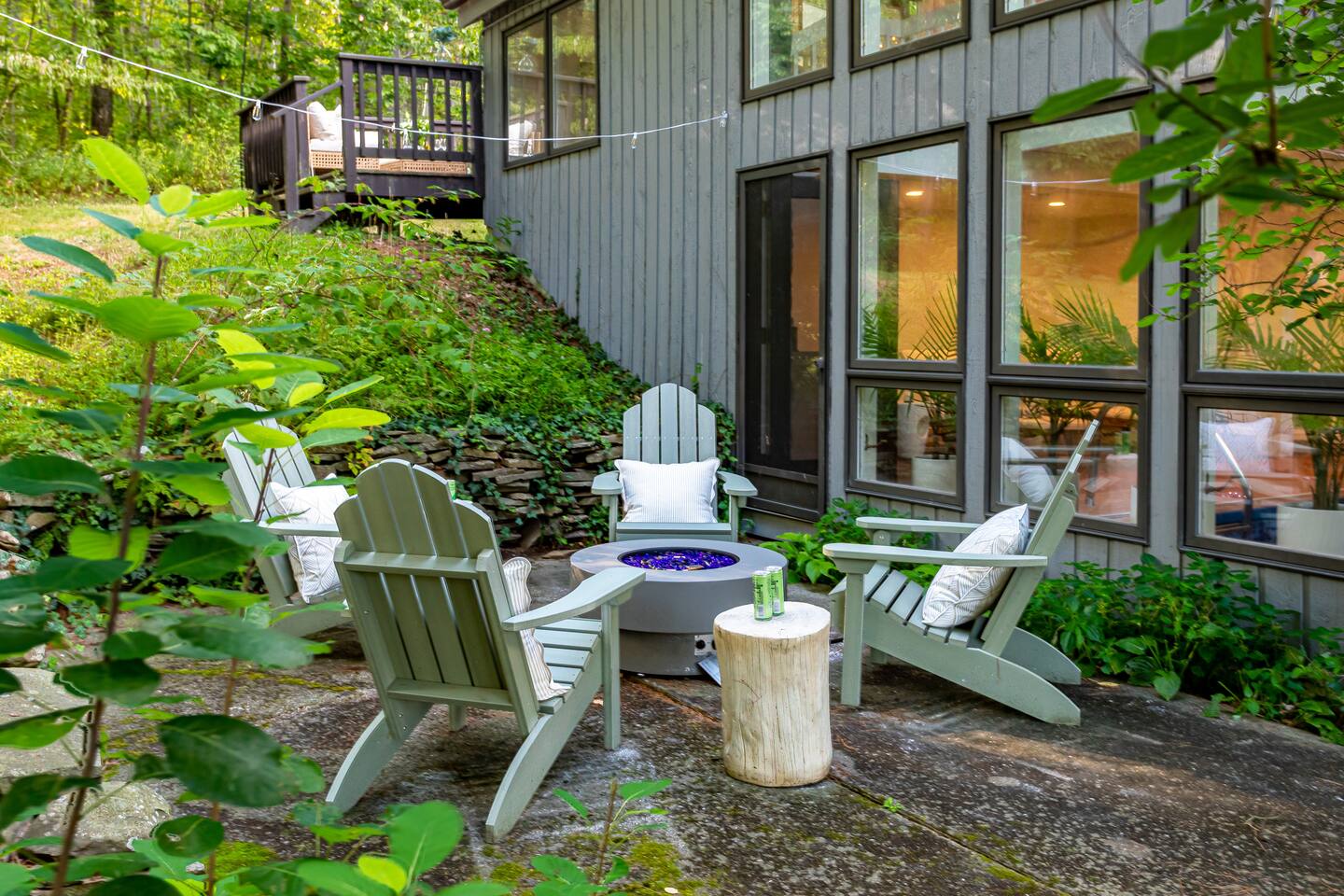 Ideal for couples and small families alike, this peaceful home offers a relaxing vacation experience. Unwind in the comfortable living spaces, surrounded by nature's splendor. The property features expansive decks with gorgeous views, perfect for nature lovers. The circular driveway and serene surroundings create a sense of calm, while the expansive floor-to-ceiling windows offer breathtaking views of the surrounding landscape. This resort-style home boasts: - Beautiful, high-end new furniture throughout - A fully stocked kitchen with updated appliances - Cathedral ceilings and large windows - Beautiful, solid bamboo hardwood flooring - 3 newly remodeled bathrooms - New high-quality modern lighting throughout - Recessed lighting and propane grill on the deck - Patio featuring a propane fire pit for cozy nighttime - Broad grassy yards perfect for outdoor activities - 3 bedrooms, including a master suite with a king bed, an ensuite bathroom, and a jacuzzi hot tub - 2 additional bedrooms with queen beds - Fine cotton linens and luxurious amenities throughout Experience the Ultimate in Relaxation! Enjoy breathtaking sunrise views from the East-facing front balcony, sunset views from the back deck, and relax in the spa-quality jetted tub. Take a dip in the indoor heated pool that is open year-round! Book your stay today and experience the ultimate in relaxation and tranquility.