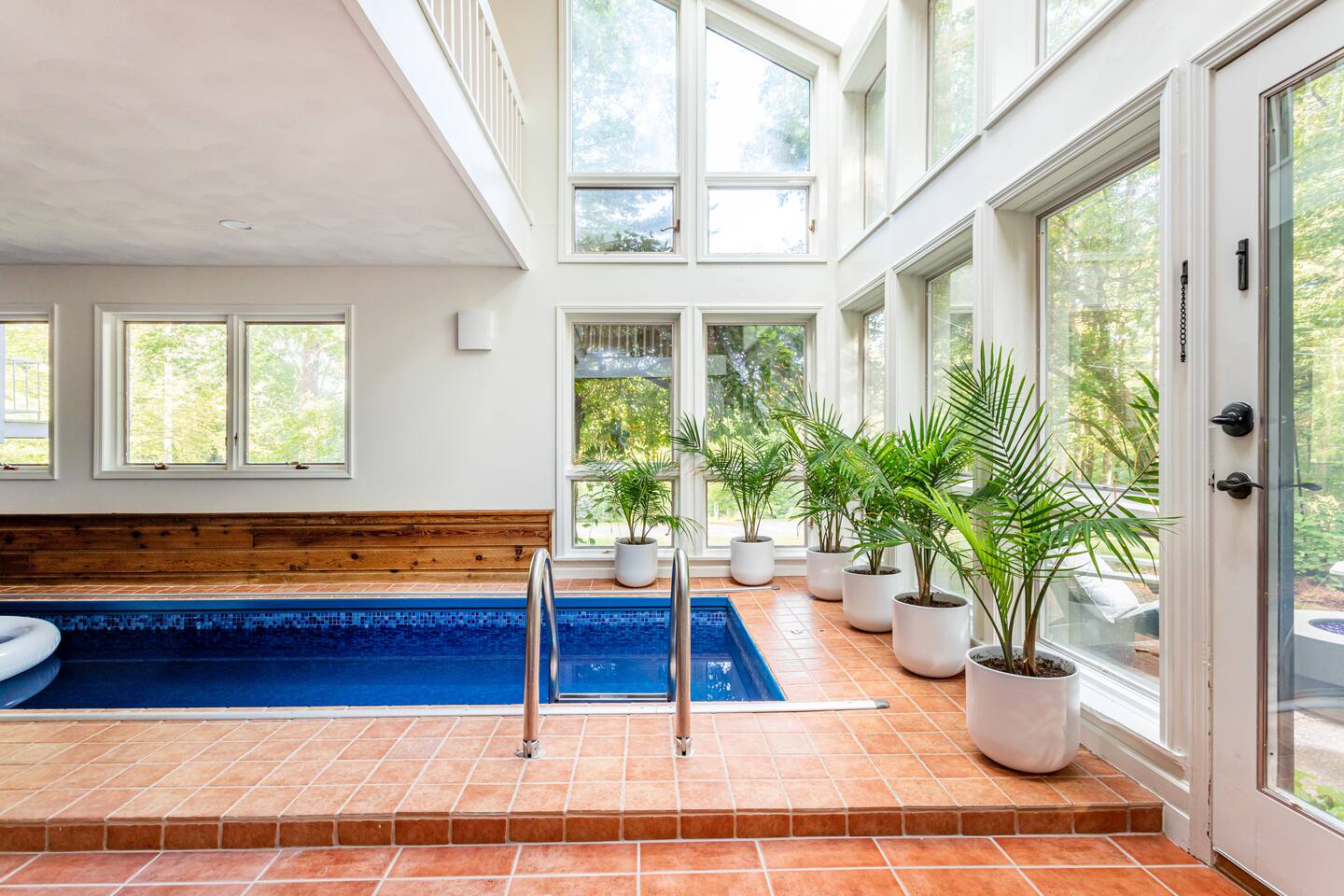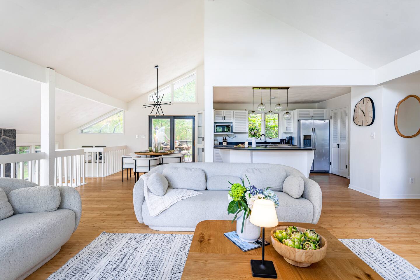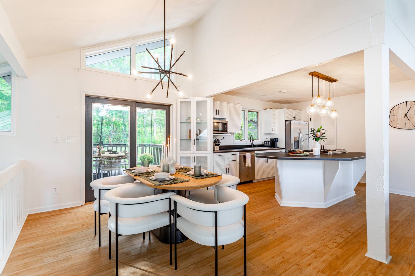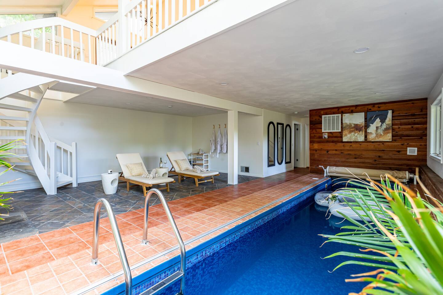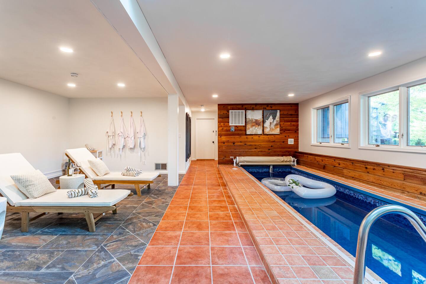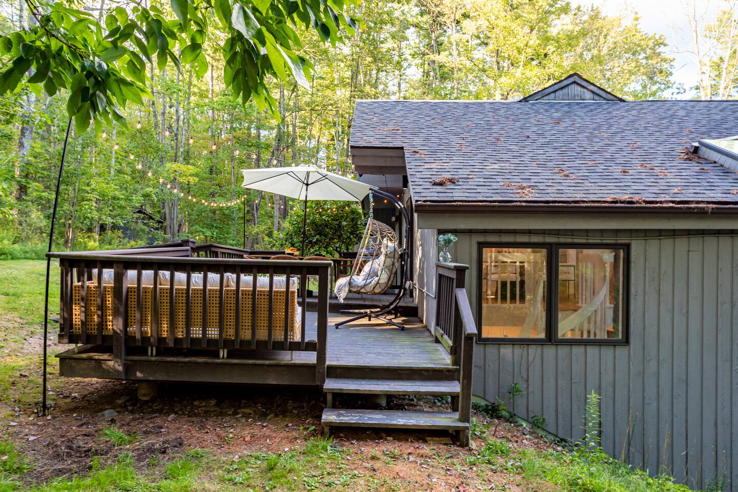 Ideal for couples and small families alike, this peaceful home offers a relaxing vacation experience. Unwind in the comfortable living spaces, surrounded by nature's splendor. The property features expansive decks with gorgeous views, perfect for nature lovers. The circular driveway and serene surroundings create a sense of calm, while the expansive floor-to-ceiling windows offer breathtaking views of the surrounding landscape. This resort-style home boasts: - Beautiful, high-end new furniture throughout - A fully stocked kitchen with updated appliances - Cathedral ceilings and large windows - Beautiful, solid bamboo hardwood flooring - 3 newly remodeled bathrooms - New high-quality modern lighting throughout - Recessed lighting and propane grill on the deck - Patio featuring a propane fire pit for cozy nighttime - Broad grassy yards perfect for outdoor activities - 3 bedrooms, including a master suite with a king bed, an ensuite bathroom, and a jacuzzi hot tub - 2 additional bedrooms with queen beds - Fine cotton linens and luxurious amenities throughout Experience the Ultimate in Relaxation! Enjoy breathtaking sunrise views from the East-facing front balcony, sunset views from the back deck, and relax in the spa-quality jetted tub. Take a dip in the indoor heated pool that is open year-round! Book your stay today and experience the ultimate in relaxation and tranquility.