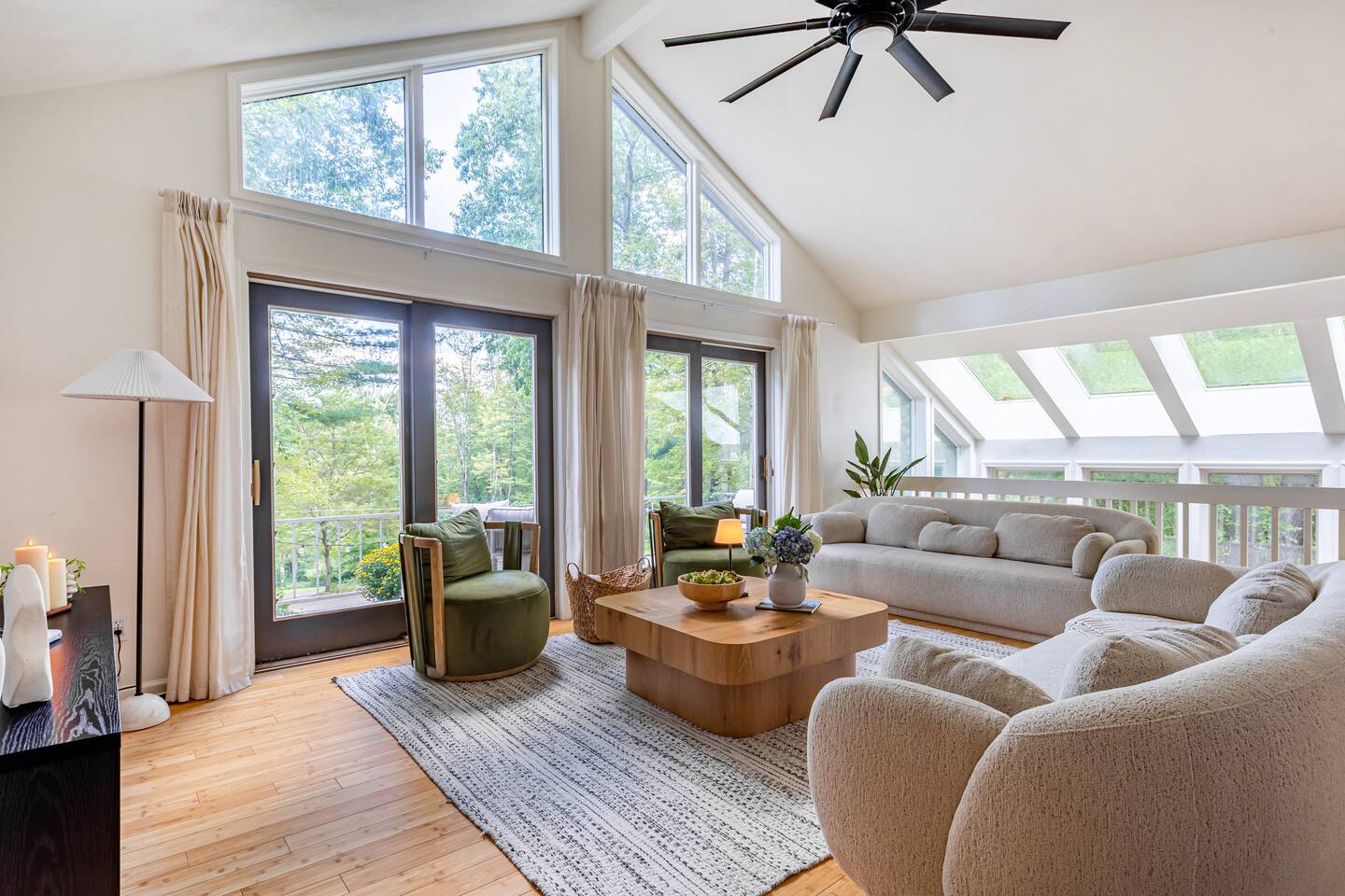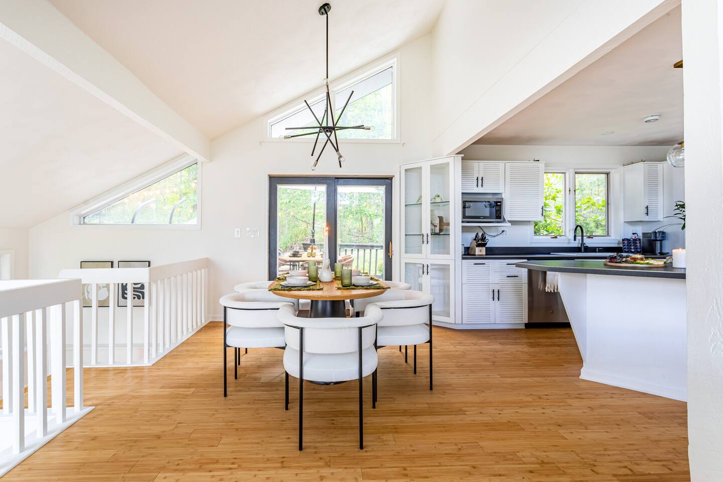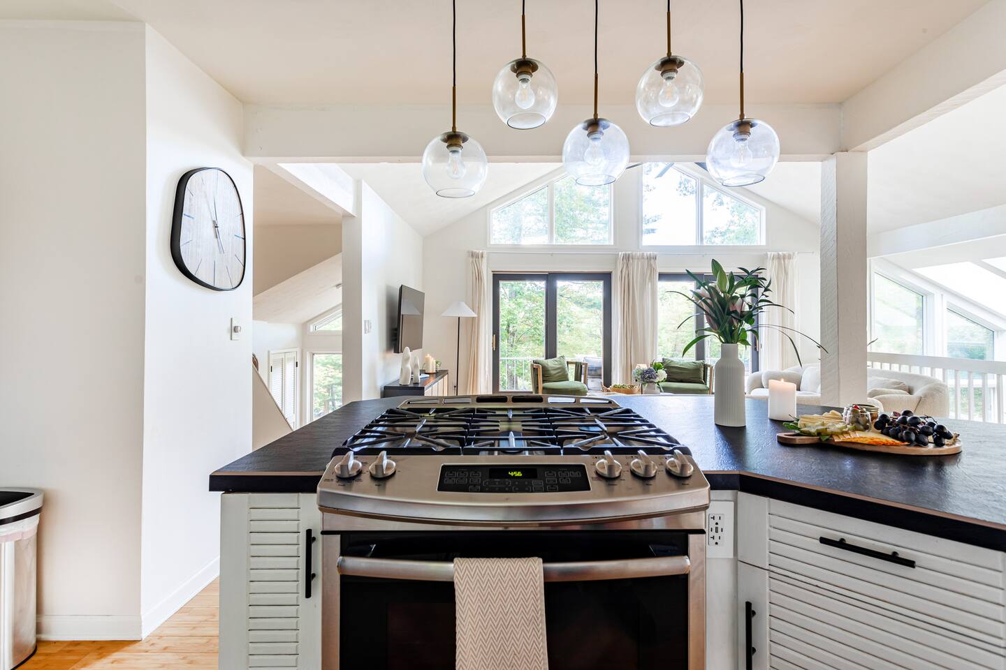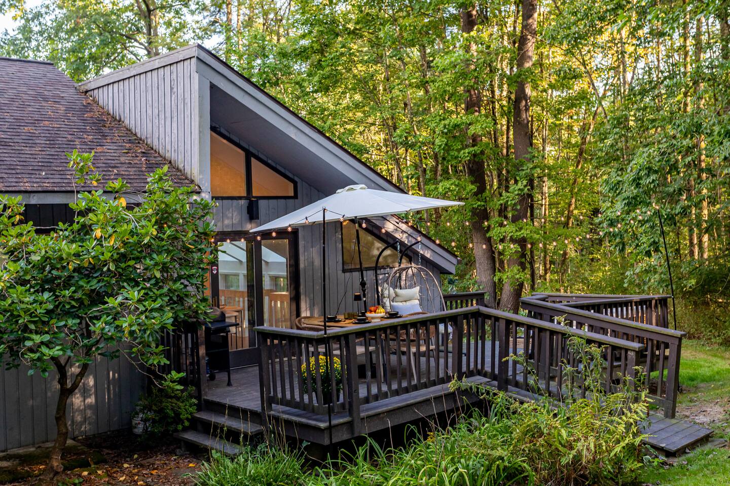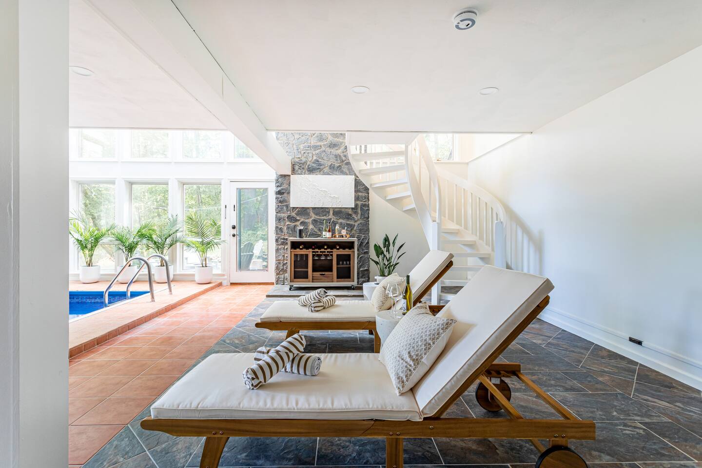 Ideal for couples and small families alike, this peaceful home offers a relaxing vacation experience. Unwind in the comfortable living spaces, surrounded by nature's splendor. The property features expansive decks with gorgeous views, perfect for nature lovers. The circular driveway and serene surroundings create a sense of calm, while the expansive floor-to-ceiling windows offer breathtaking views of the surrounding landscape. This resort-style home boasts: - Beautiful, high-end new furniture throughout - A fully stocked kitchen with updated appliances - Cathedral ceilings and large windows - Beautiful, solid bamboo hardwood flooring - 3 newly remodeled bathrooms - New high-quality modern lighting throughout - Recessed lighting and propane grill on the deck - Patio featuring a propane fire pit for cozy nighttime - Broad grassy yards perfect for outdoor activities - 3 bedrooms, including a master suite with a king bed, an ensuite bathroom, and a jacuzzi hot tub - 2 additional bedrooms with queen beds - Fine cotton linens and luxurious amenities throughout Experience the Ultimate in Relaxation! Enjoy breathtaking sunrise views from the East-facing front balcony, sunset views from the back deck, and relax in the spa-quality jetted tub. Take a dip in the indoor heated pool that is open year-round! Book your stay today and experience the ultimate in relaxation and tranquility.
