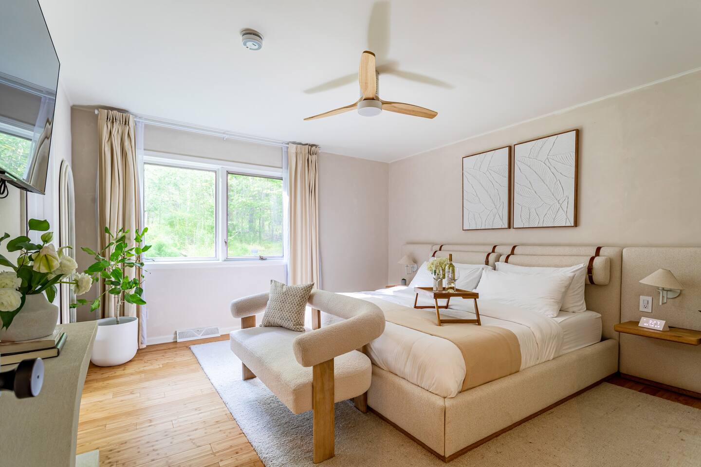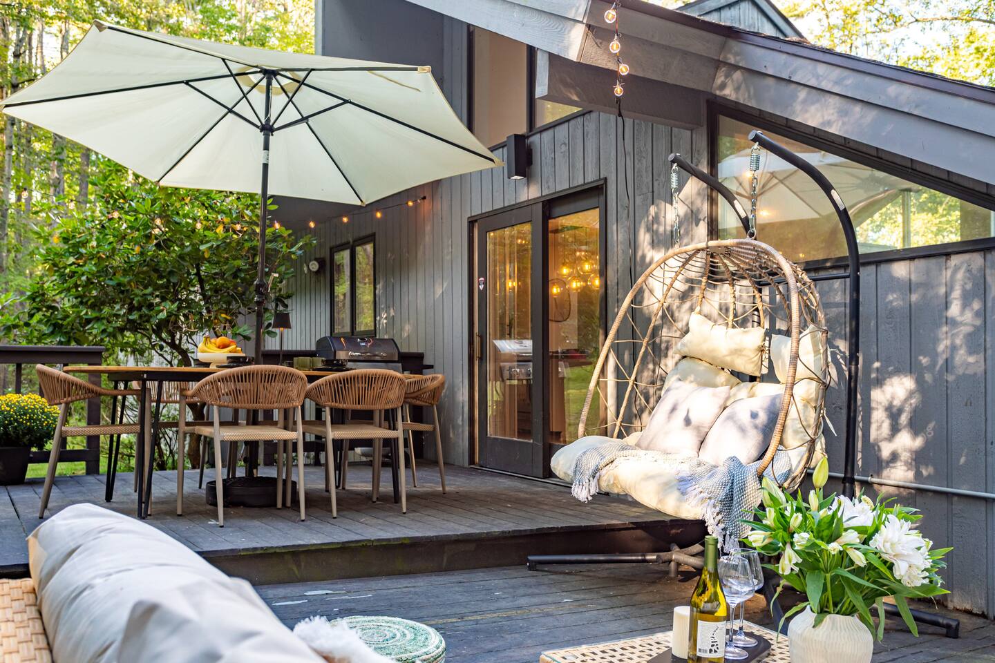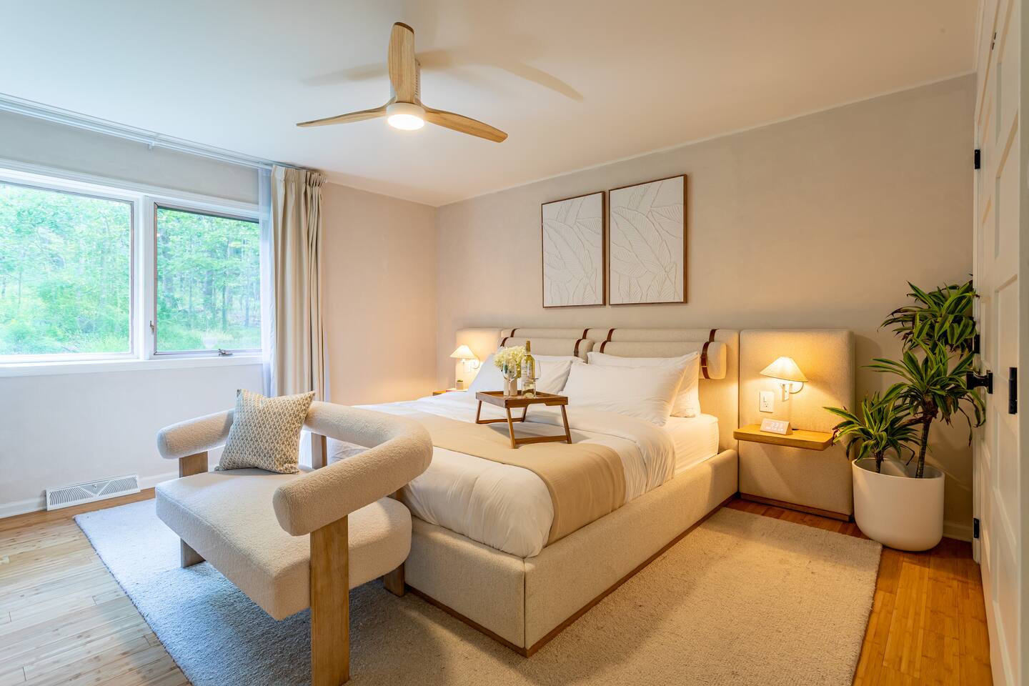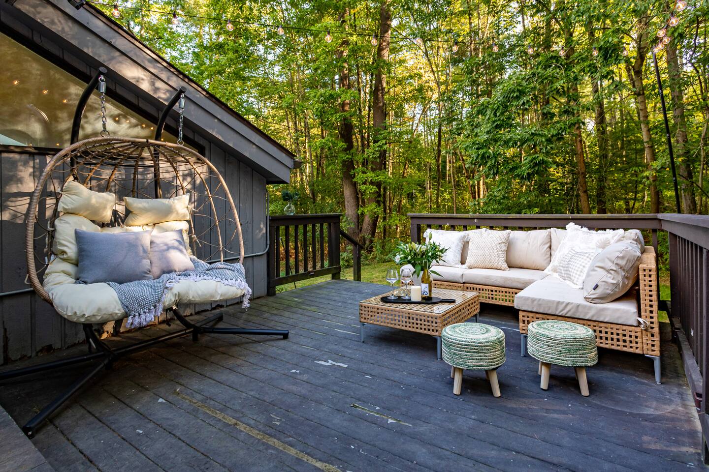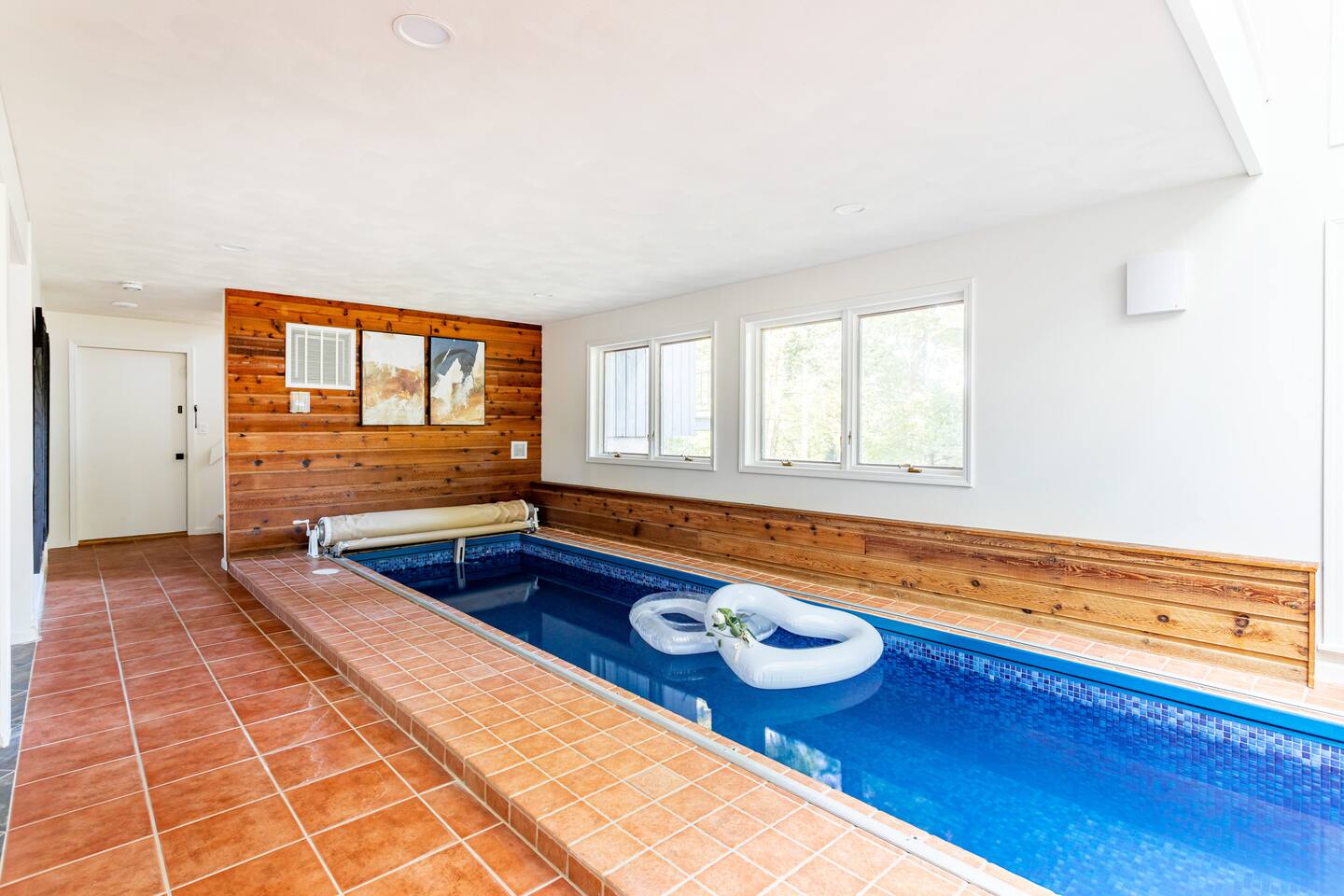 Ideal for couples and small families alike, this peaceful home offers a relaxing vacation experience. Unwind in the comfortable living spaces, surrounded by nature's splendor. The property features expansive decks with gorgeous views, perfect for nature lovers. The circular driveway and serene surroundings create a sense of calm, while the expansive floor-to-ceiling windows offer breathtaking views of the surrounding landscape. This resort-style home boasts: - Beautiful, high-end new furniture throughout - A fully stocked kitchen with updated appliances - Cathedral ceilings and large windows - Beautiful, solid bamboo hardwood flooring - 3 newly remodeled bathrooms - New high-quality modern lighting throughout - Recessed lighting and propane grill on the deck - Patio featuring a propane fire pit for cozy nighttime - Broad grassy yards perfect for outdoor activities - 3 bedrooms, including a master suite with a king bed, an ensuite bathroom, and a jacuzzi hot tub - 2 additional bedrooms with queen beds - Fine cotton linens and luxurious amenities throughout Experience the Ultimate in Relaxation! Enjoy breathtaking sunrise views from the East-facing front balcony, sunset views from the back deck, and relax in the spa-quality jetted tub. Take a dip in the indoor heated pool that is open year-round! Book your stay today and experience the ultimate in relaxation and tranquility.