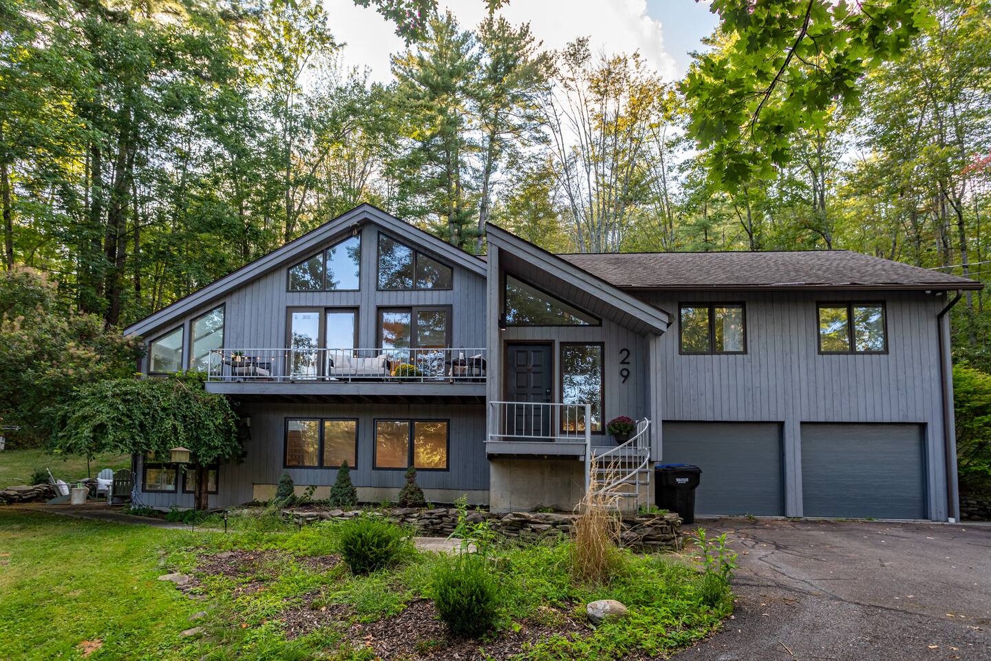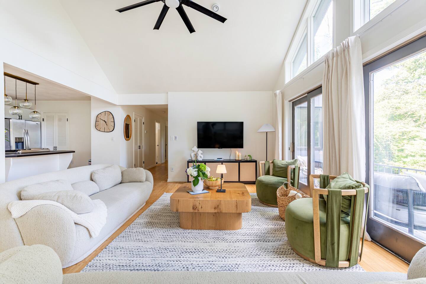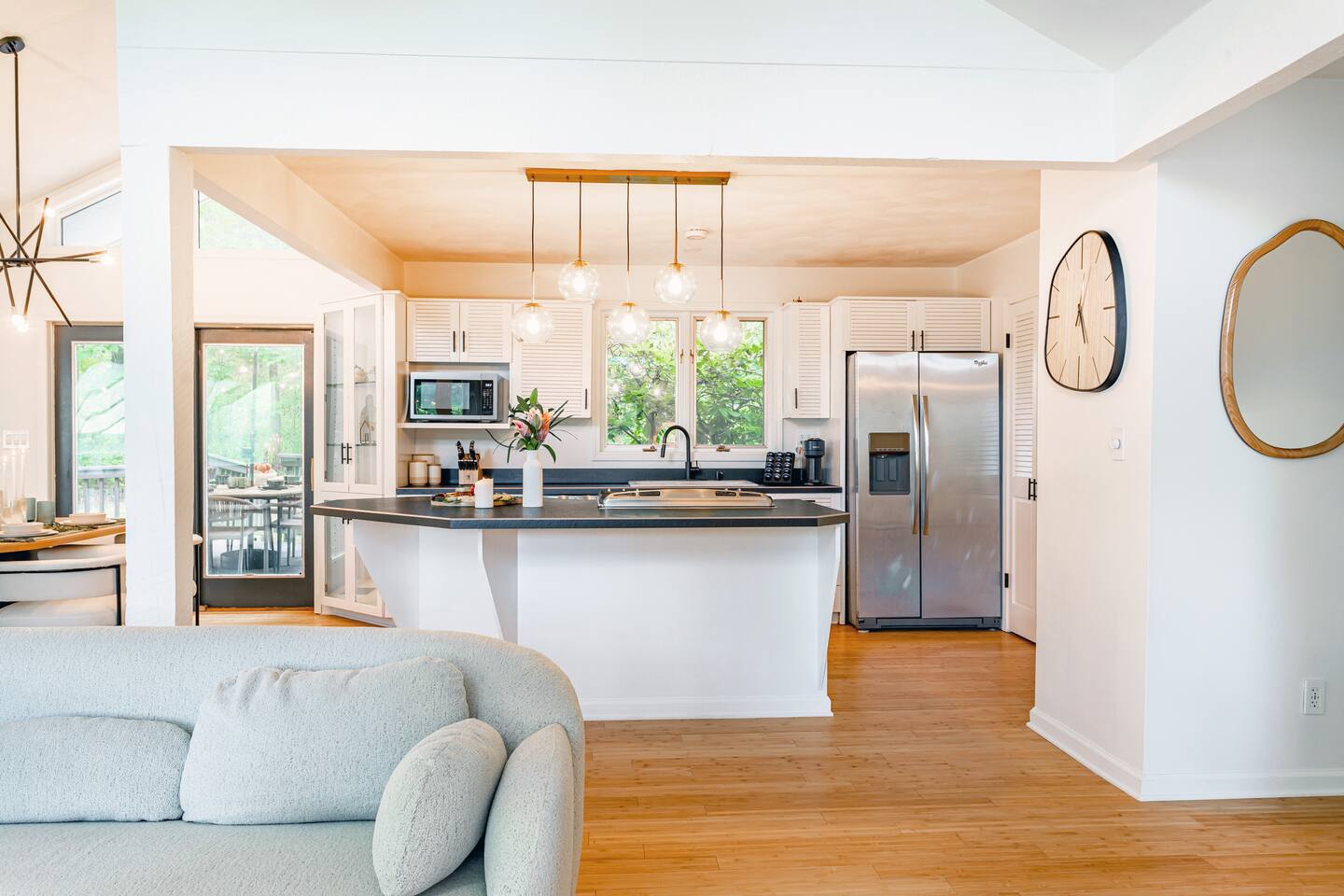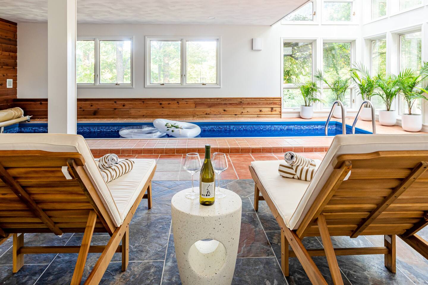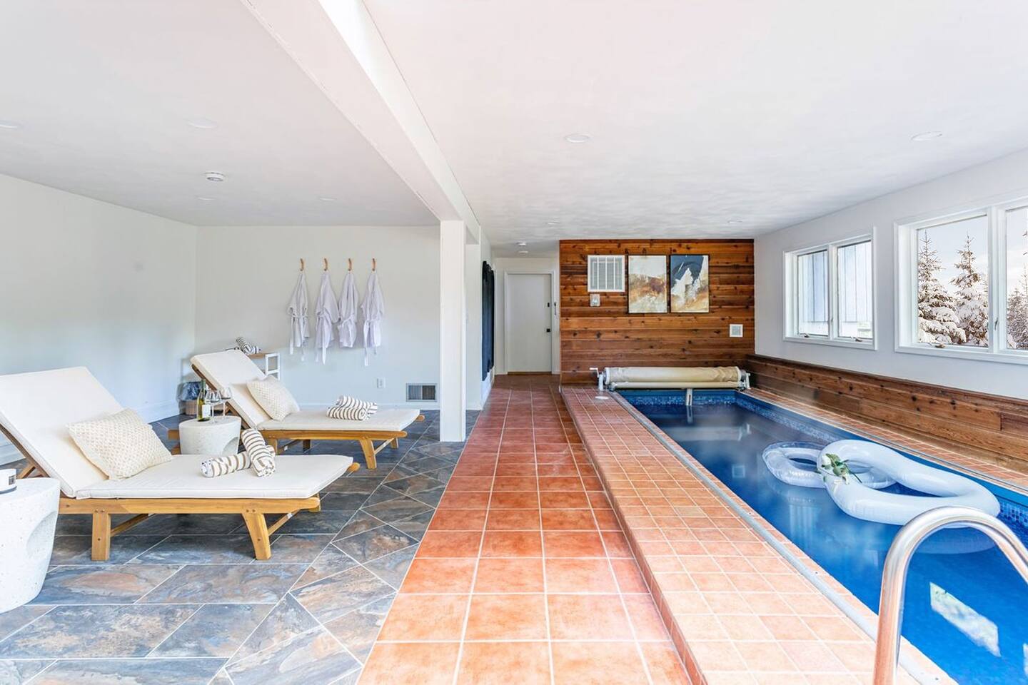 Ideal for couples and small families alike, this peaceful home offers a relaxing vacation experience. Unwind in the comfortable living spaces, surrounded by nature's splendor. The property features expansive decks with gorgeous views, perfect for nature lovers. The circular driveway and serene surroundings create a sense of calm, while the expansive floor-to-ceiling windows offer breathtaking views of the surrounding landscape. This resort-style home boasts: - Beautiful, high-end new furniture throughout - A fully stocked kitchen with updated appliances - Cathedral ceilings and large windows - Beautiful, solid bamboo hardwood flooring - 3 newly remodeled bathrooms - New high-quality modern lighting throughout - Recessed lighting and propane grill on the deck - Patio featuring a propane fire pit for cozy nighttime - Broad grassy yards perfect for outdoor activities - 3 bedrooms, including a master suite with a king bed, an ensuite bathroom, and a jacuzzi hot tub - 2 additional bedrooms with queen beds - Fine cotton linens and luxurious amenities throughout Experience the Ultimate in Relaxation! Enjoy breathtaking sunrise views from the East-facing front balcony, sunset views from the back deck, and relax in the spa-quality jetted tub. Take a dip in the indoor heated pool that is open year-round! Book your stay today and experience the ultimate in relaxation and tranquility.