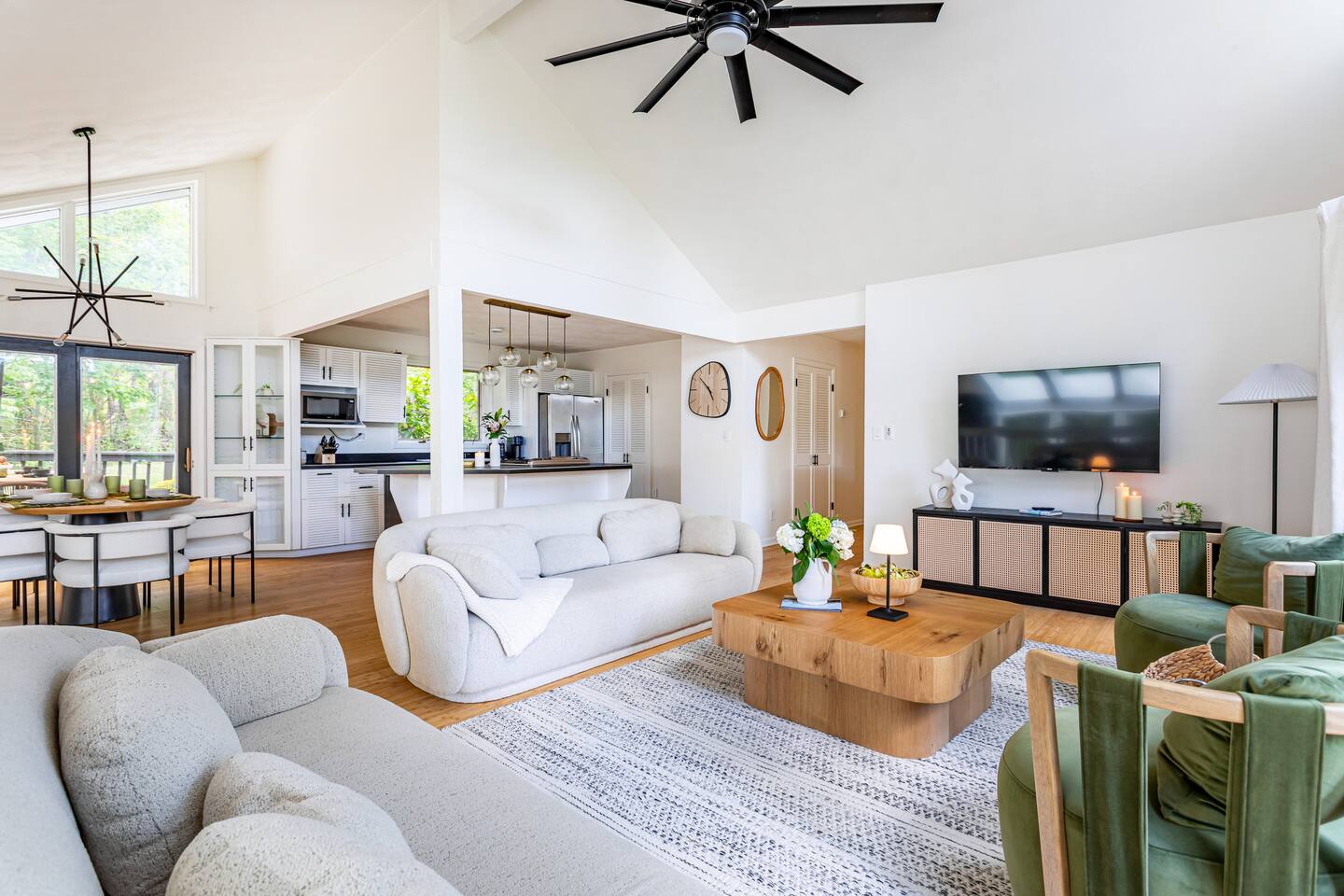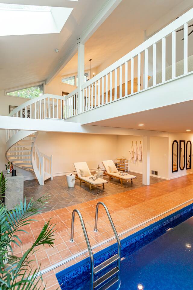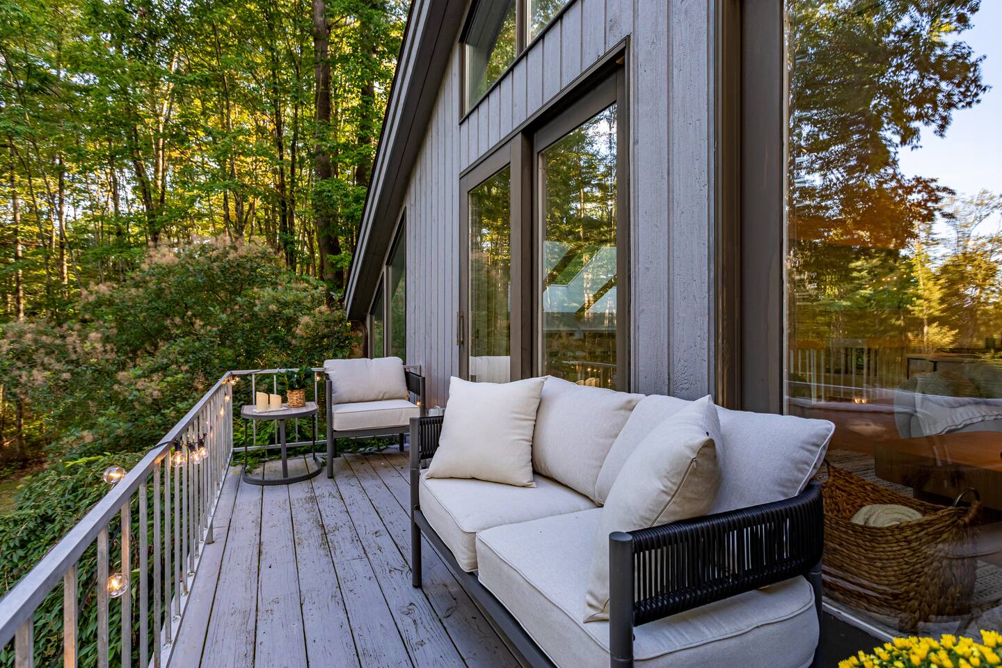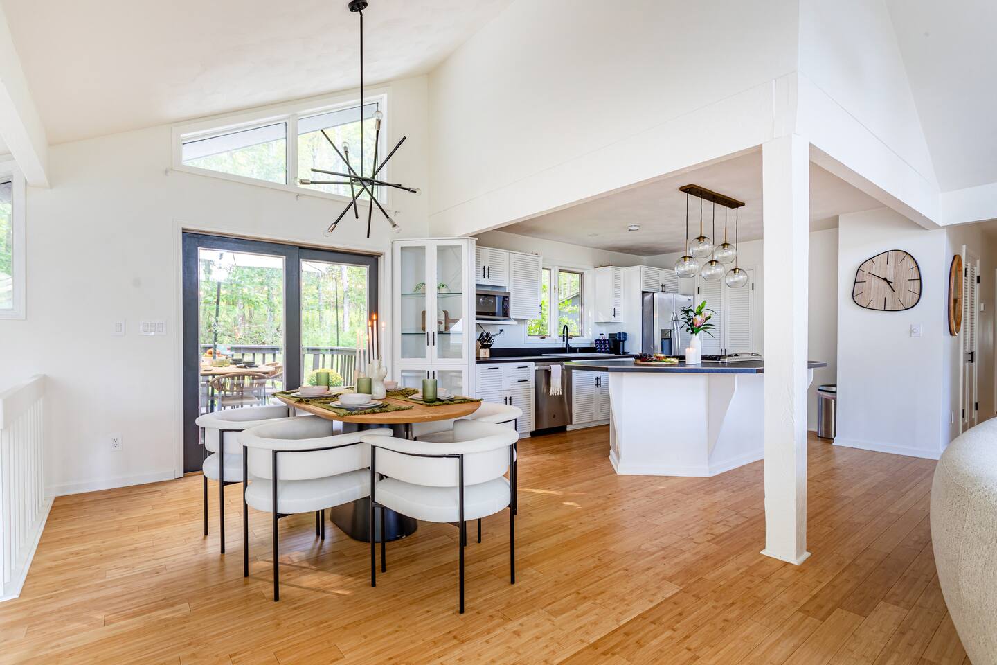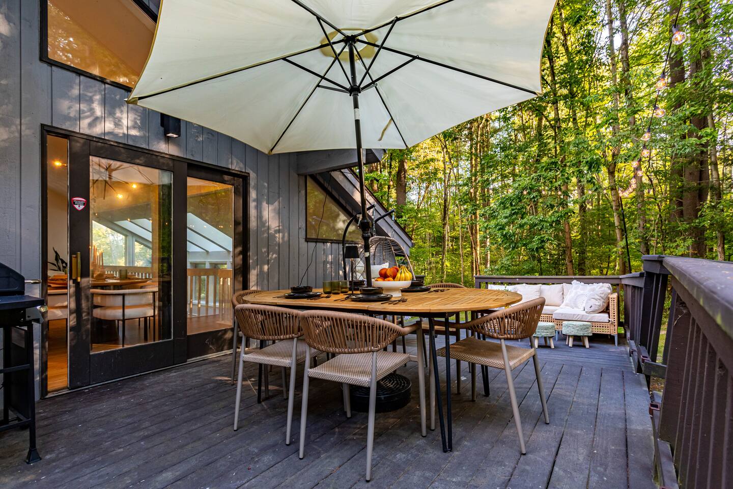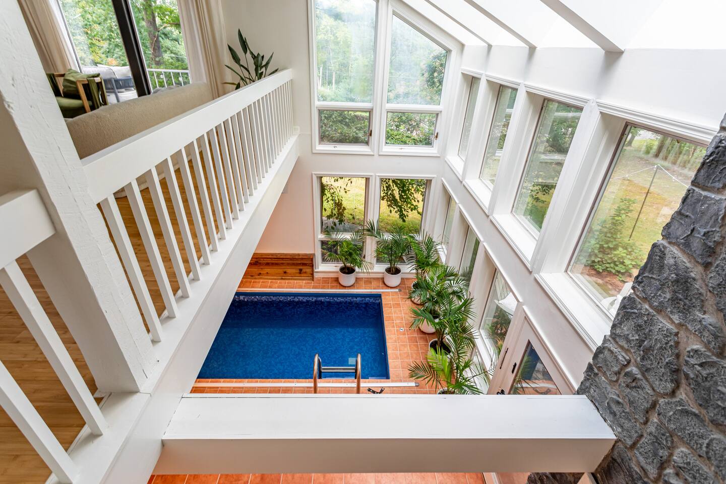 Ideal for couples and small families alike, this peaceful home offers a relaxing vacation experience. Unwind in the comfortable living spaces, surrounded by nature's splendor. The property features expansive decks with gorgeous views, perfect for nature lovers. The circular driveway and serene surroundings create a sense of calm, while the expansive floor-to-ceiling windows offer breathtaking views of the surrounding landscape. This resort-style home boasts: - Beautiful, high-end new furniture throughout - A fully stocked kitchen with updated appliances - Cathedral ceilings and large windows - Beautiful, solid bamboo hardwood flooring - 3 newly remodeled bathrooms - New high-quality modern lighting throughout - Recessed lighting and propane grill on the deck - Patio featuring a propane fire pit for cozy nighttime - Broad grassy yards perfect for outdoor activities - 3 bedrooms, including a master suite with a king bed, an ensuite bathroom, and a jacuzzi hot tub - 2 additional bedrooms with queen beds - Fine cotton linens and luxurious amenities throughout Experience the Ultimate in Relaxation! Enjoy breathtaking sunrise views from the East-facing front balcony, sunset views from the back deck, and relax in the spa-quality jetted tub. Take a dip in the indoor heated pool that is open year-round! Book your stay today and experience the ultimate in relaxation and tranquility.