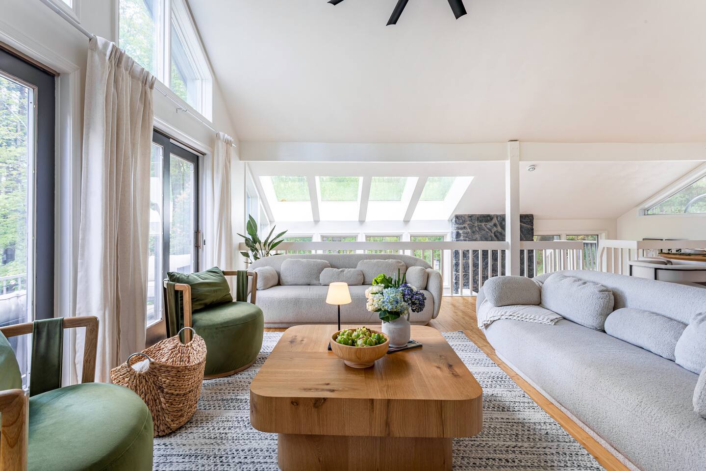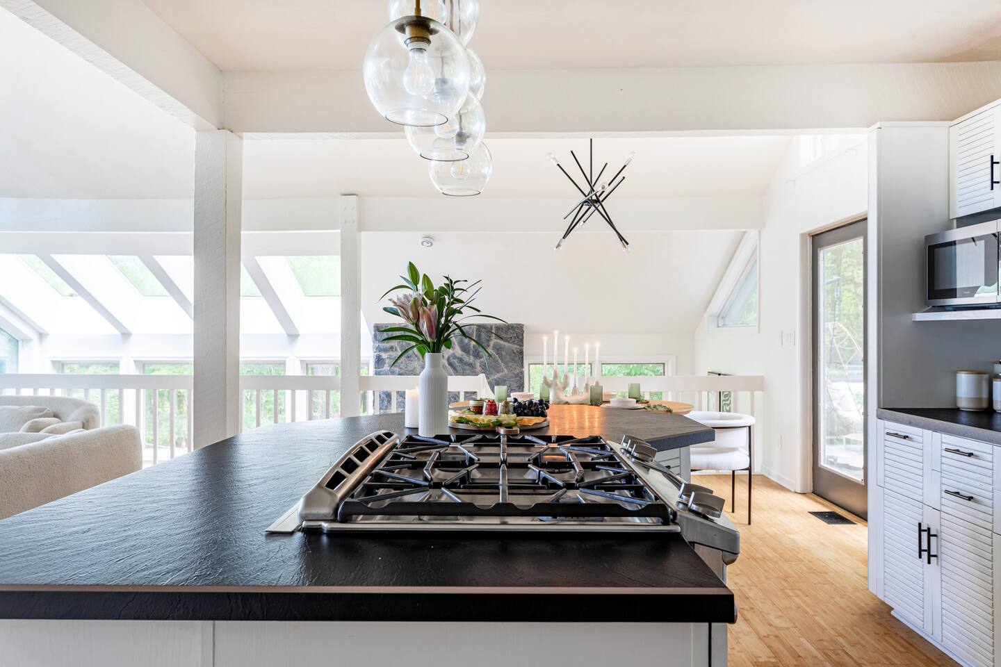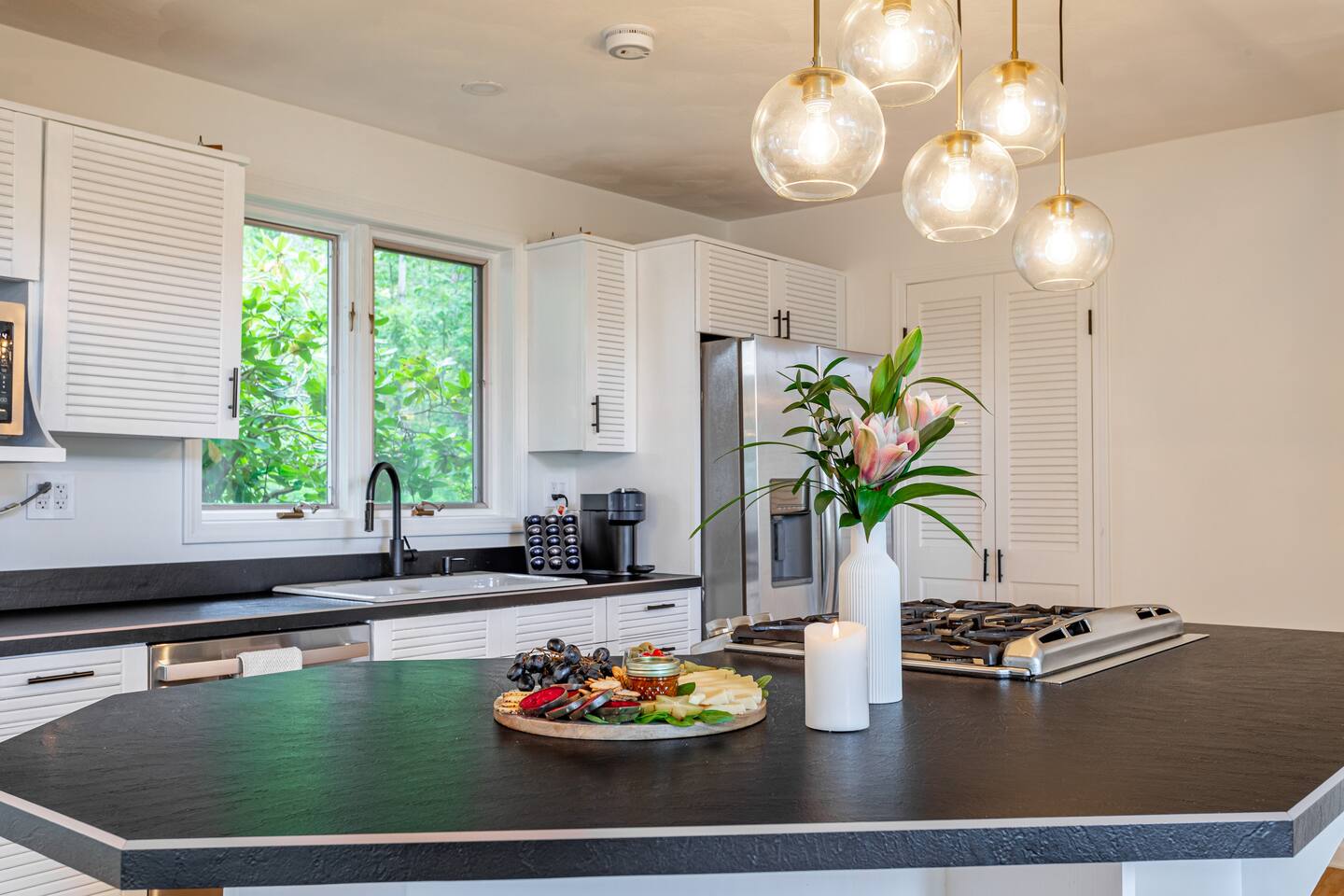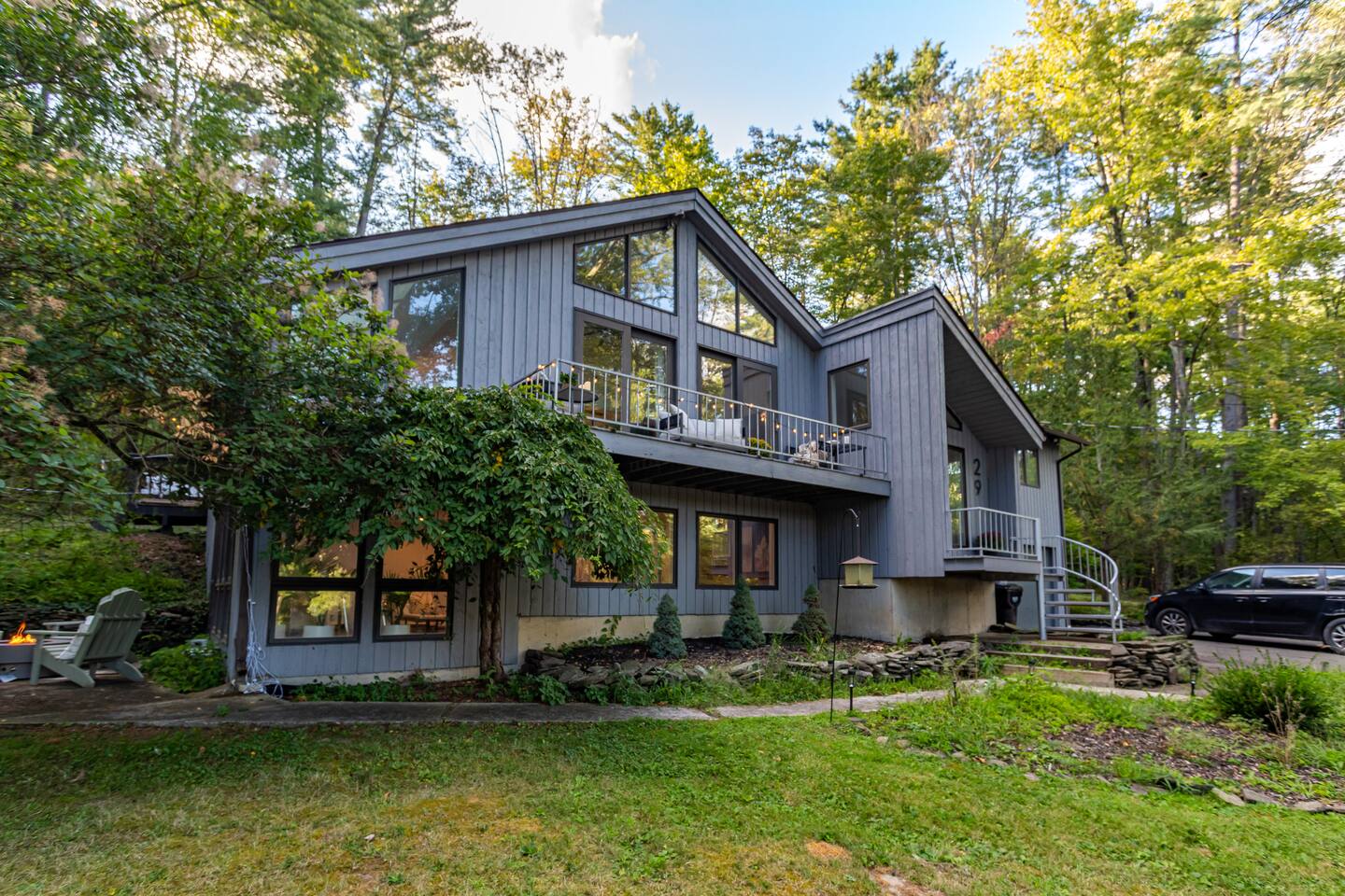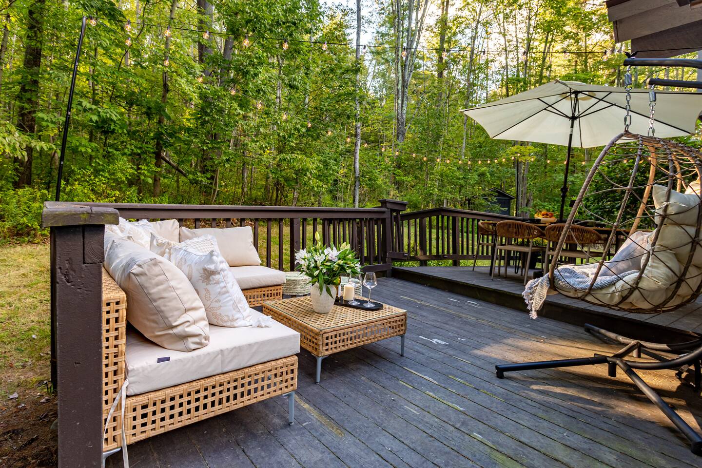 Ideal for couples and small families alike, this peaceful home offers a relaxing vacation experience. Unwind in the comfortable living spaces, surrounded by nature's splendor. The property features expansive decks with gorgeous views, perfect for nature lovers. The circular driveway and serene surroundings create a sense of calm, while the expansive floor-to-ceiling windows offer breathtaking views of the surrounding landscape. This resort-style home boasts: - Beautiful, high-end new furniture throughout - A fully stocked kitchen with updated appliances - Cathedral ceilings and large windows - Beautiful, solid bamboo hardwood flooring - 3 newly remodeled bathrooms - New high-quality modern lighting throughout - Recessed lighting and propane grill on the deck - Patio featuring a propane fire pit for cozy nighttime - Broad grassy yards perfect for outdoor activities - 3 bedrooms, including a master suite with a king bed, an ensuite bathroom, and a jacuzzi hot tub - 2 additional bedrooms with queen beds - Fine cotton linens and luxurious amenities throughout Experience the Ultimate in Relaxation! Enjoy breathtaking sunrise views from the East-facing front balcony, sunset views from the back deck, and relax in the spa-quality jetted tub. Take a dip in the indoor heated pool that is open year-round! Book your stay today and experience the ultimate in relaxation and tranquility.