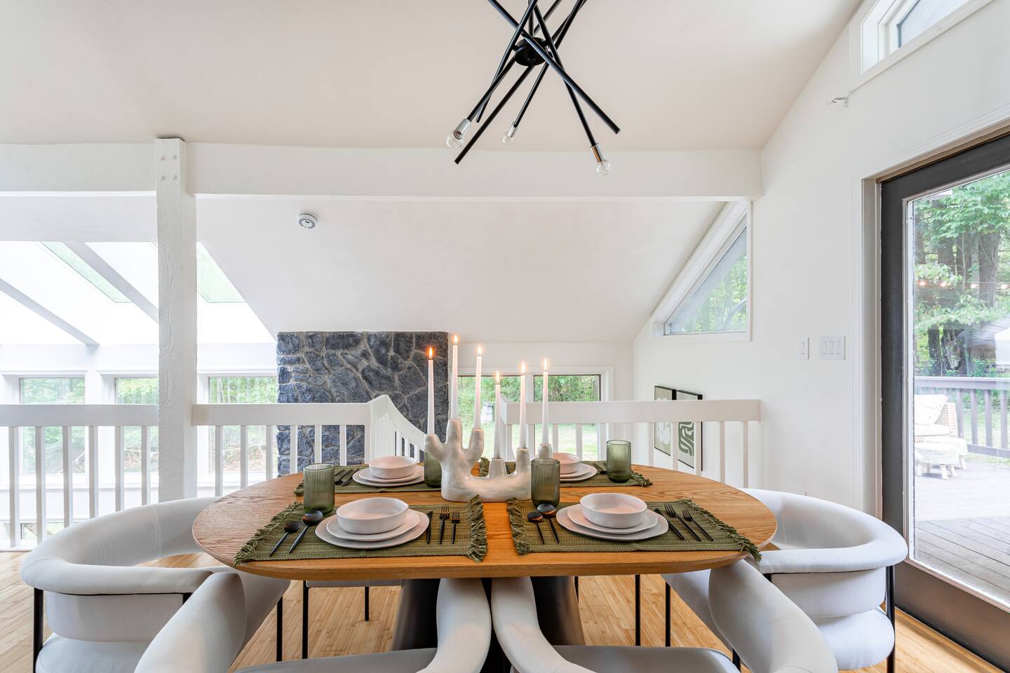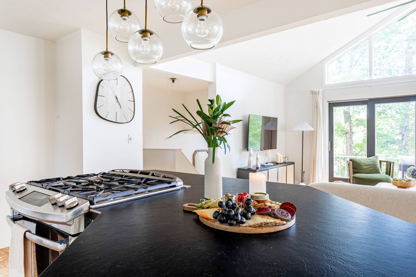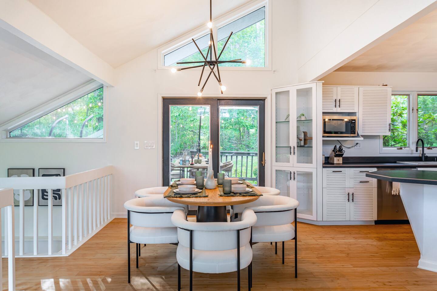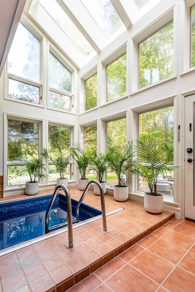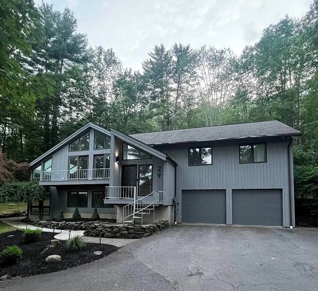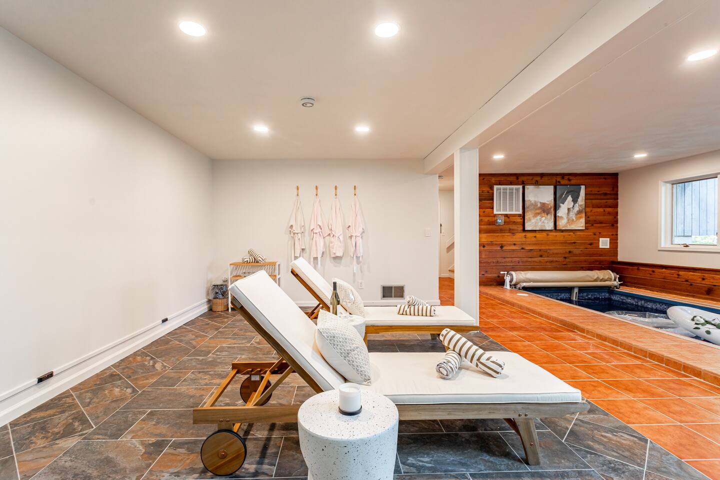 Ideal for couples and small families alike, this peaceful home offers a relaxing vacation experience. Unwind in the comfortable living spaces, surrounded by nature's splendor. The property features expansive decks with gorgeous views, perfect for nature lovers. The circular driveway and serene surroundings create a sense of calm, while the expansive floor-to-ceiling windows offer breathtaking views of the surrounding landscape. This resort-style home boasts: - Beautiful, high-end new furniture throughout - A fully stocked kitchen with updated appliances - Cathedral ceilings and large windows - Beautiful, solid bamboo hardwood flooring - 3 newly remodeled bathrooms - New high-quality modern lighting throughout - Recessed lighting and propane grill on the deck - Patio featuring a propane fire pit for cozy nighttime - Broad grassy yards perfect for outdoor activities - 3 bedrooms, including a master suite with a king bed, an ensuite bathroom, and a jacuzzi hot tub - 2 additional bedrooms with queen beds - Fine cotton linens and luxurious amenities throughout Experience the Ultimate in Relaxation! Enjoy breathtaking sunrise views from the East-facing front balcony, sunset views from the back deck, and relax in the spa-quality jetted tub. Take a dip in the indoor heated pool that is open year-round! Book your stay today and experience the ultimate in relaxation and tranquility.