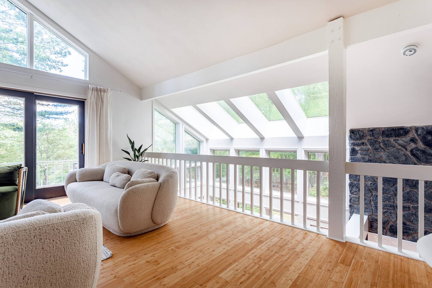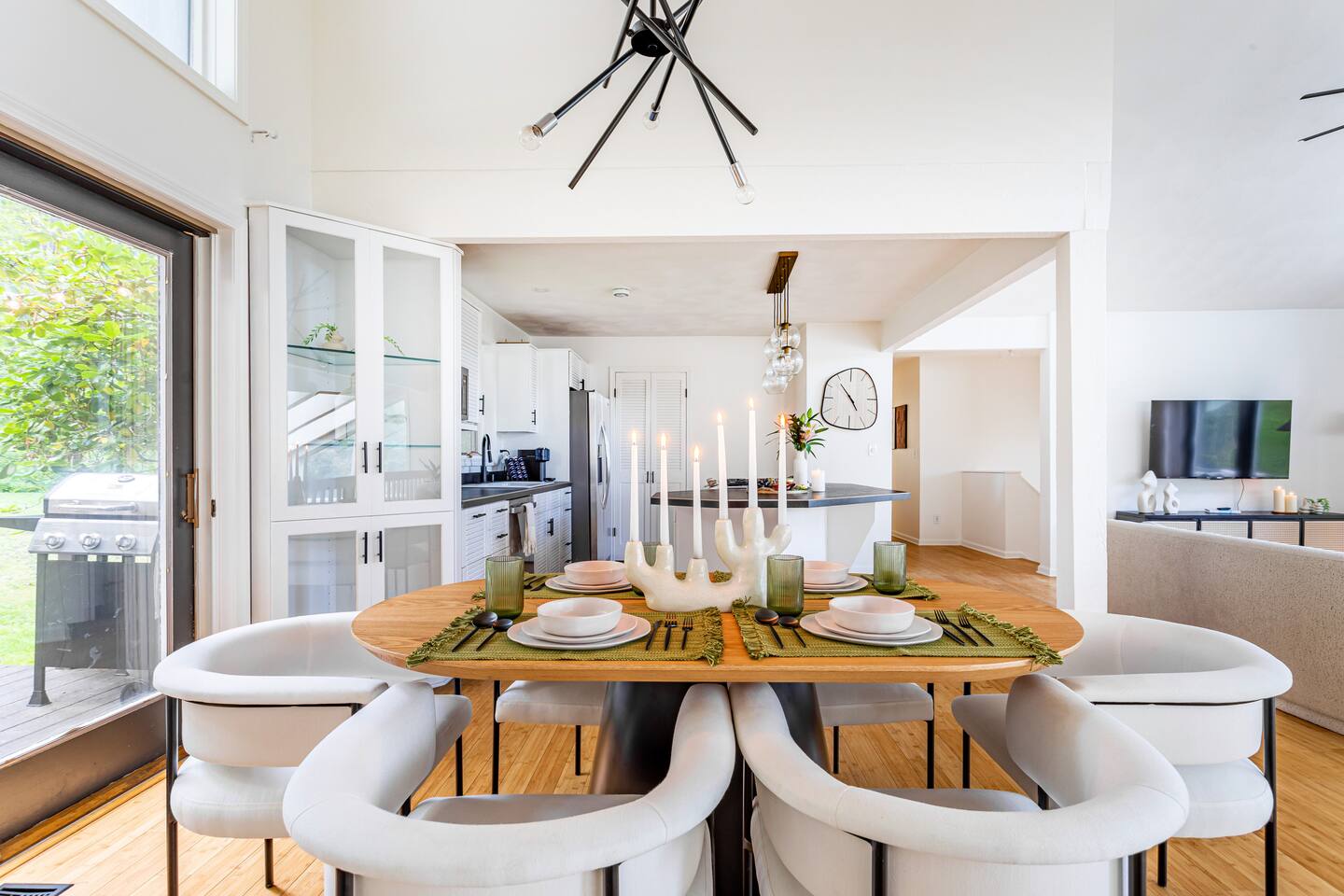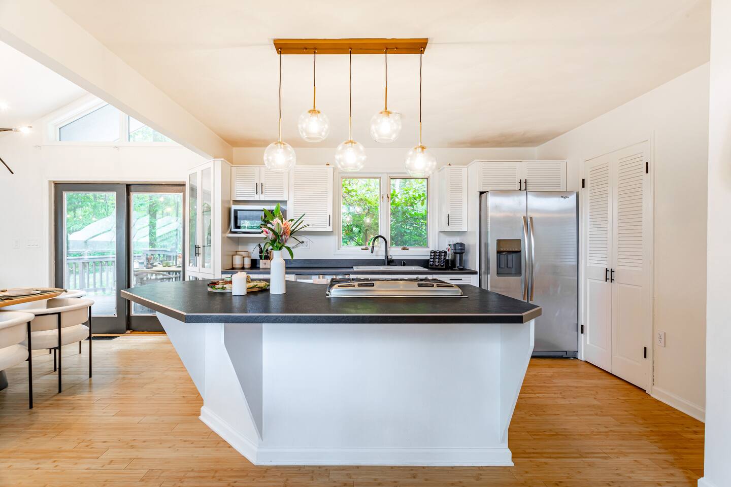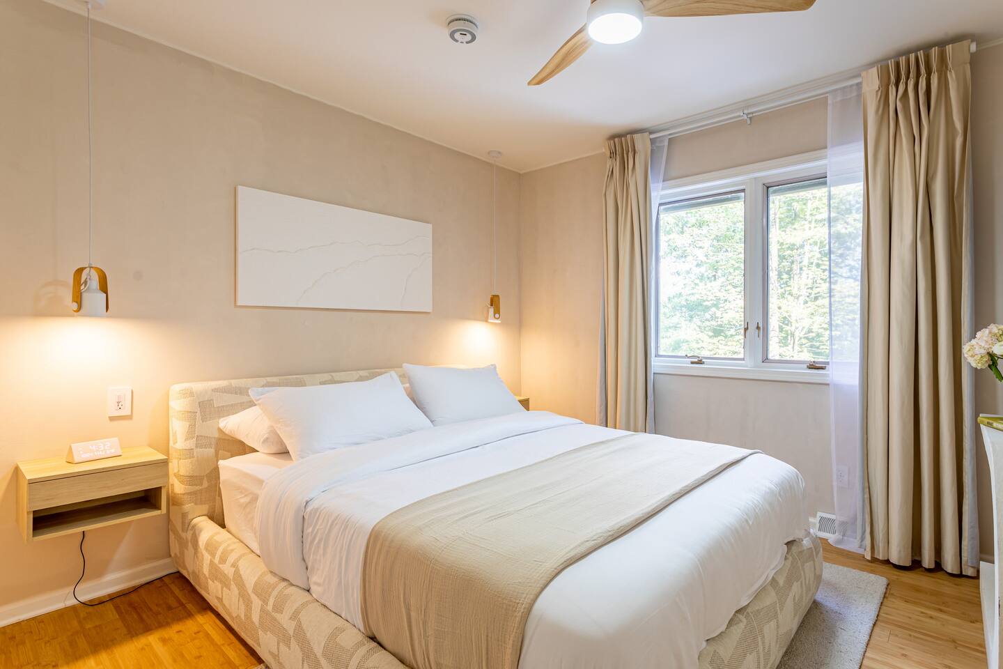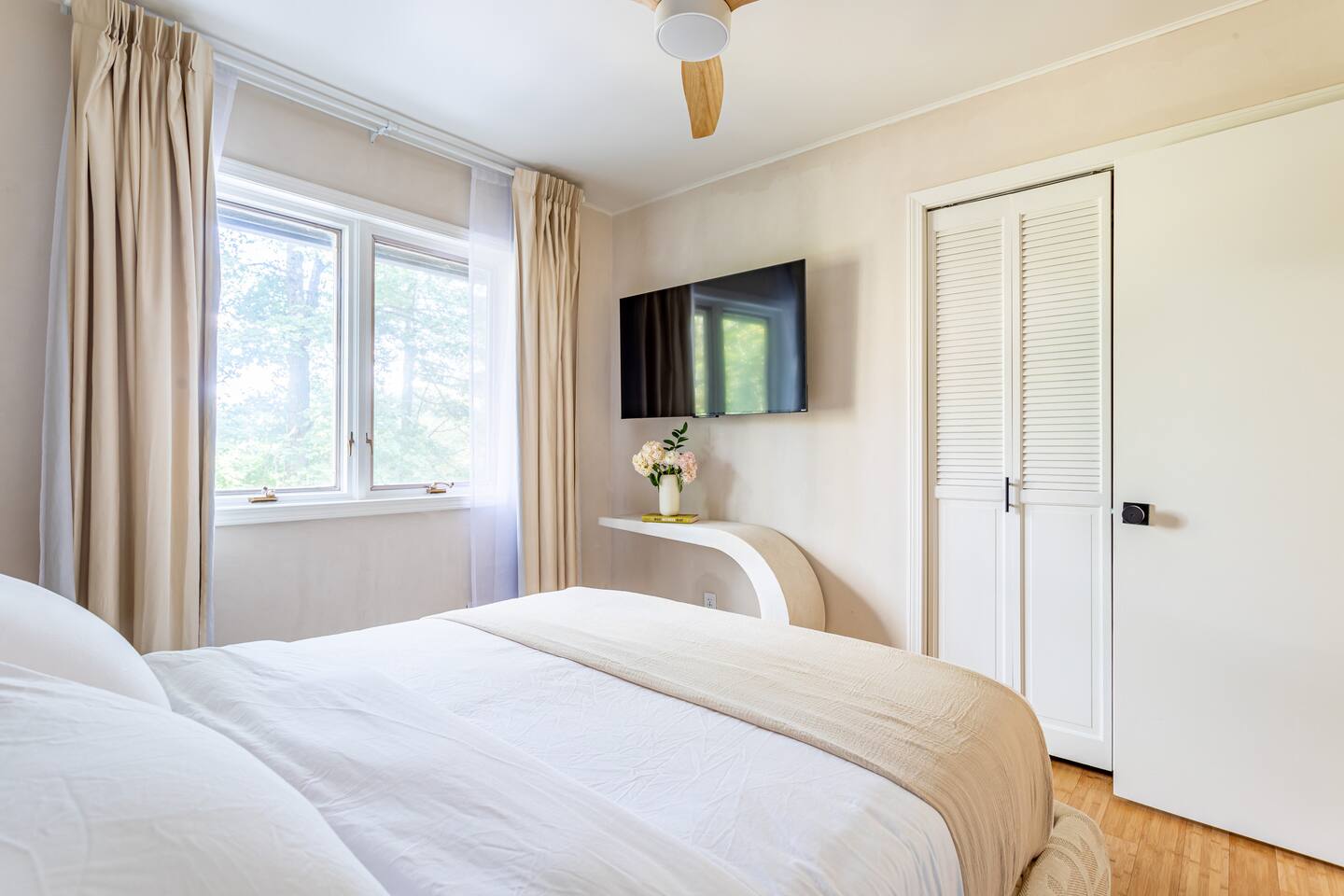 Ideal for couples and small families alike, this peaceful home offers a relaxing vacation experience. Unwind in the comfortable living spaces, surrounded by nature's splendor. The property features expansive decks with gorgeous views, perfect for nature lovers. The circular driveway and serene surroundings create a sense of calm, while the expansive floor-to-ceiling windows offer breathtaking views of the surrounding landscape. This resort-style home boasts: - Beautiful, high-end new furniture throughout - A fully stocked kitchen with updated appliances - Cathedral ceilings and large windows - Beautiful, solid bamboo hardwood flooring - 3 newly remodeled bathrooms - New high-quality modern lighting throughout - Recessed lighting and propane grill on the deck - Patio featuring a propane fire pit for cozy nighttime - Broad grassy yards perfect for outdoor activities - 3 bedrooms, including a master suite with a king bed, an ensuite bathroom, and a jacuzzi hot tub - 2 additional bedrooms with queen beds - Fine cotton linens and luxurious amenities throughout Experience the Ultimate in Relaxation! Enjoy breathtaking sunrise views from the East-facing front balcony, sunset views from the back deck, and relax in the spa-quality jetted tub. Take a dip in the indoor heated pool that is open year-round! Book your stay today and experience the ultimate in relaxation and tranquility.