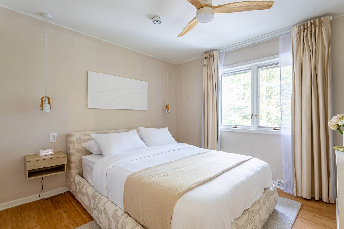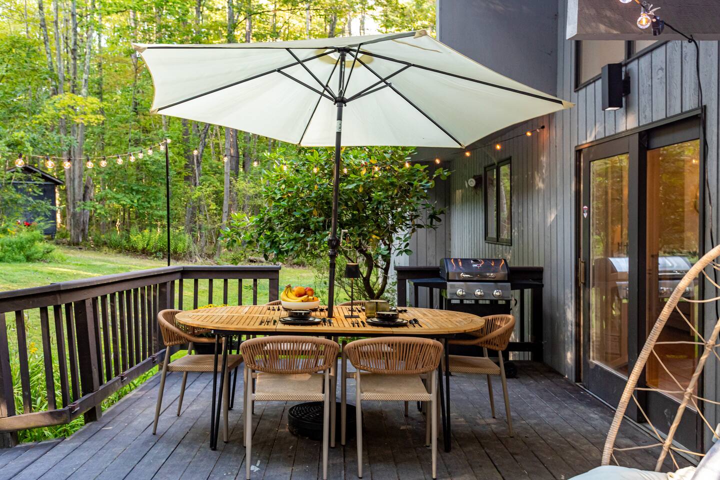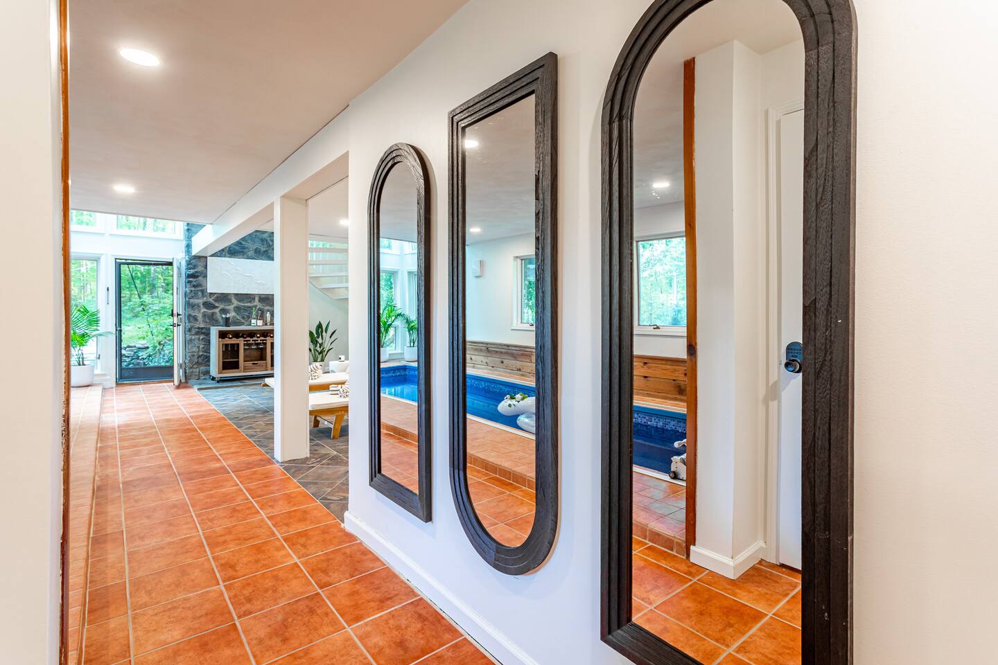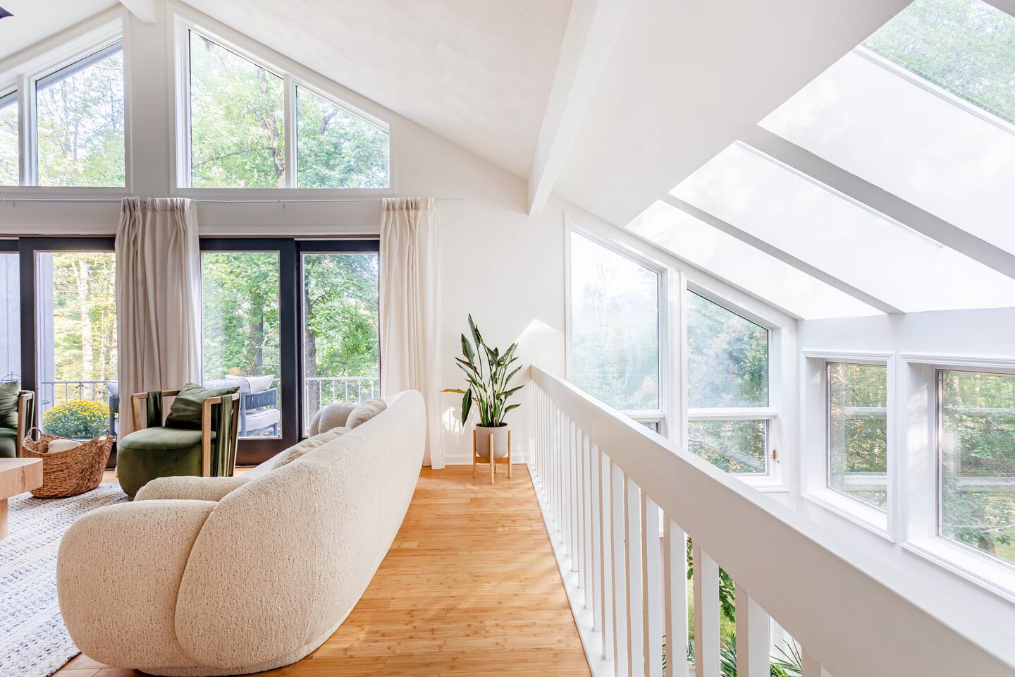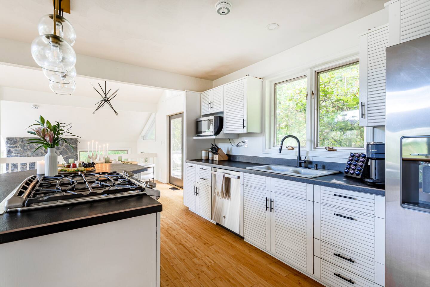 Ideal for couples and small families alike, this peaceful home offers a relaxing vacation experience. Unwind in the comfortable living spaces, surrounded by nature's splendor. The property features expansive decks with gorgeous views, perfect for nature lovers. The circular driveway and serene surroundings create a sense of calm, while the expansive floor-to-ceiling windows offer breathtaking views of the surrounding landscape. This resort-style home boasts: - Beautiful, high-end new furniture throughout - A fully stocked kitchen with updated appliances - Cathedral ceilings and large windows - Beautiful, solid bamboo hardwood flooring - 3 newly remodeled bathrooms - New high-quality modern lighting throughout - Recessed lighting and propane grill on the deck - Patio featuring a propane fire pit for cozy nighttime - Broad grassy yards perfect for outdoor activities - 3 bedrooms, including a master suite with a king bed, an ensuite bathroom, and a jacuzzi hot tub - 2 additional bedrooms with queen beds - Fine cotton linens and luxurious amenities throughout Experience the Ultimate in Relaxation! Enjoy breathtaking sunrise views from the East-facing front balcony, sunset views from the back deck, and relax in the spa-quality jetted tub. Take a dip in the indoor heated pool that is open year-round! Book your stay today and experience the ultimate in relaxation and tranquility.