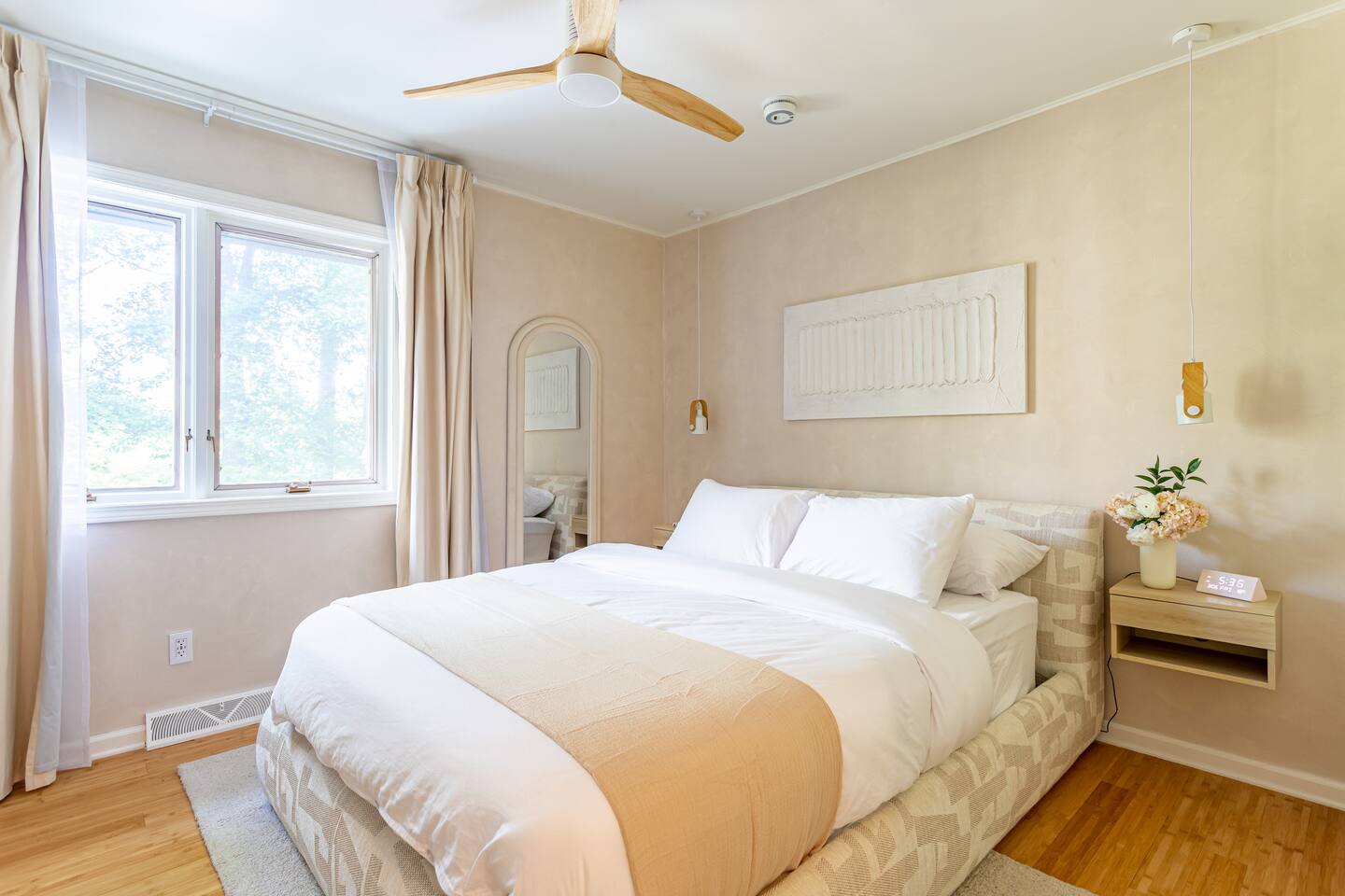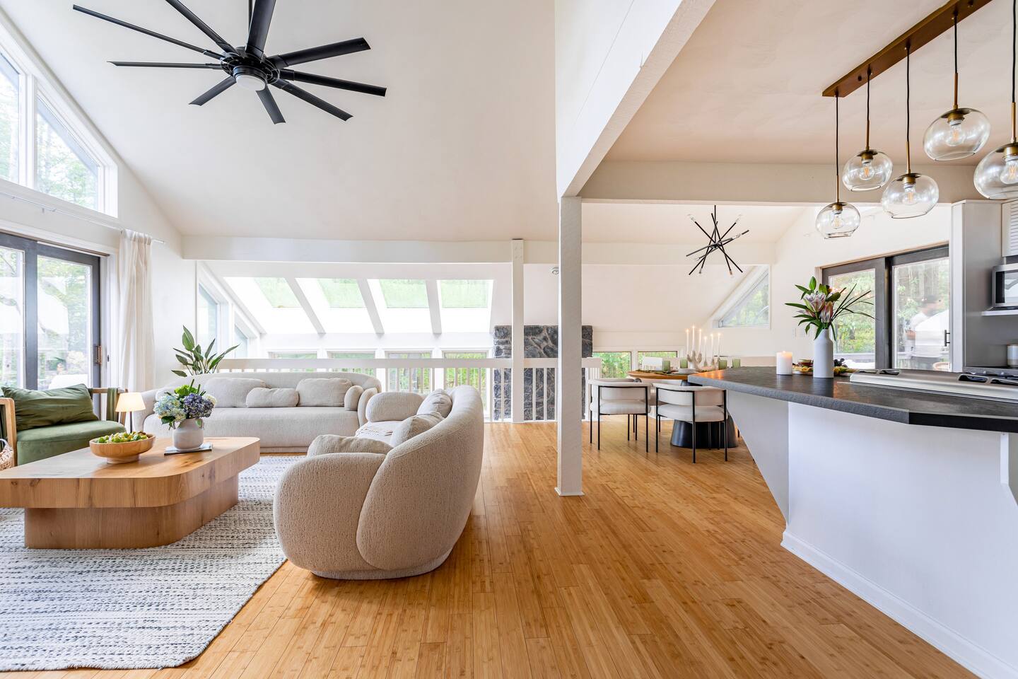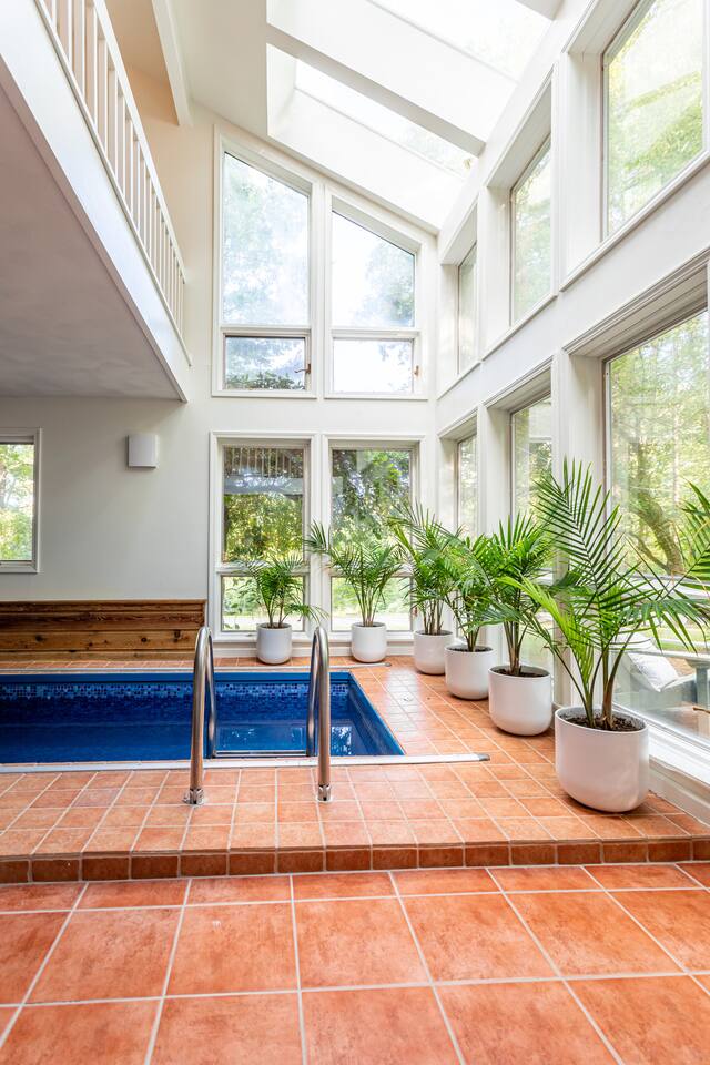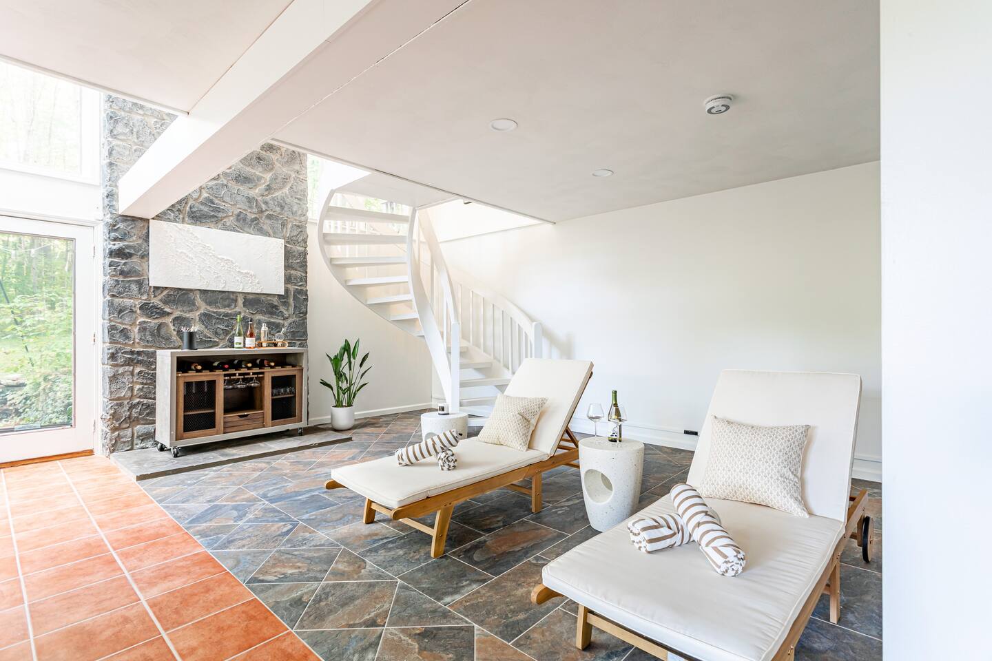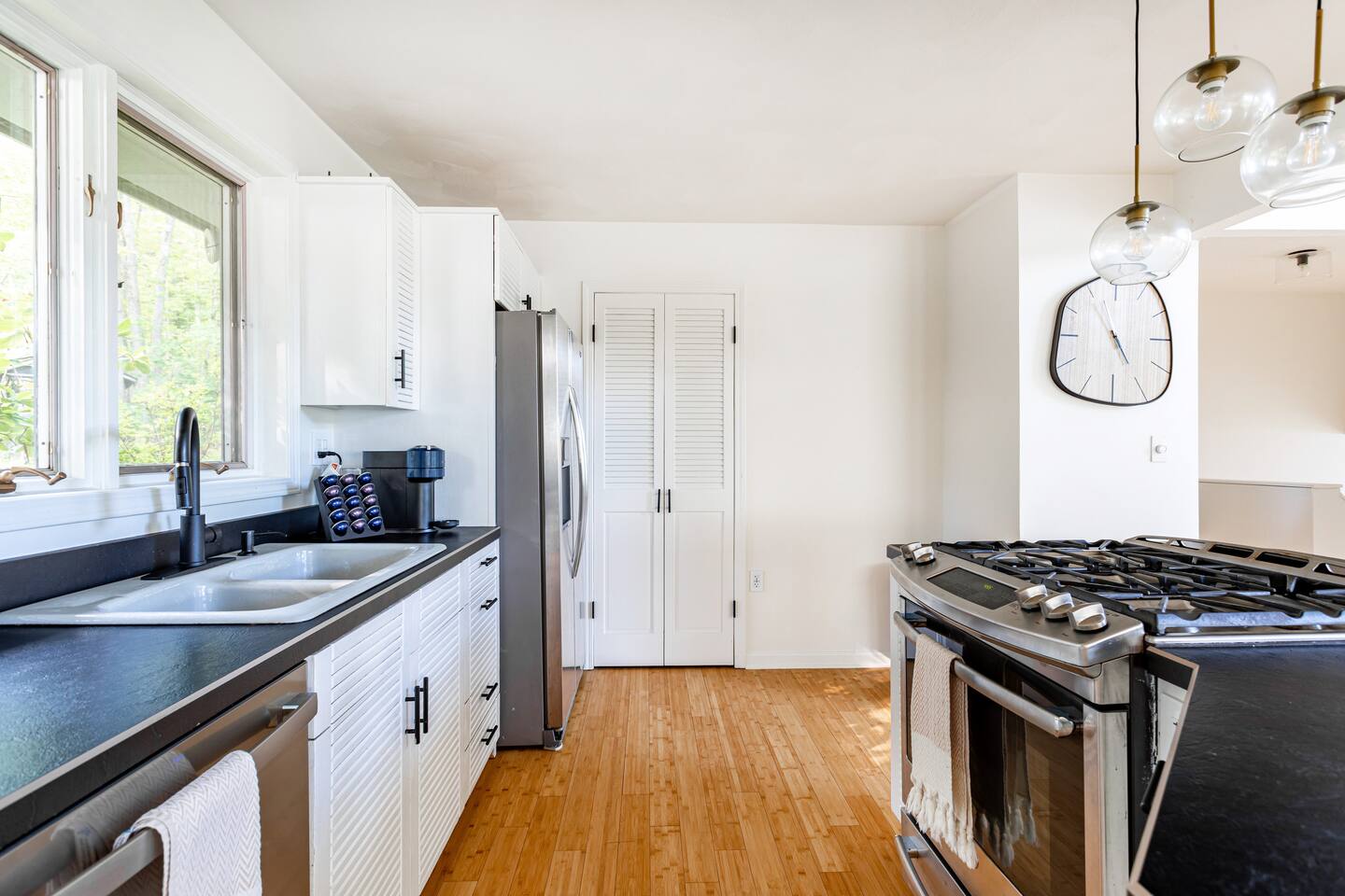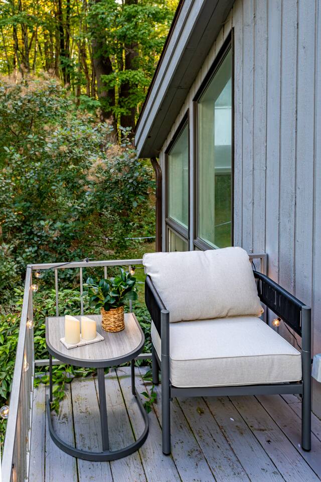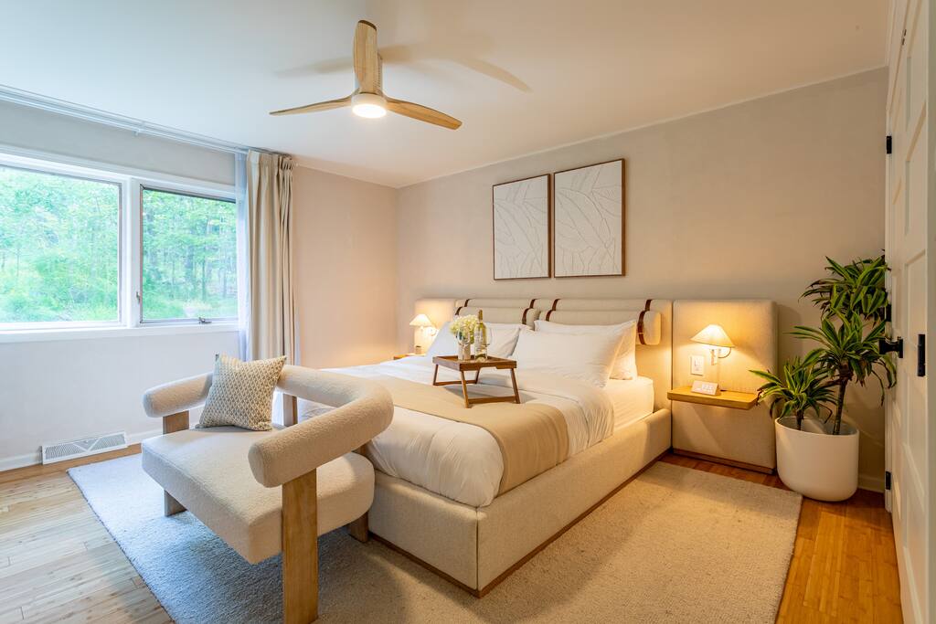 Ideal for couples and small families alike, this peaceful home offers a relaxing vacation experience. Unwind in the comfortable living spaces, surrounded by nature's splendor. The property features expansive decks with gorgeous views, perfect for nature lovers. The circular driveway and serene surroundings create a sense of calm, while the expansive floor-to-ceiling windows offer breathtaking views of the surrounding landscape. This resort-style home boasts: - Beautiful, high-end new furniture throughout - A fully stocked kitchen with updated appliances - Cathedral ceilings and large windows - Beautiful, solid bamboo hardwood flooring - 3 newly remodeled bathrooms - New high-quality modern lighting throughout - Recessed lighting and propane grill on the deck - Patio featuring a propane fire pit for cozy nighttime - Broad grassy yards perfect for outdoor activities - 3 bedrooms, including a master suite with a king bed, an ensuite bathroom, and a jacuzzi hot tub - 2 additional bedrooms with queen beds - Fine cotton linens and luxurious amenities throughout Experience the Ultimate in Relaxation! Enjoy breathtaking sunrise views from the East-facing front balcony, sunset views from the back deck, and relax in the spa-quality jetted tub. Take a dip in the indoor heated pool that is open year-round! Book your stay today and experience the ultimate in relaxation and tranquility.